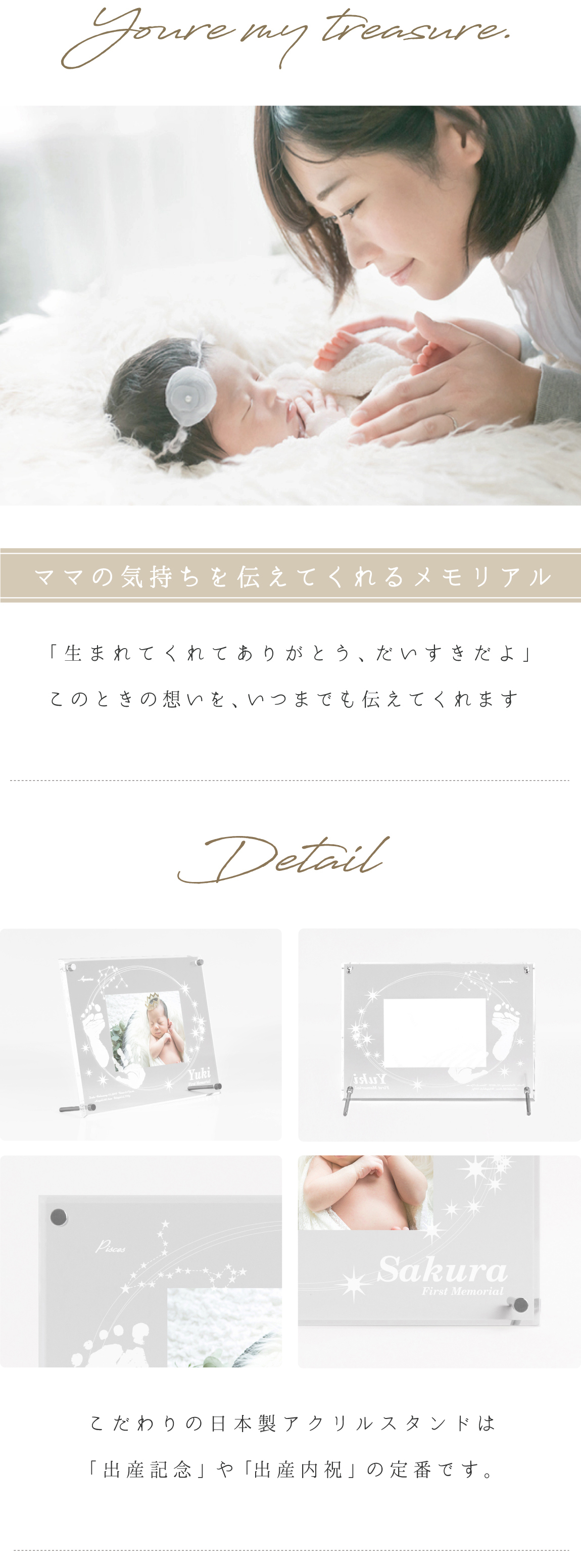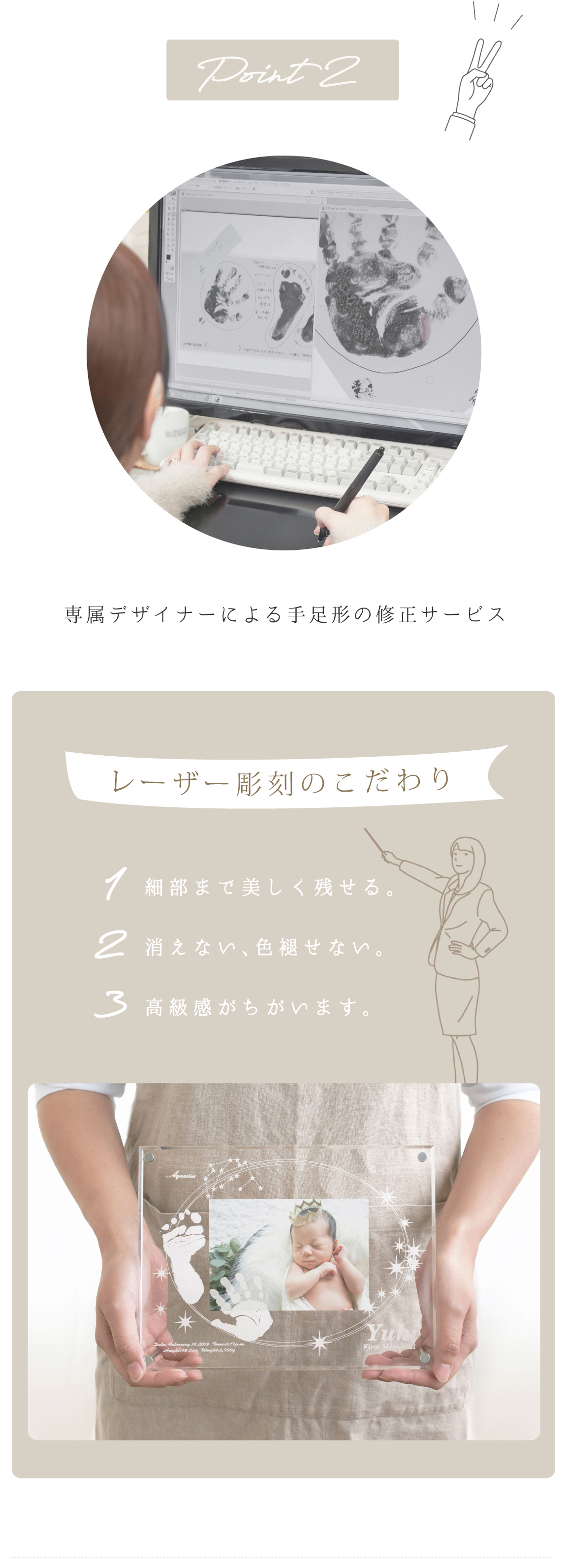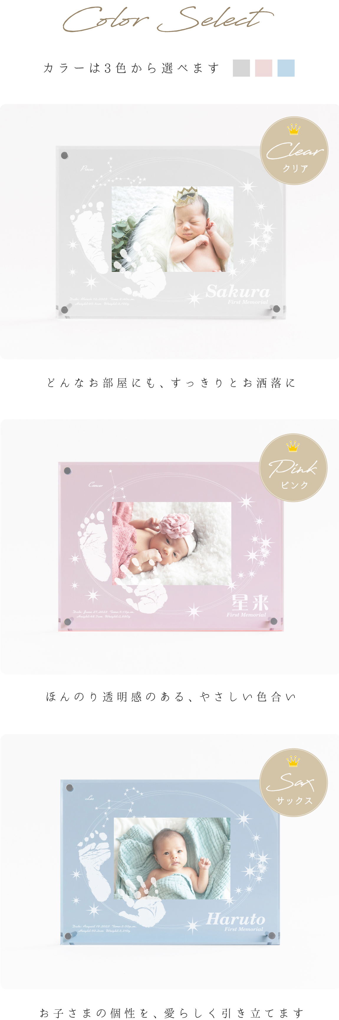 ちいさな「おてて」と「あんよ」を入れて、愛おしい瞬間を一生の宝物に。シンプルで心温まるデザインは、年齢・性別を問わず多くの方に愛されます。