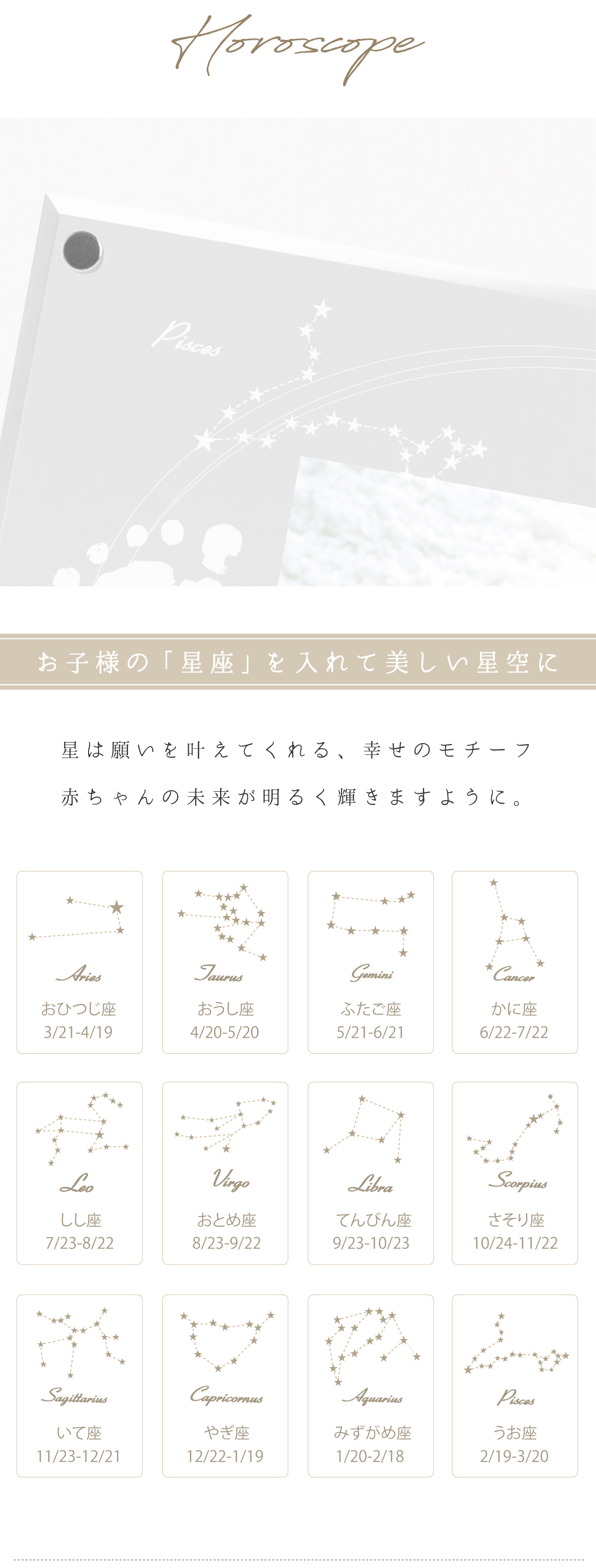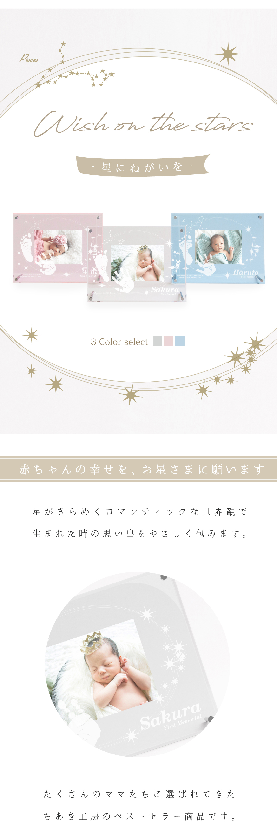 星がきらめくロマンティックな世界観で生まれた時の思い出をやさしく包みます。