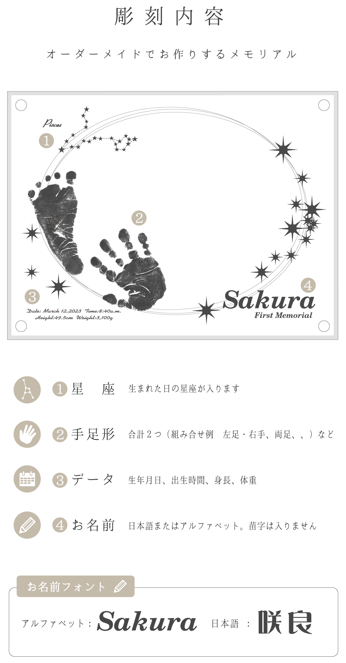 両手足形のうちいずれか2つ/お名前/お誕生日/出生時刻/身長/体重/星座