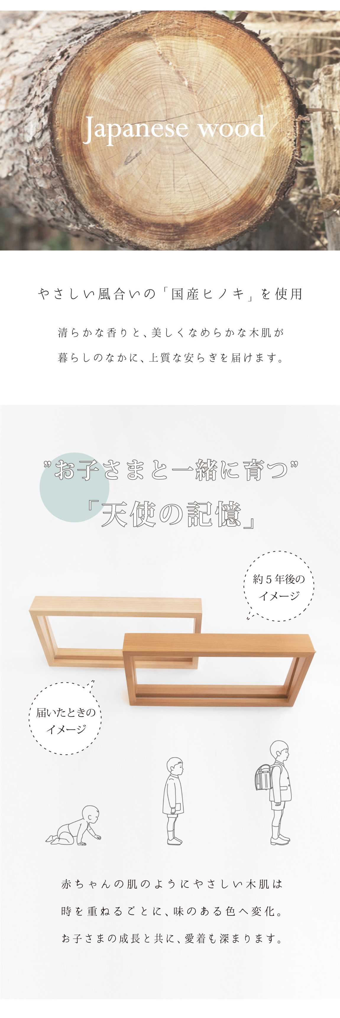 国産ヒノキで仕立てた、やさしい温もりのメモリアル。当店人気No.1のこだわり「日本製フォトフレーム」です。企画からデザインまで一貫して監修し、天使のような上品でふんわりとした雰囲気を作り出すために、おしゃれな国産「擦りガラス」を合わせました。