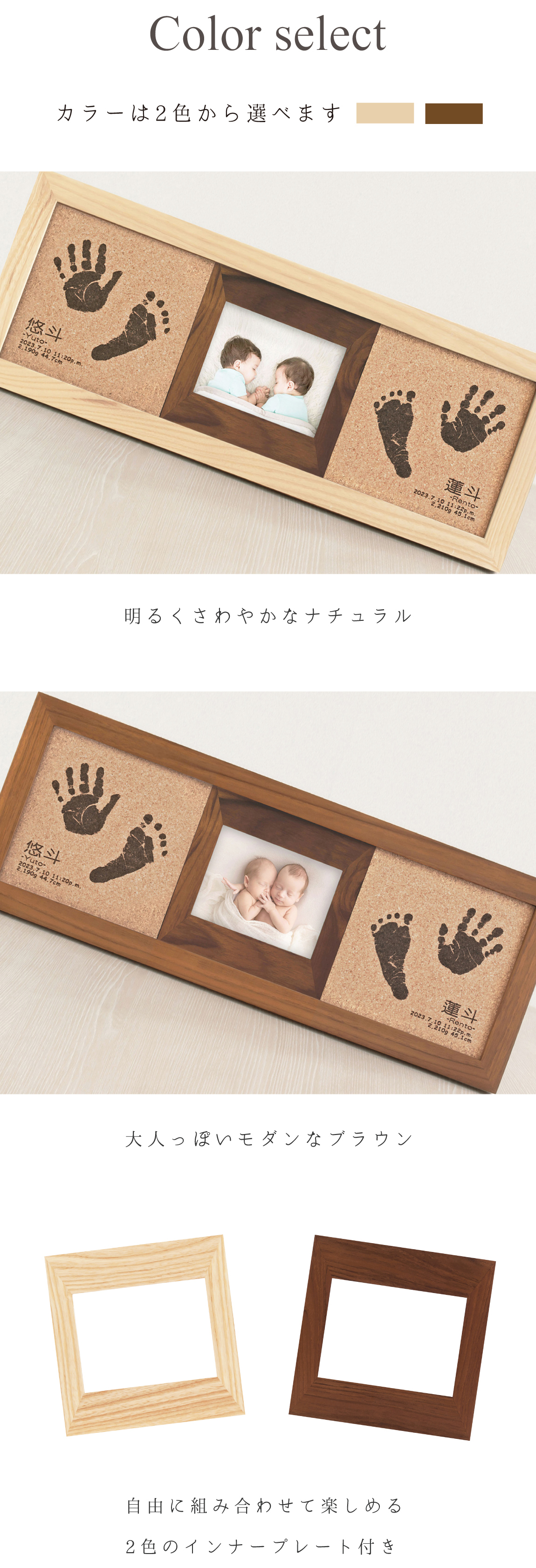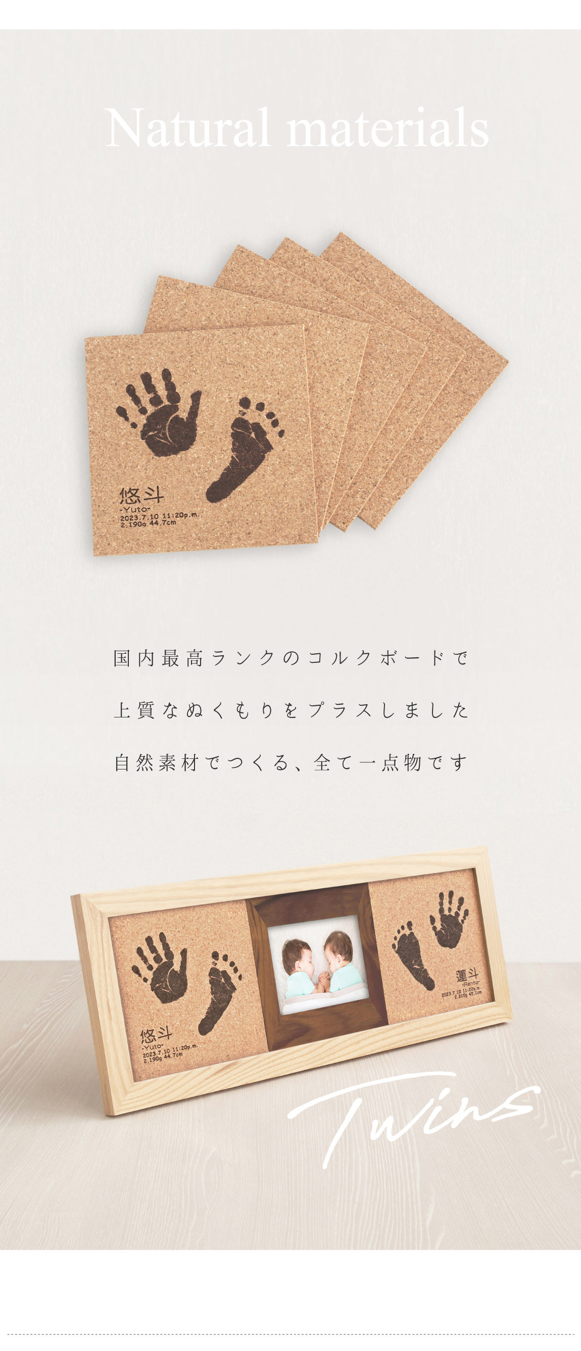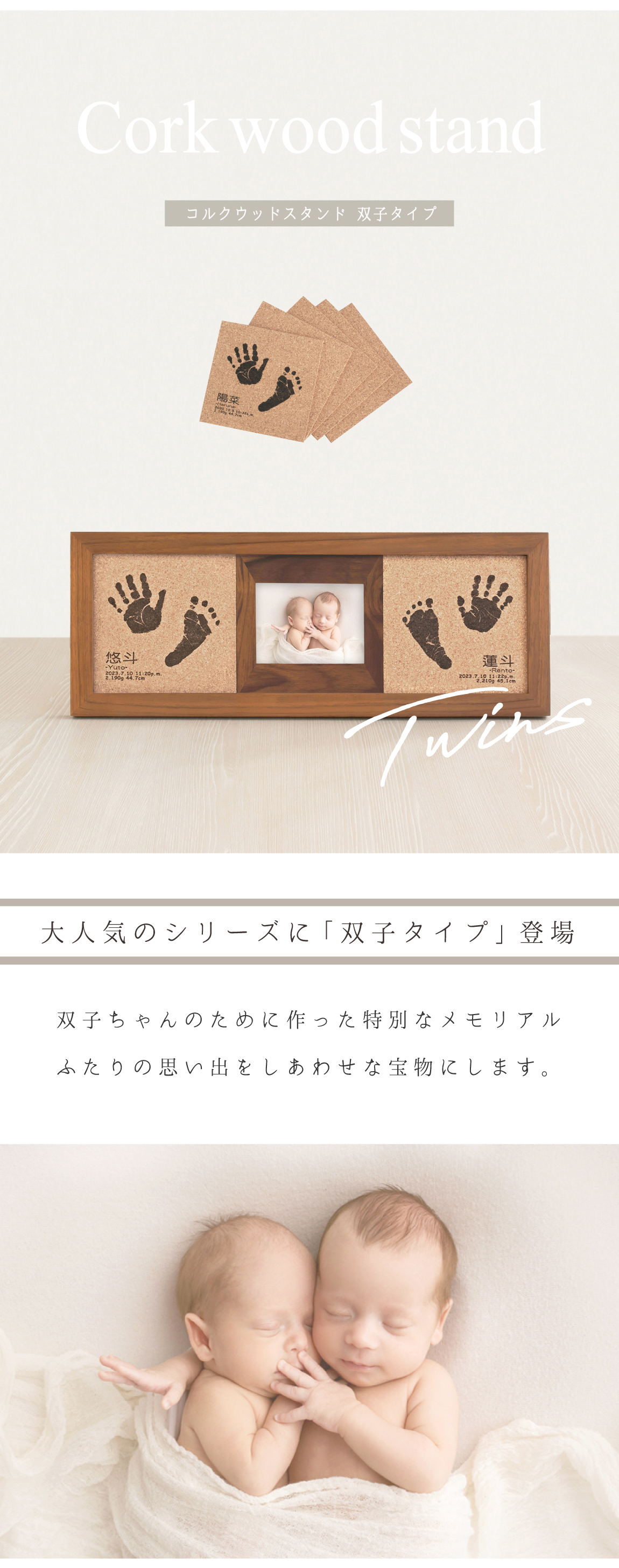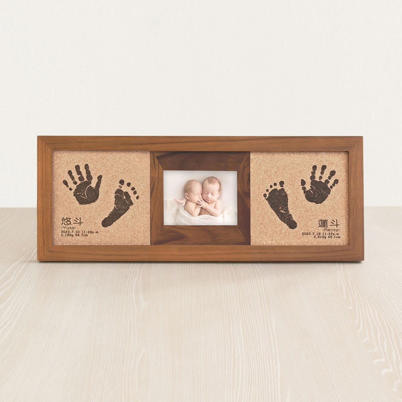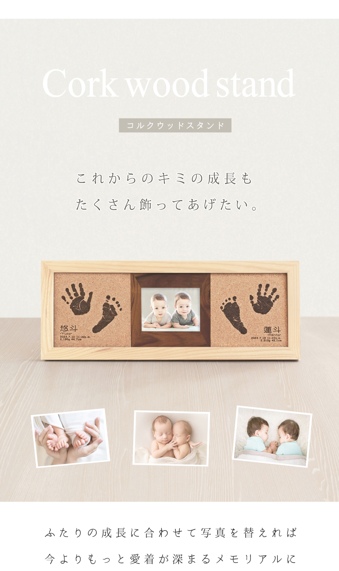 「天然木×コルク」の自然素材を組み合わせたデザインは、当店の人気定番シリーズ。双子ちゃんの思い出を、仲良くひとつにまとめた、特別なメモリアルフレームです。おふたりの可愛い笑顔を入れて、これからの健やかな成長を見守ってください。