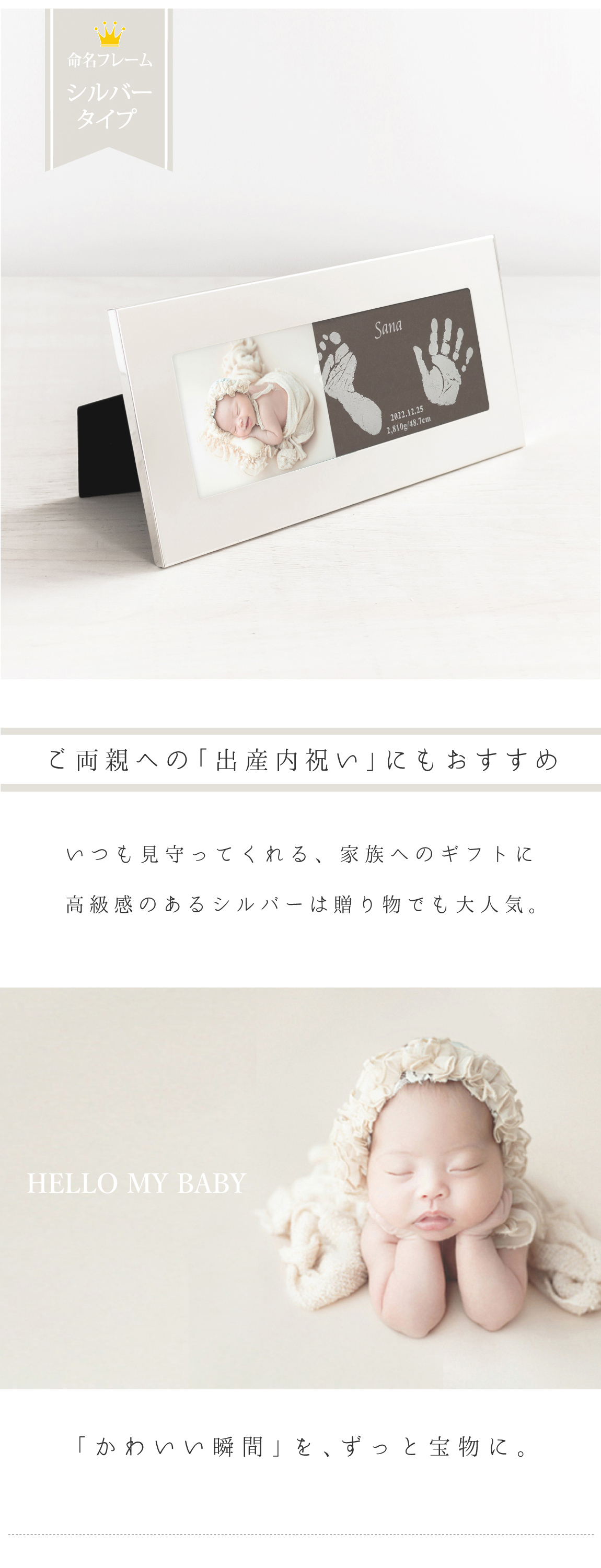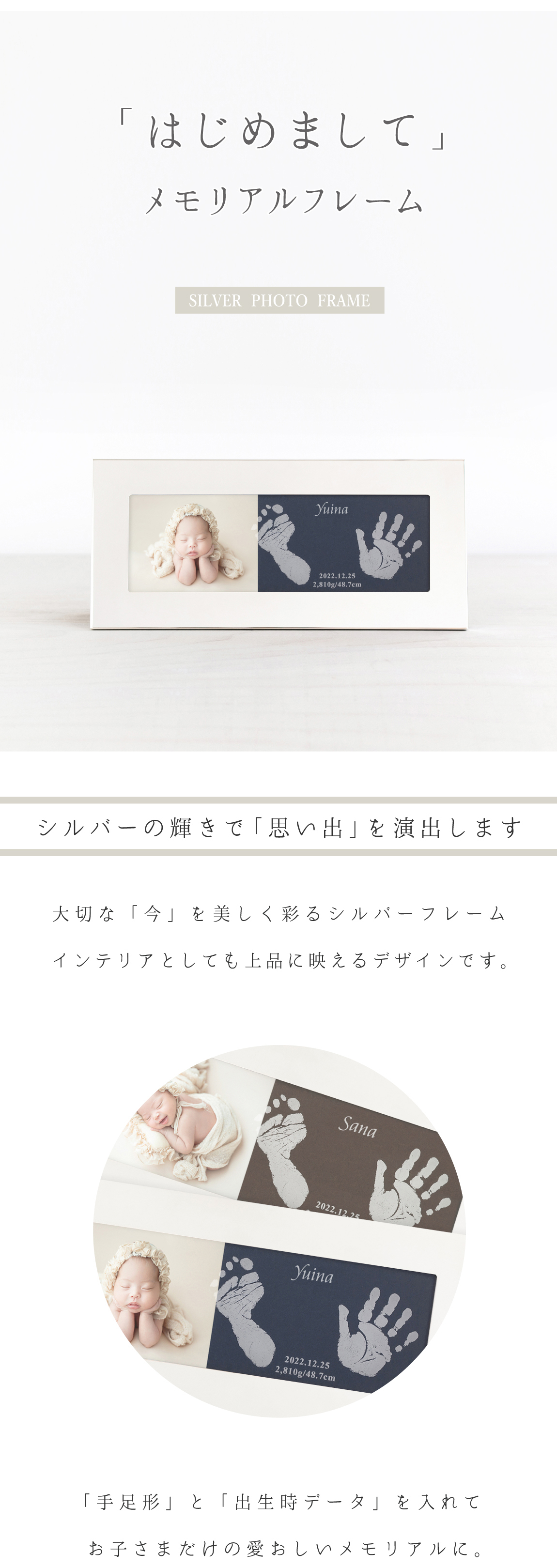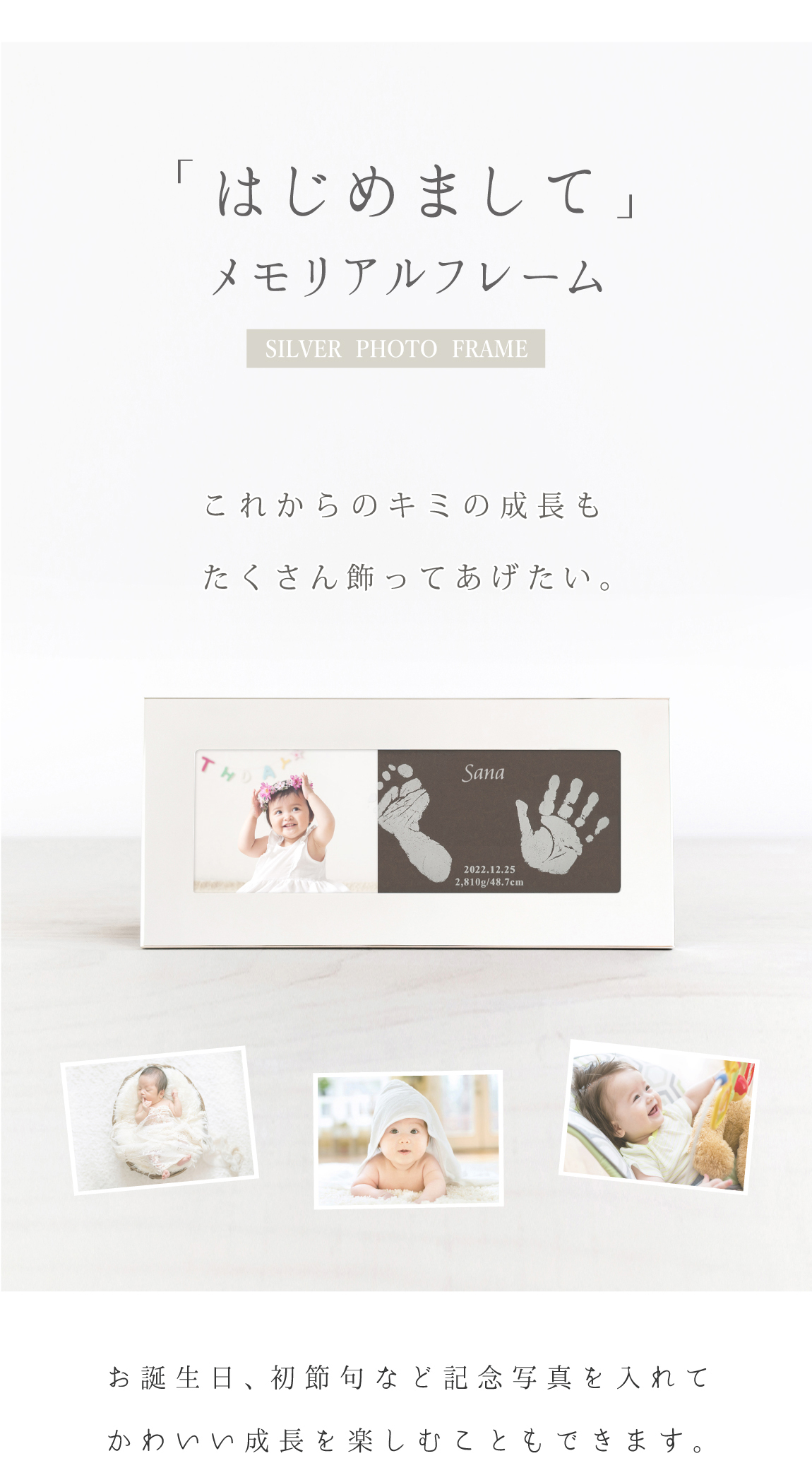 シルバーのやさしい輝きが、記念写真を上品に引き立てるメモリアルフレーム。高級感があり贈り物としても人気があります。かわいい思い出を美しく彩ってくれるので、アニバーサリーギフトとしておすすめです。