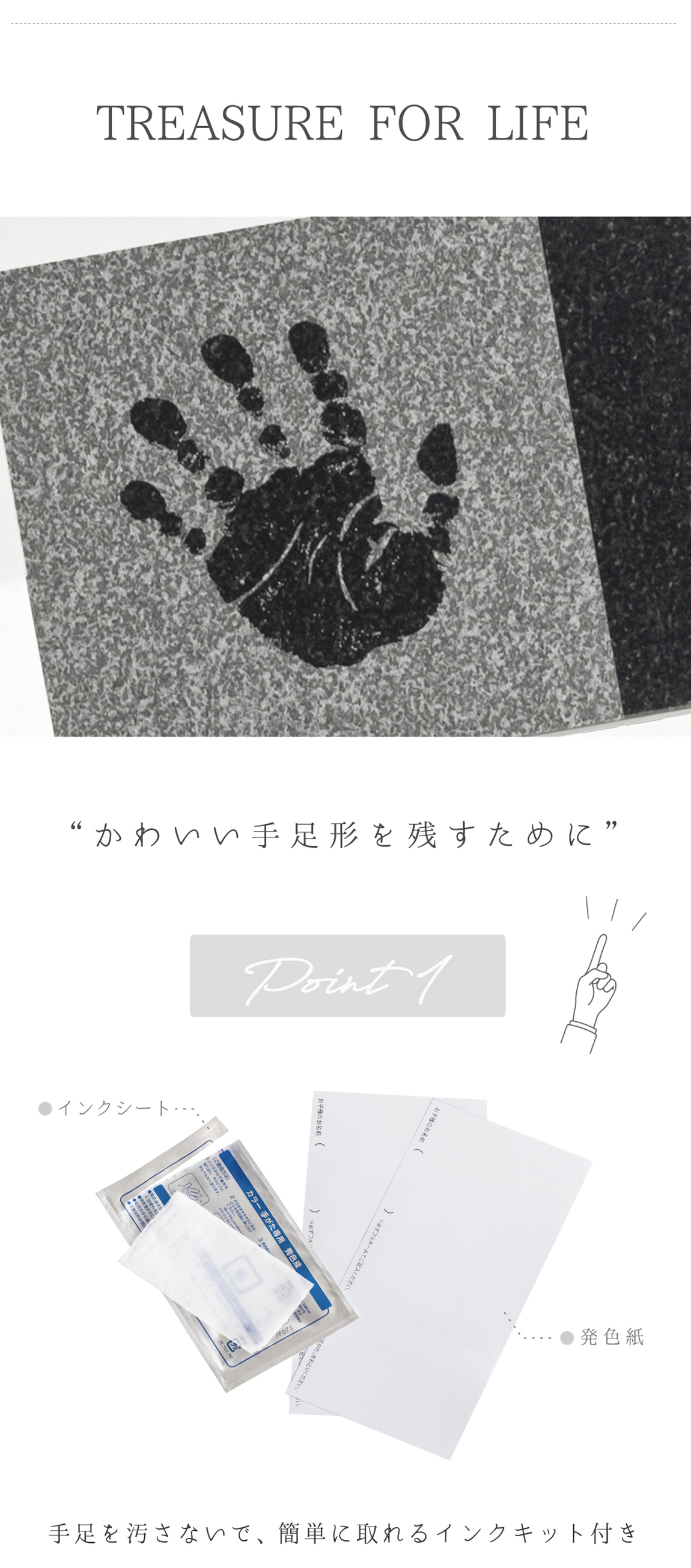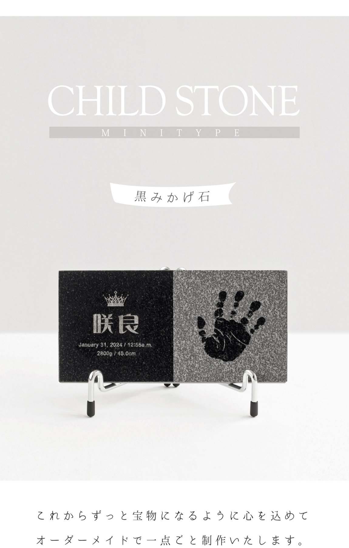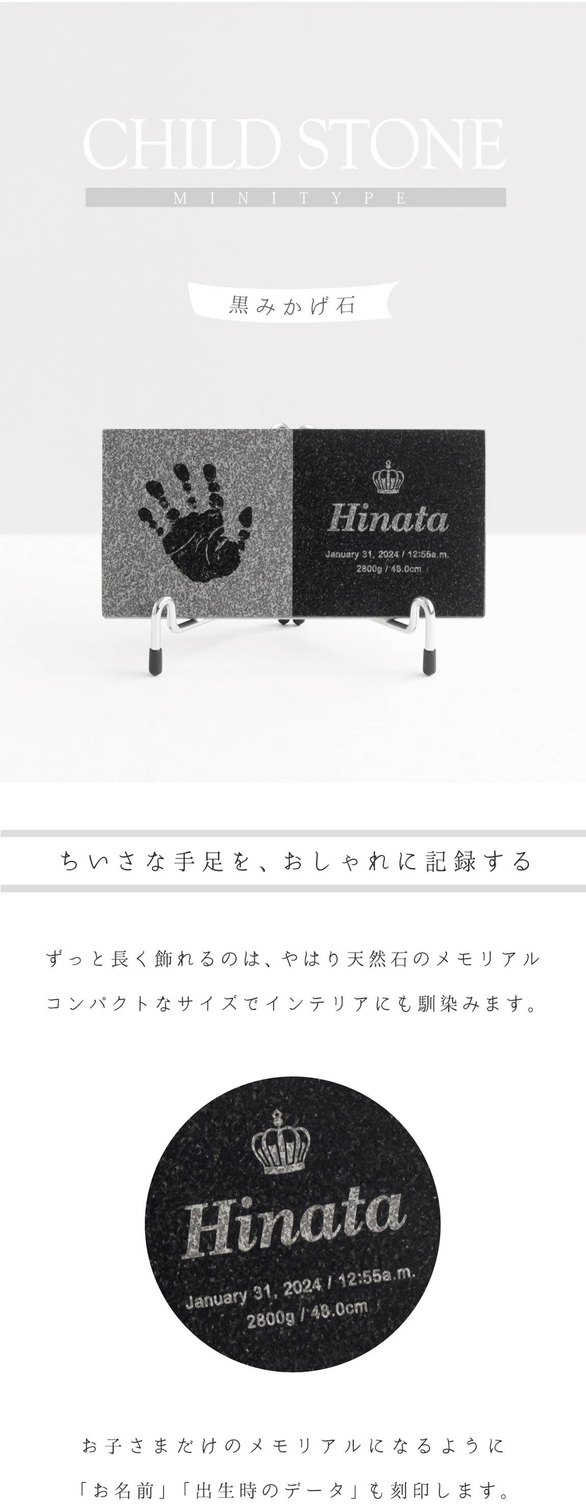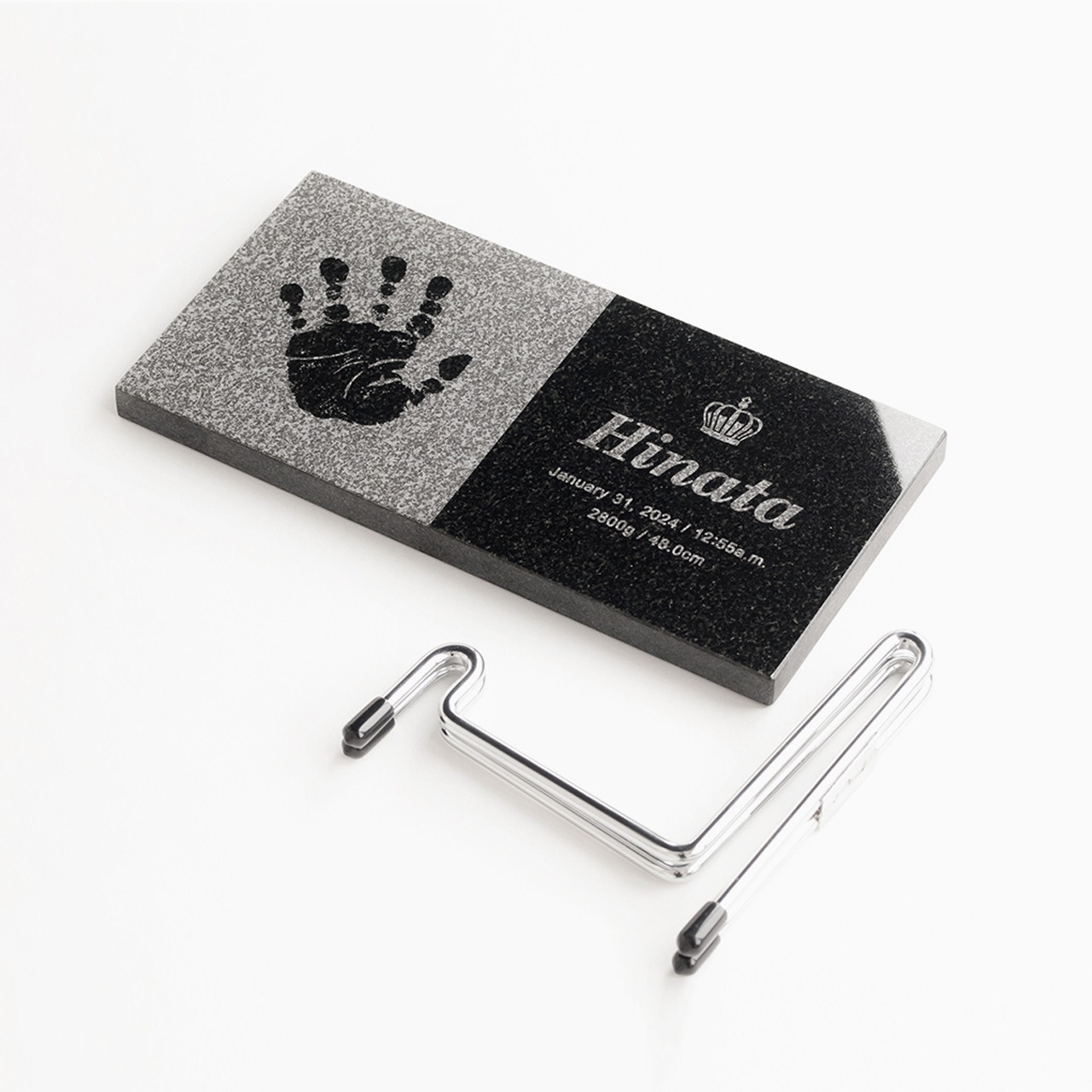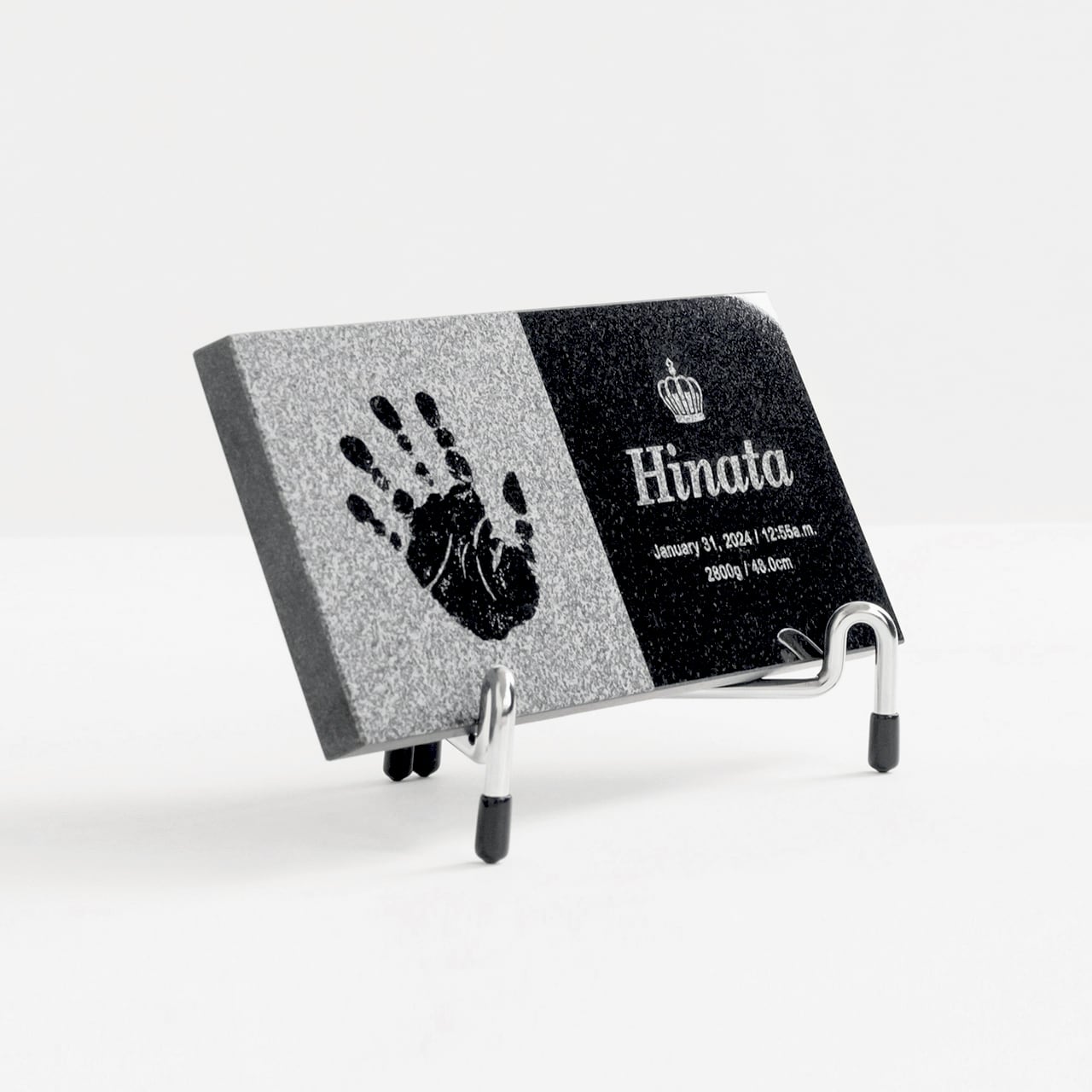 ずっと残せる素材といえば、やはり天然石。自然のチカラを感じさせ、重厚で存在感も抜群です。こちらは「手形」のみを残せるコンパクトタイプで、大切なギフトにもおすすめ。アートオブジェのように美しく飾っていただけます。
