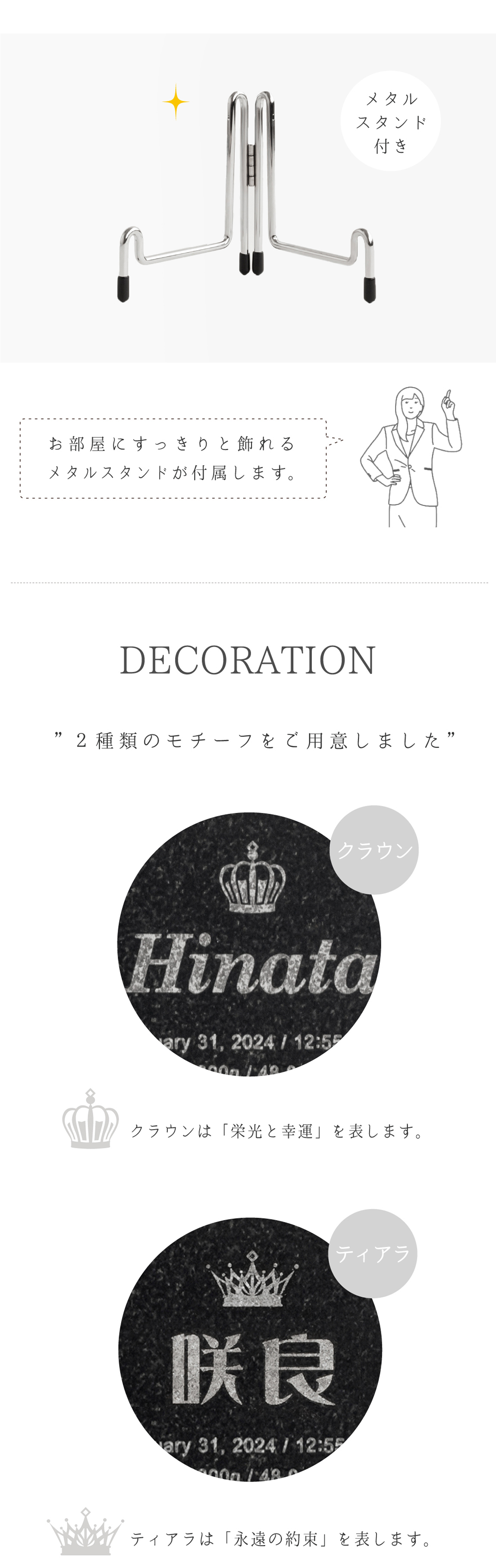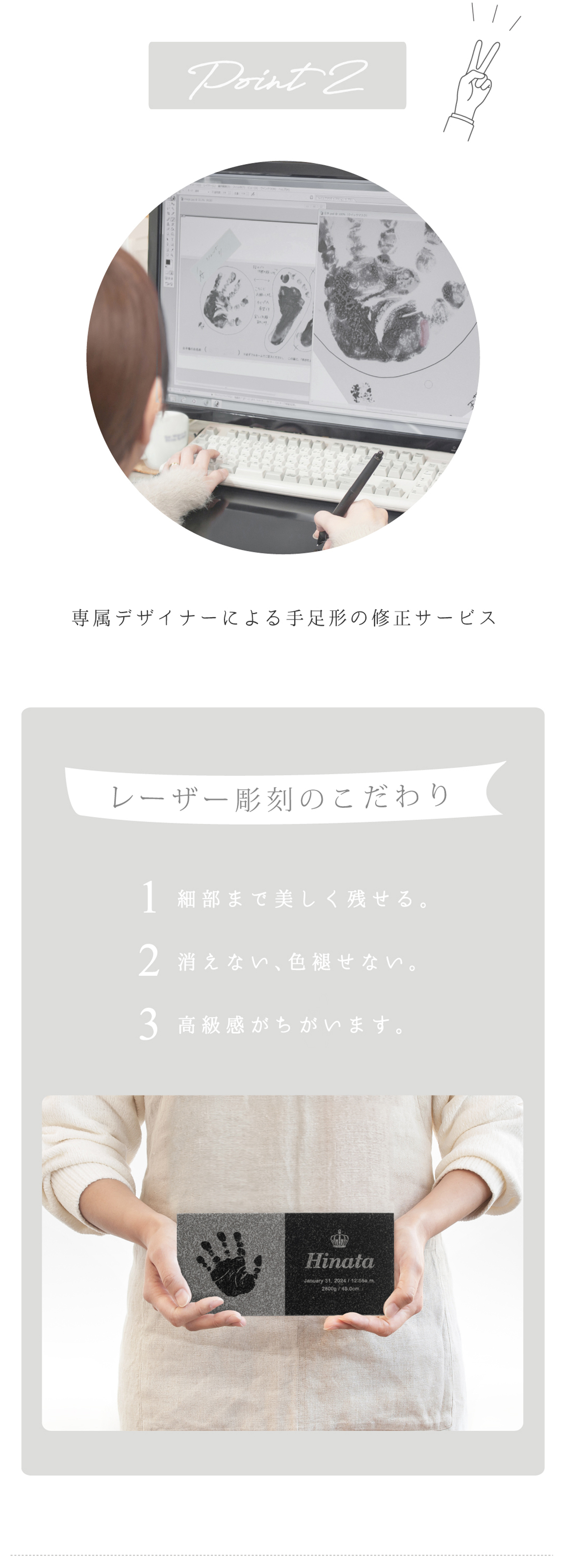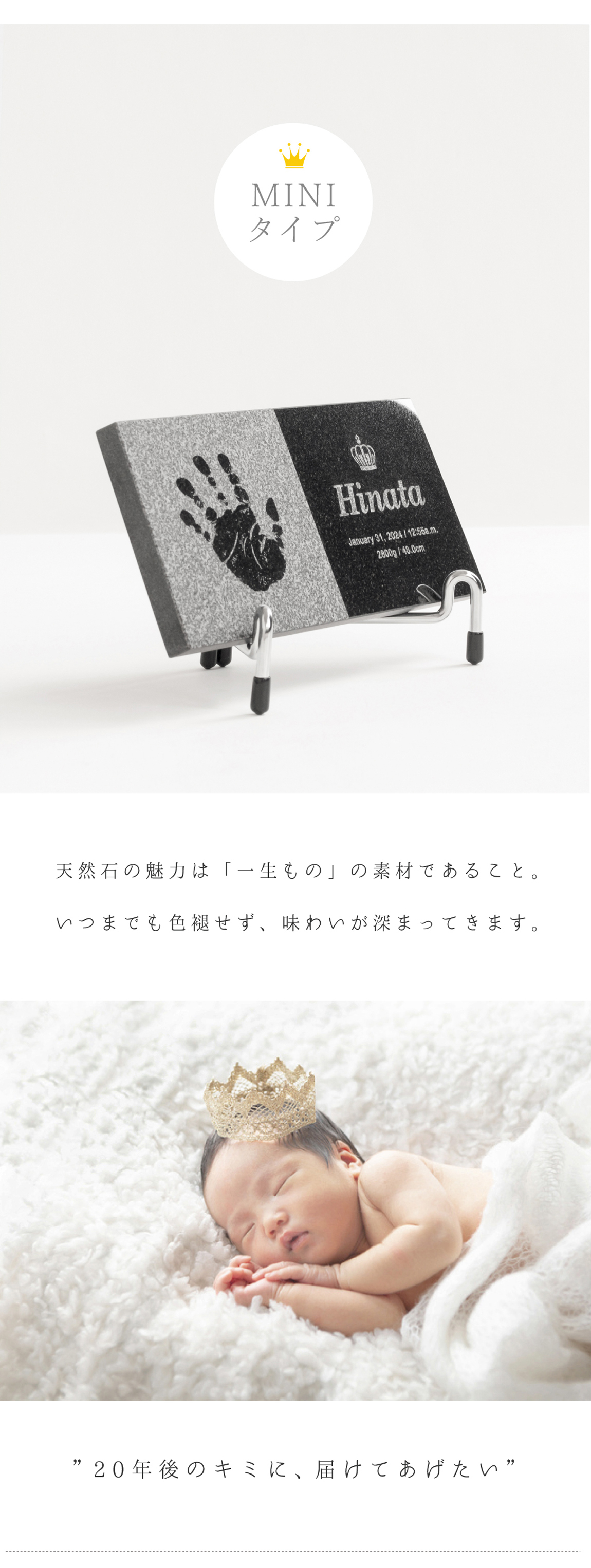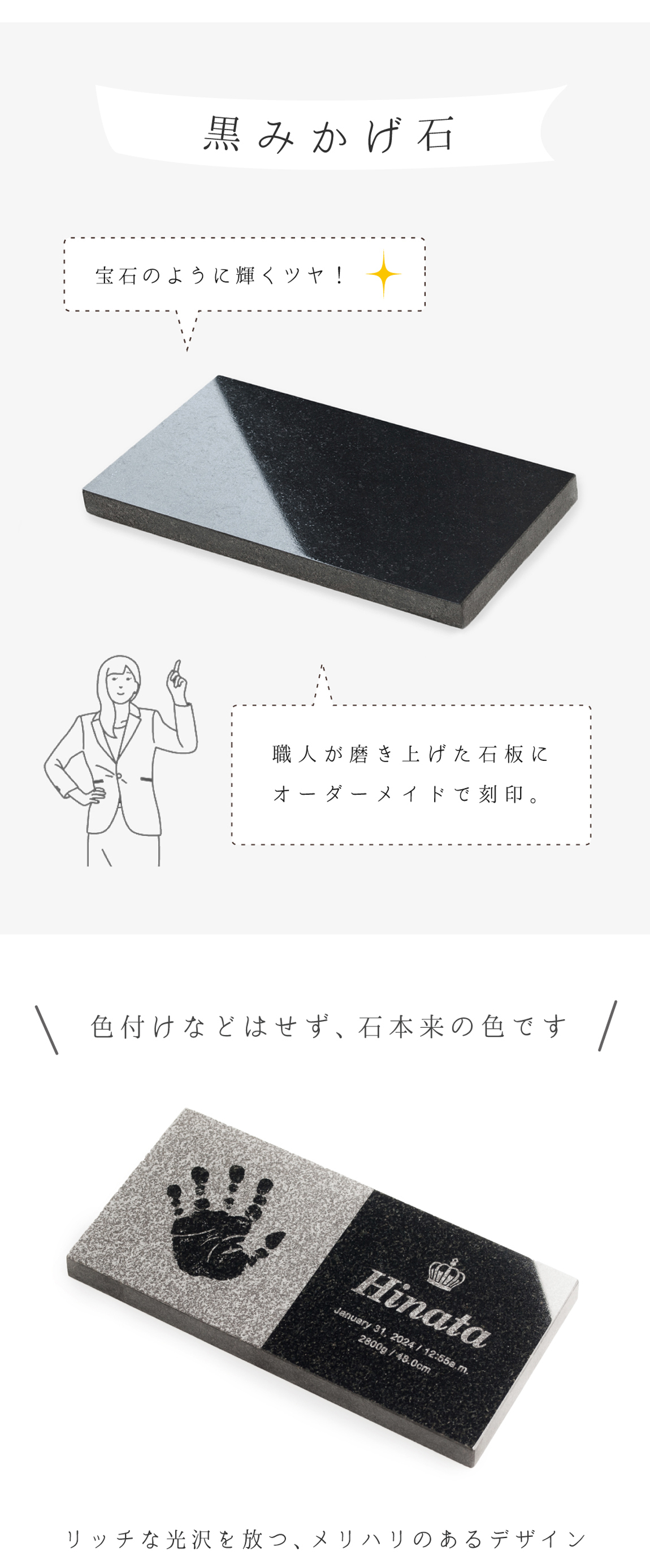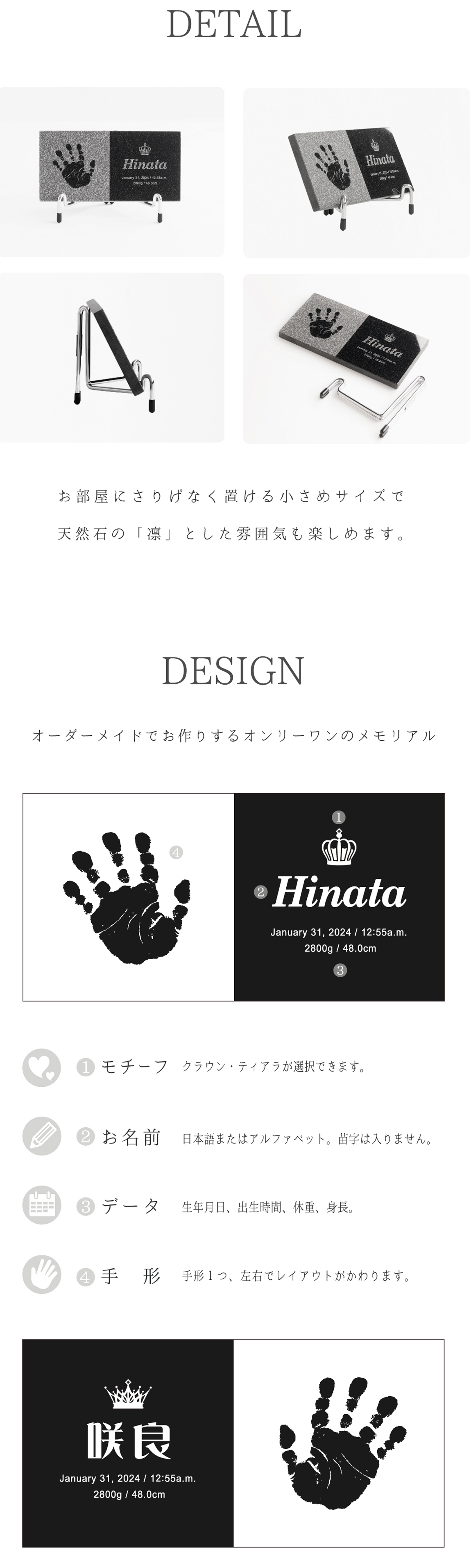 ずっと残せる素材といえば、やはり天然石。自然のチカラを感じさせ、重厚で存在感も抜群です。こちらは「手形」のみを残せるコンパクトタイプで、大切なギフトにもおすすめ。アートオブジェのように美しく飾っていただけます。