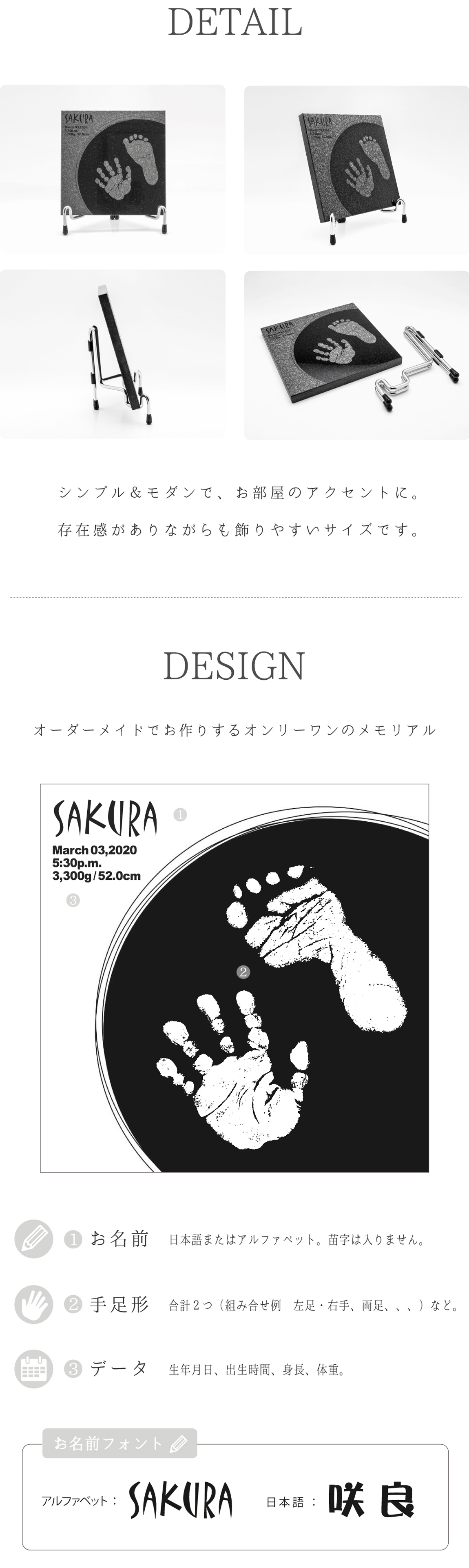 両手足形のうちいずれか2つ/お名前/お誕生日/出生時刻/身長/体重