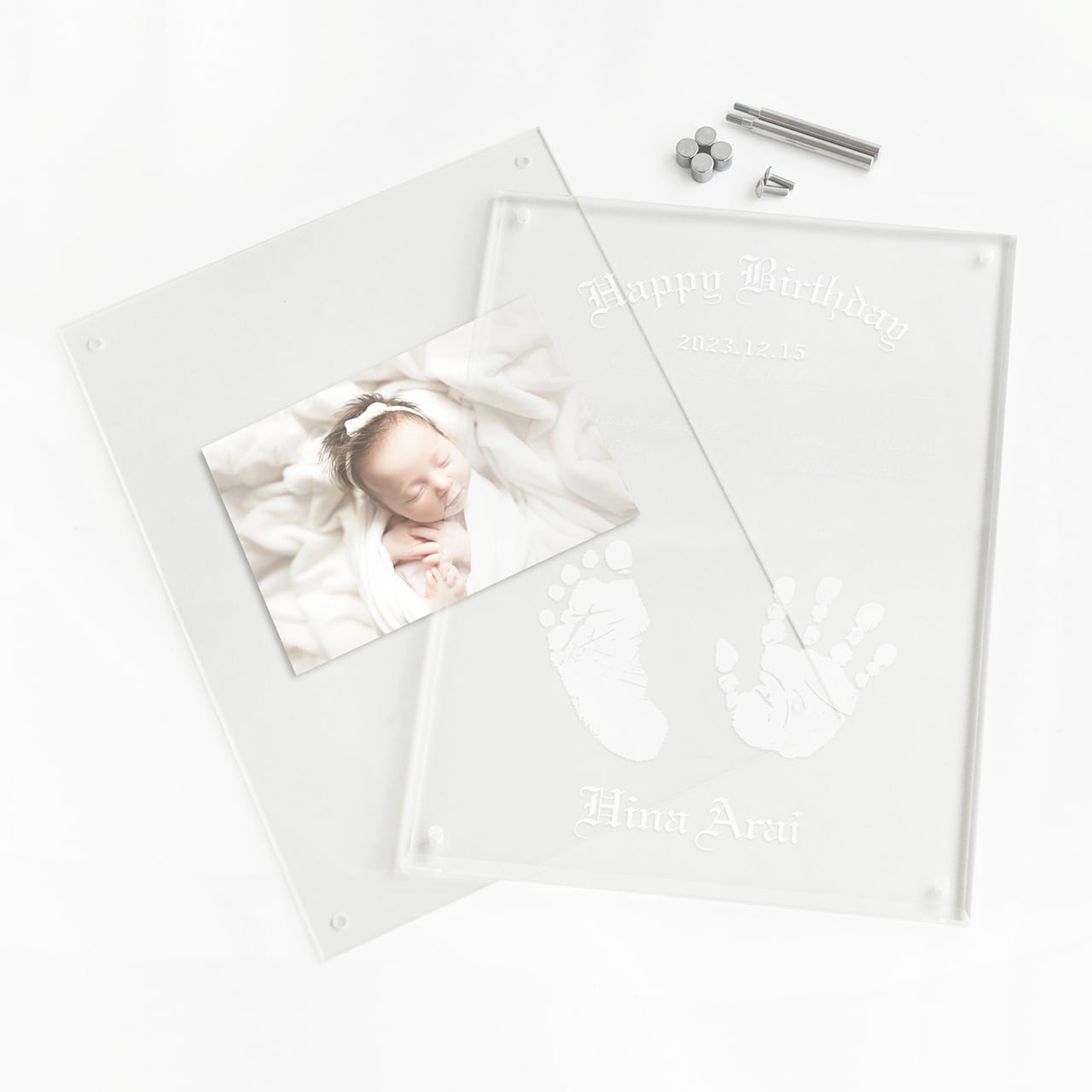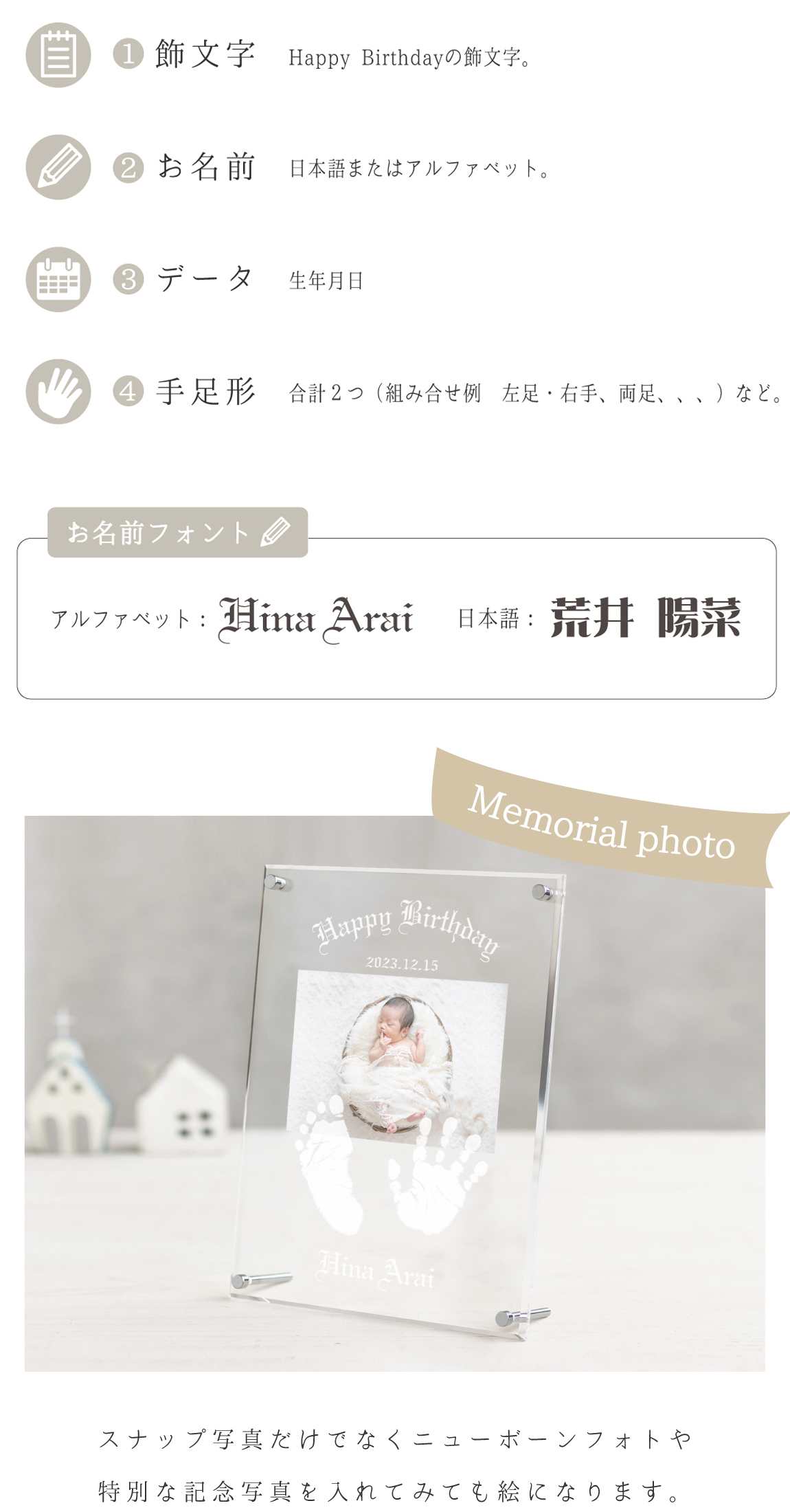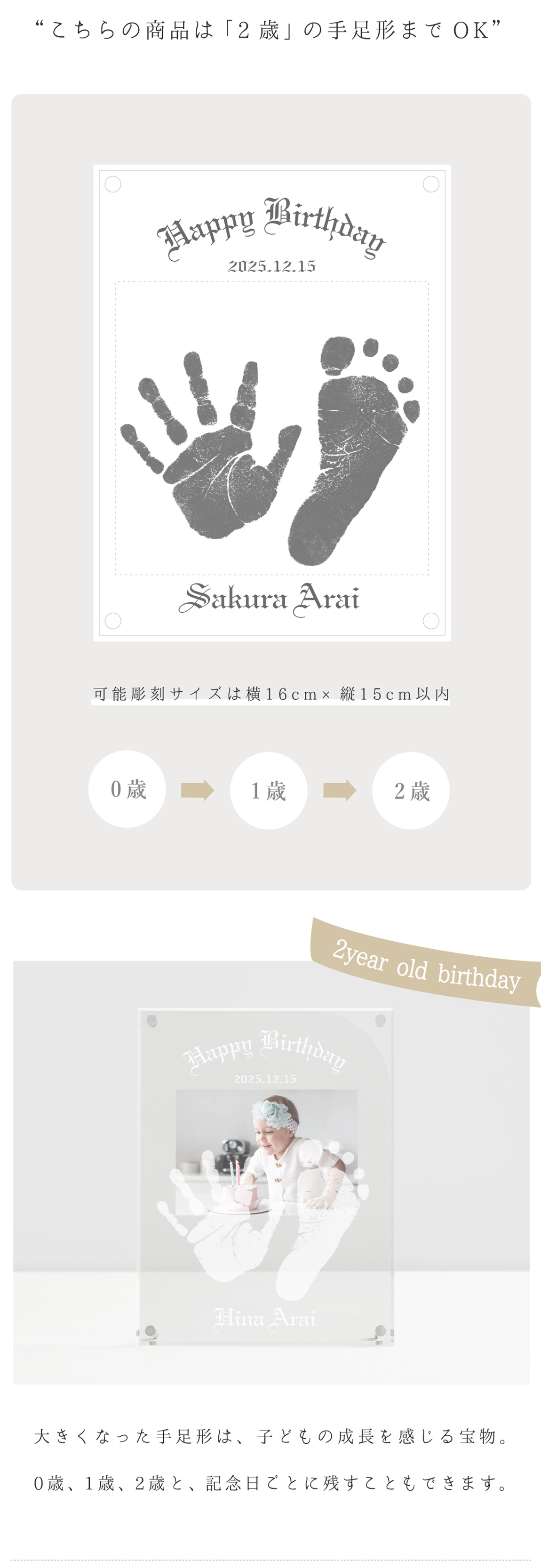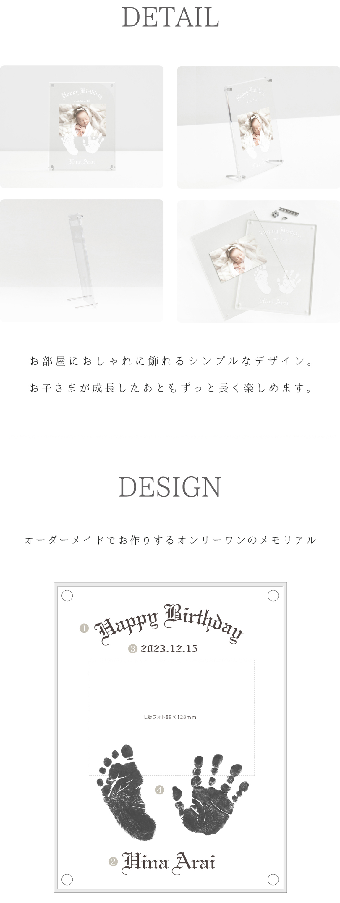 「出産記念」「お誕生日」のメモリアルとして「2歳まで」の手足形が入るデザインです。シンプルで自由なアレンジが楽しめることが魅力。当店で人気のアクリルシリーズです。