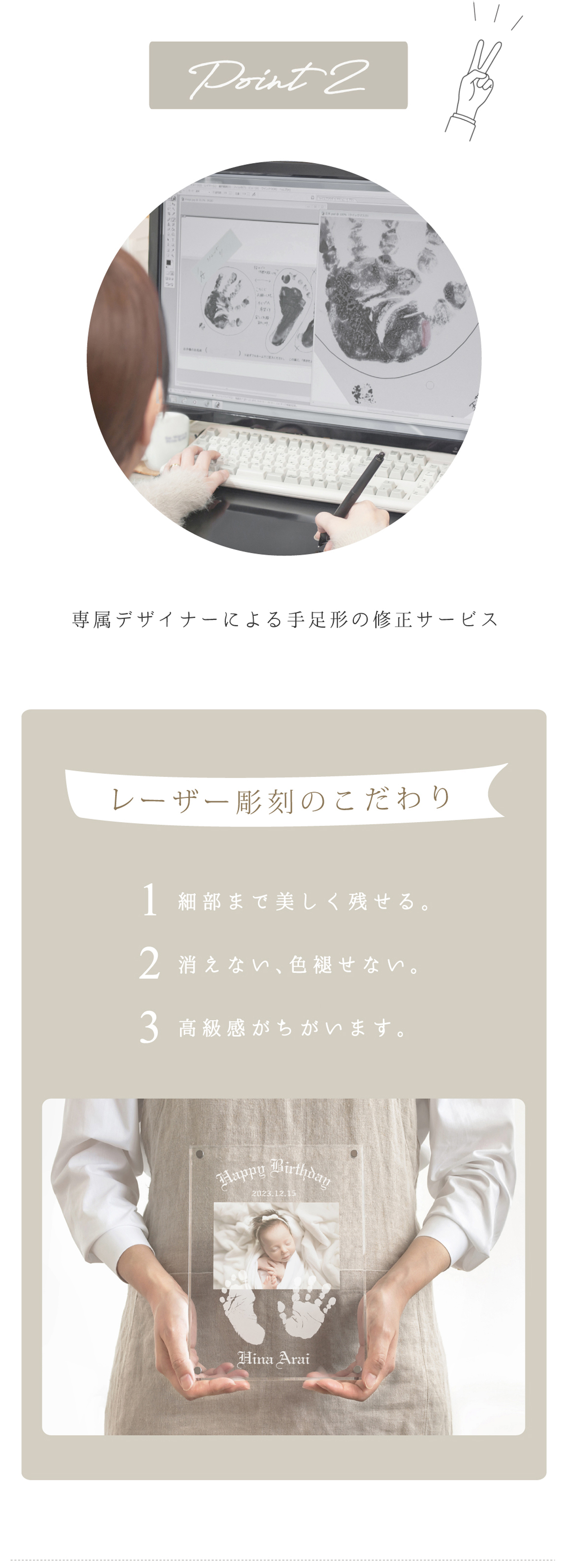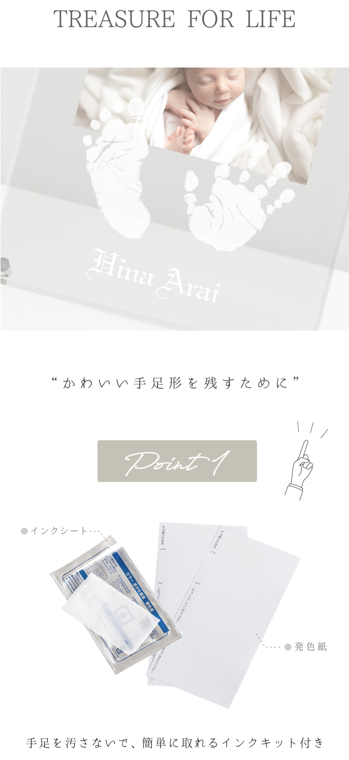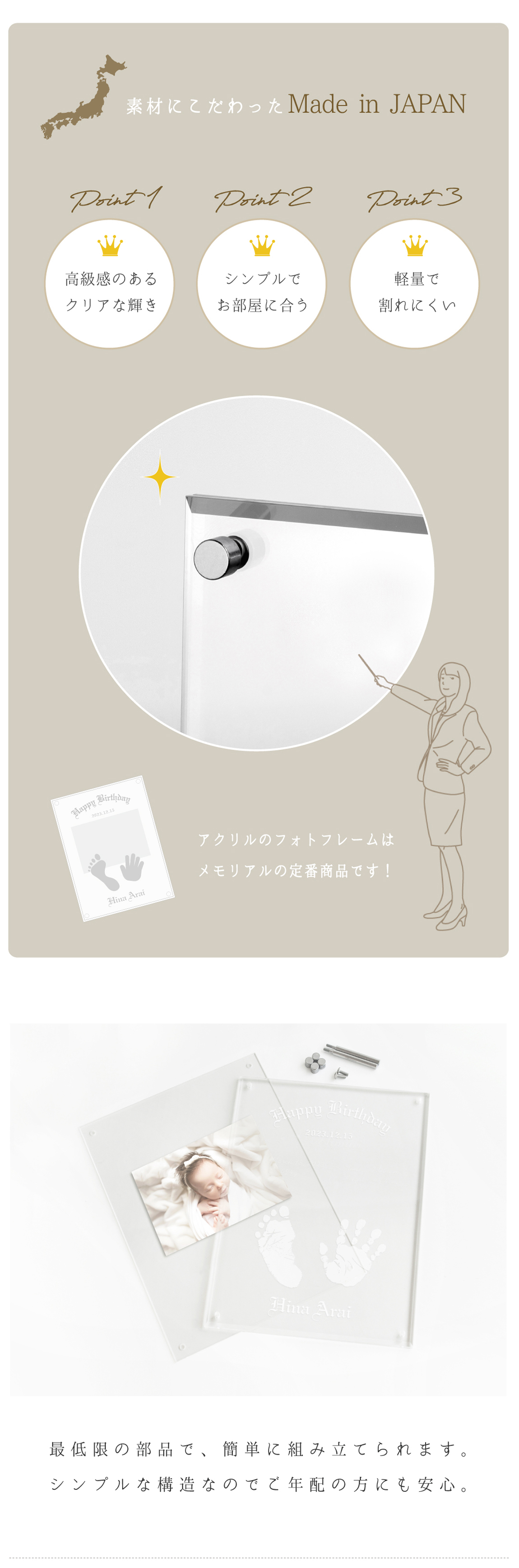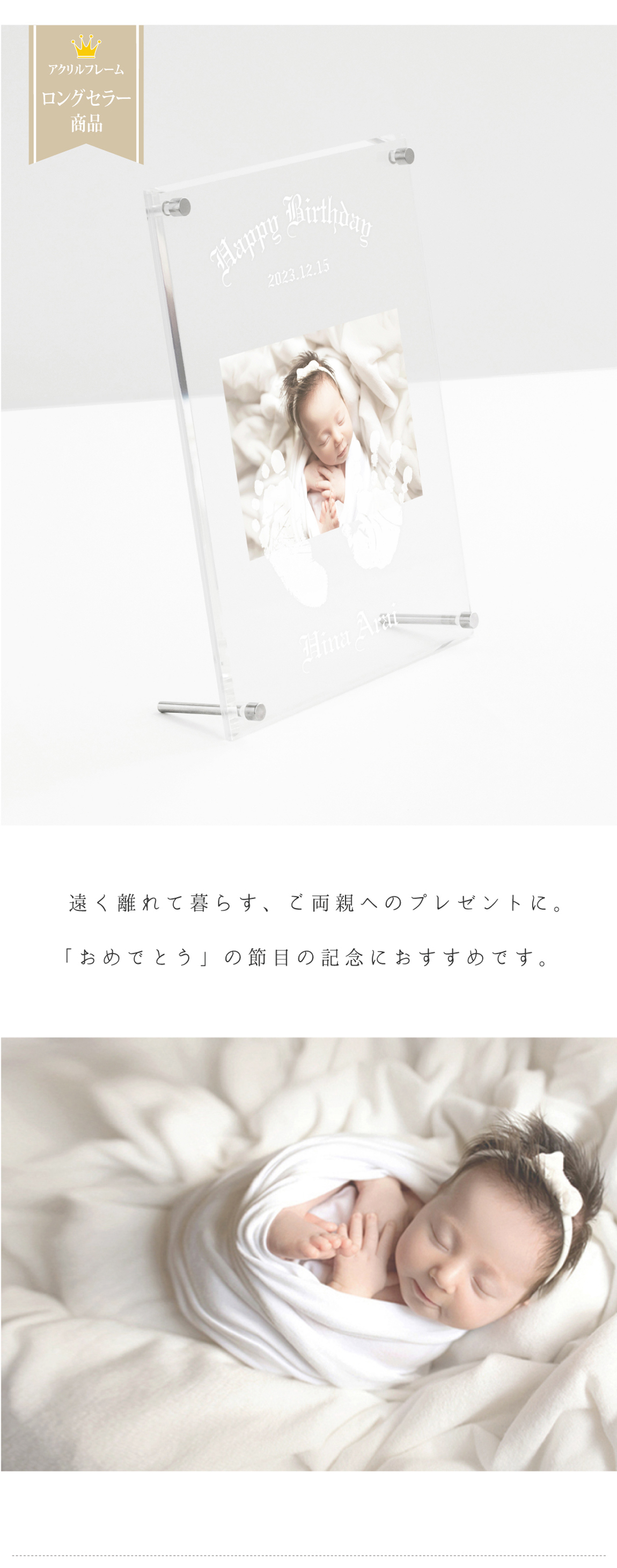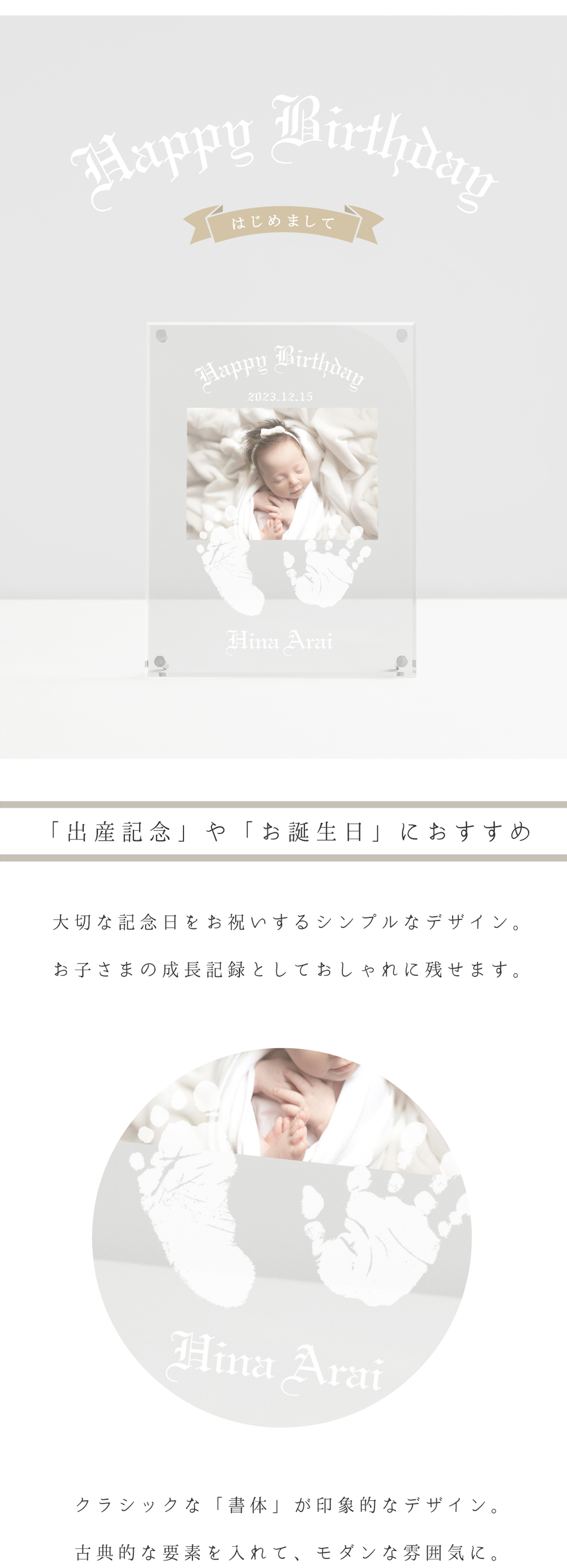 「出産記念」「お誕生日」のメモリアルとして「2歳まで」の手足形が入るデザインです。シンプルで自由なアレンジが楽しめることが魅力。当店で人気のアクリルシリーズです。