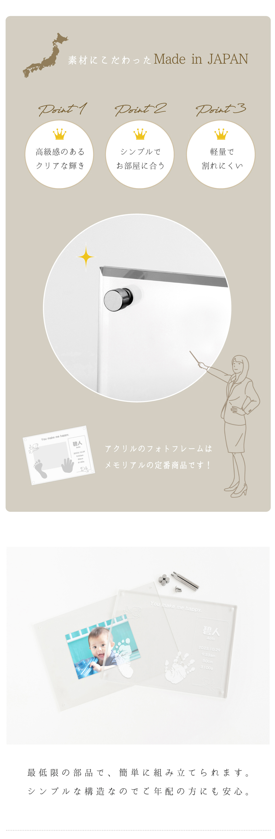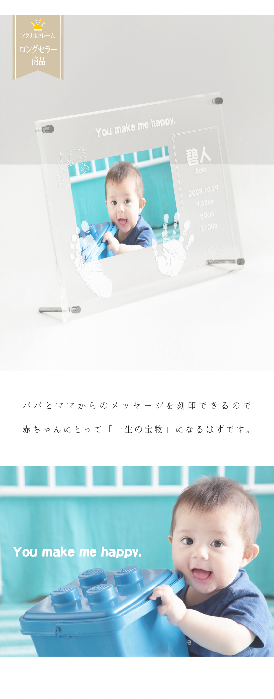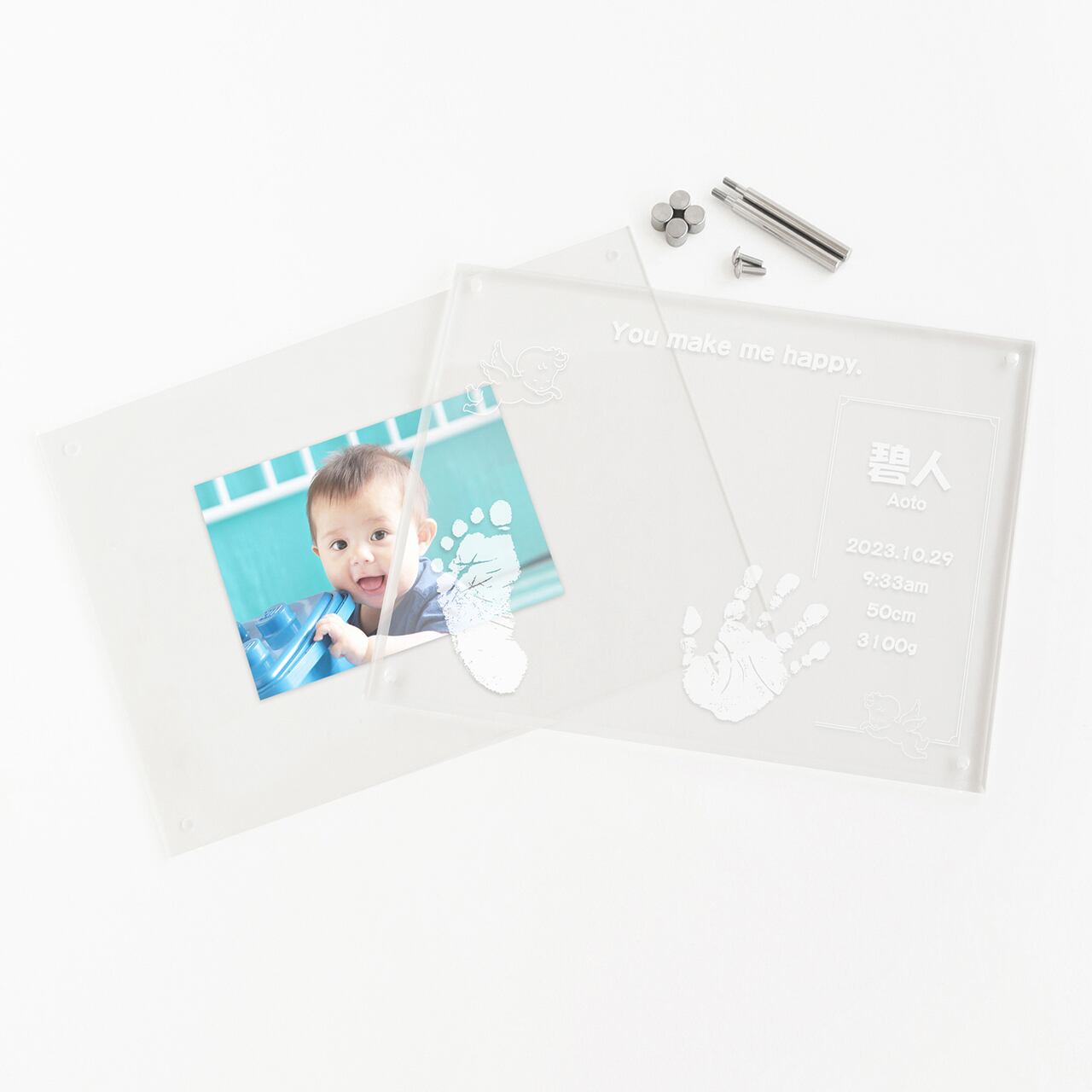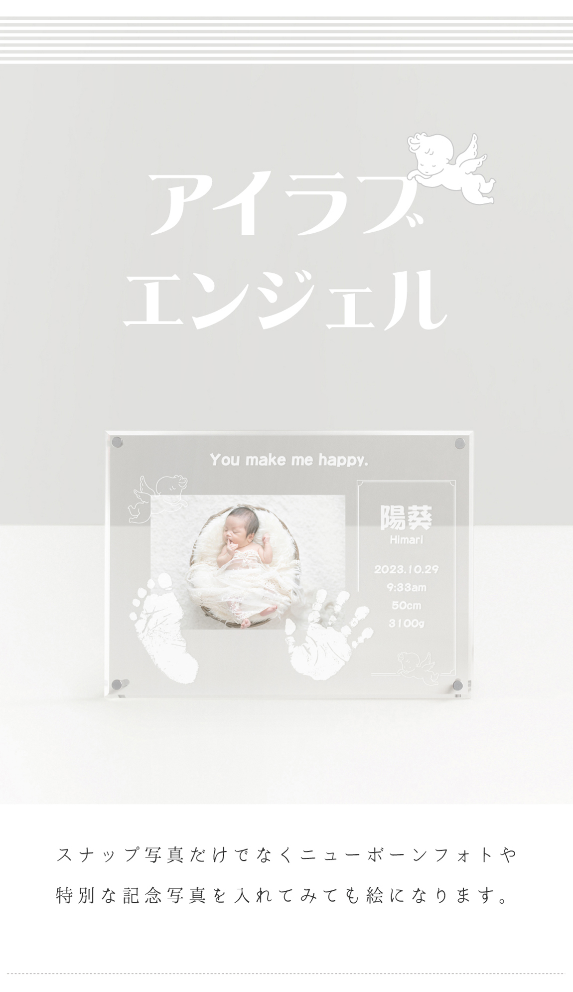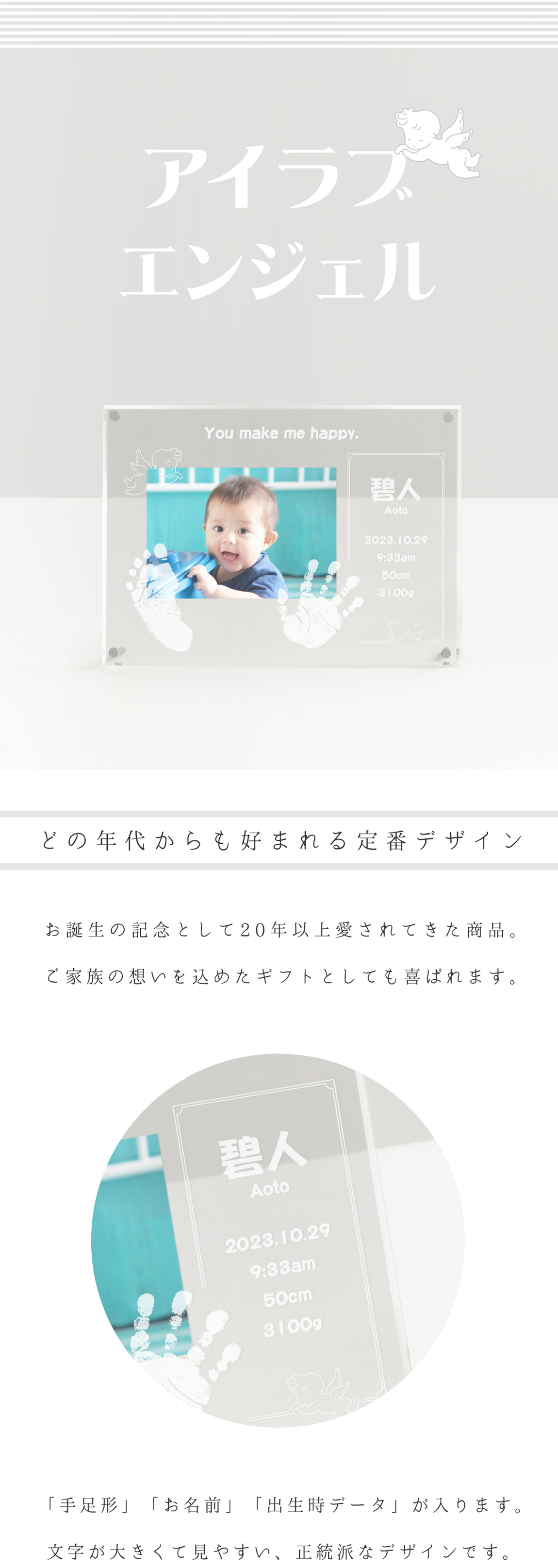 パパとママの「メッセージ」が入るデザイン。レトロでかわいい天使を添え、赤ちゃんのピュアなかわいさをぐっと引き立てます。シンプルなアクリルなので、お写真もより一層美しく映えます。