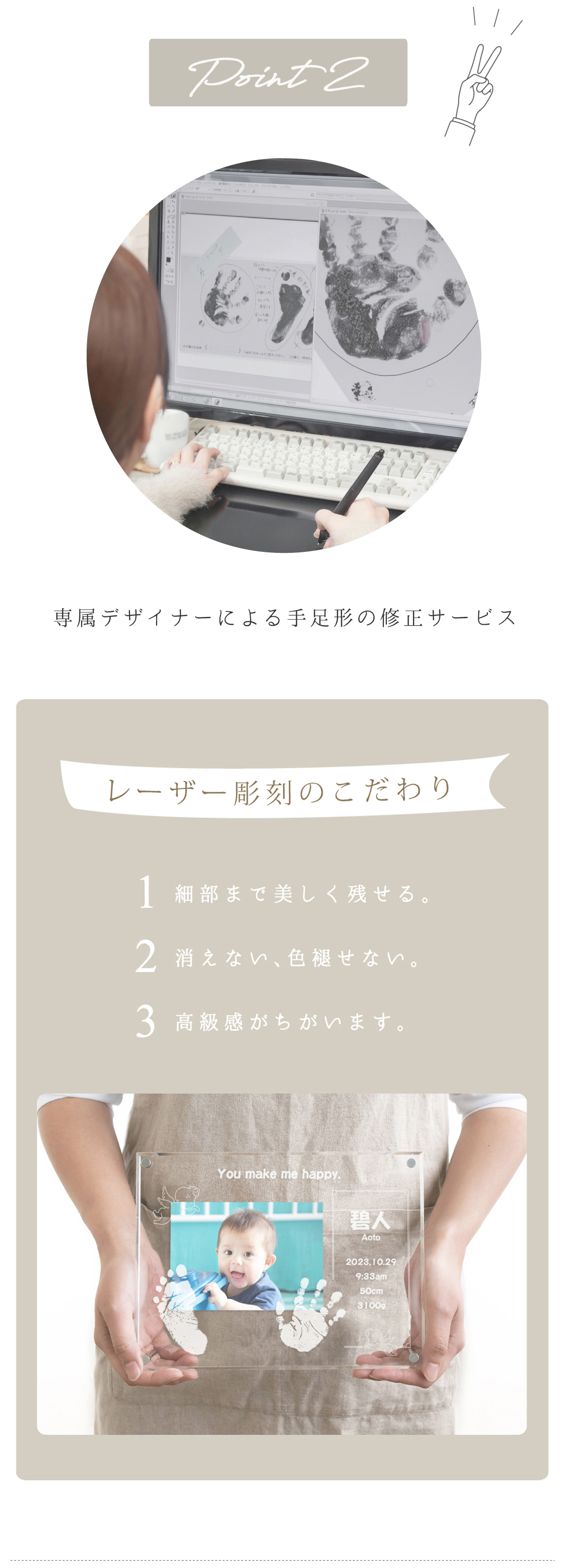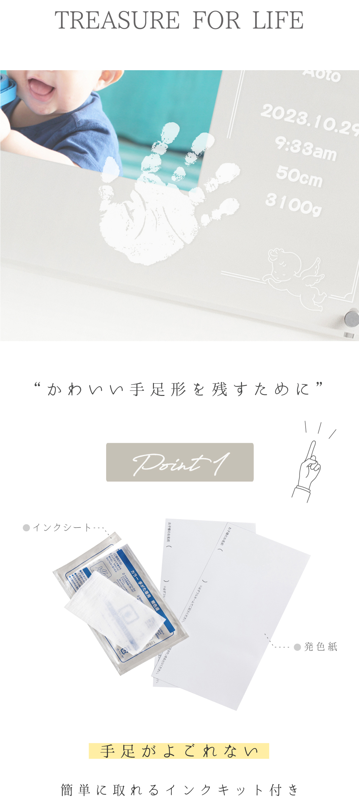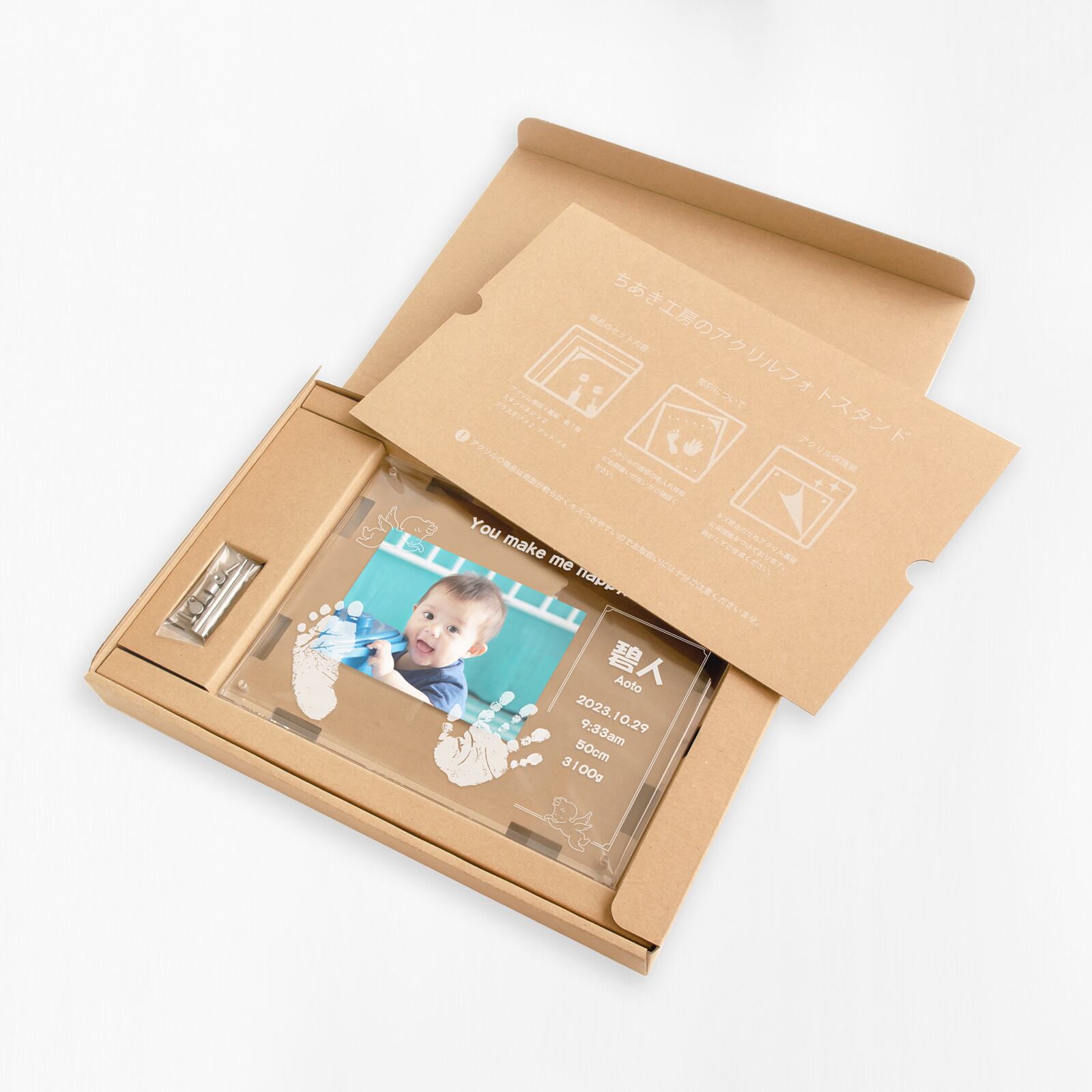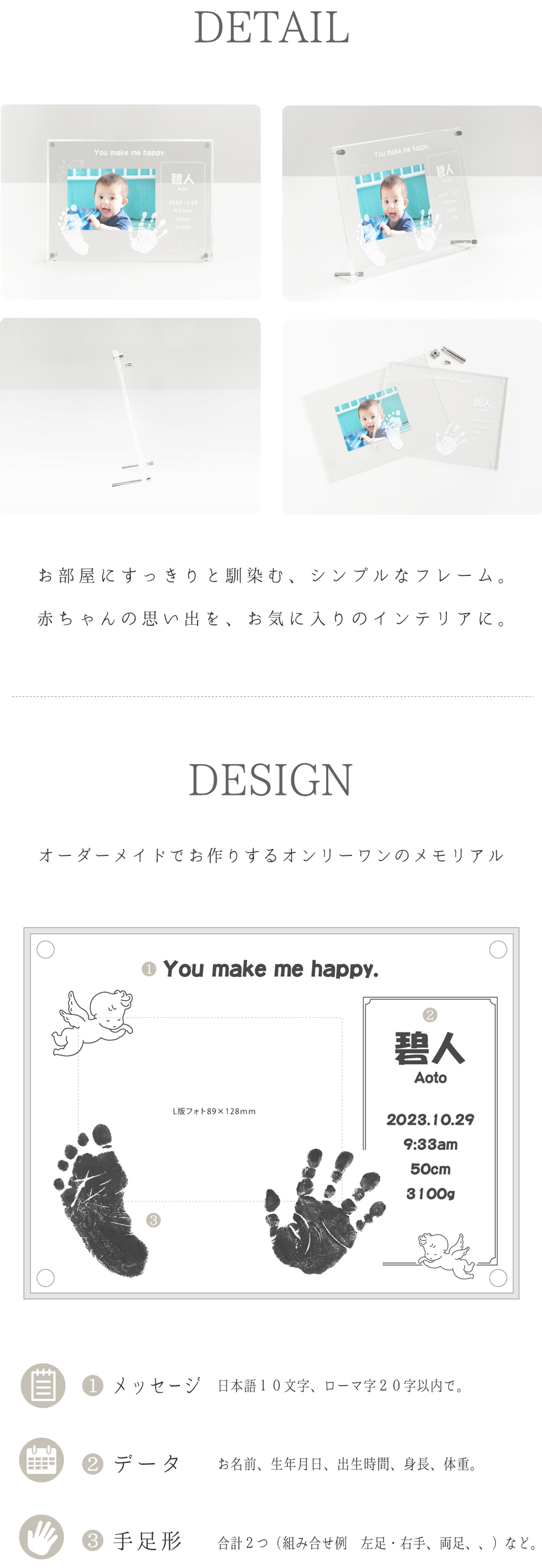 両手足形のうちいずれか2つ/お名前/お誕生日/出生時刻/身長/体重/メッセージ