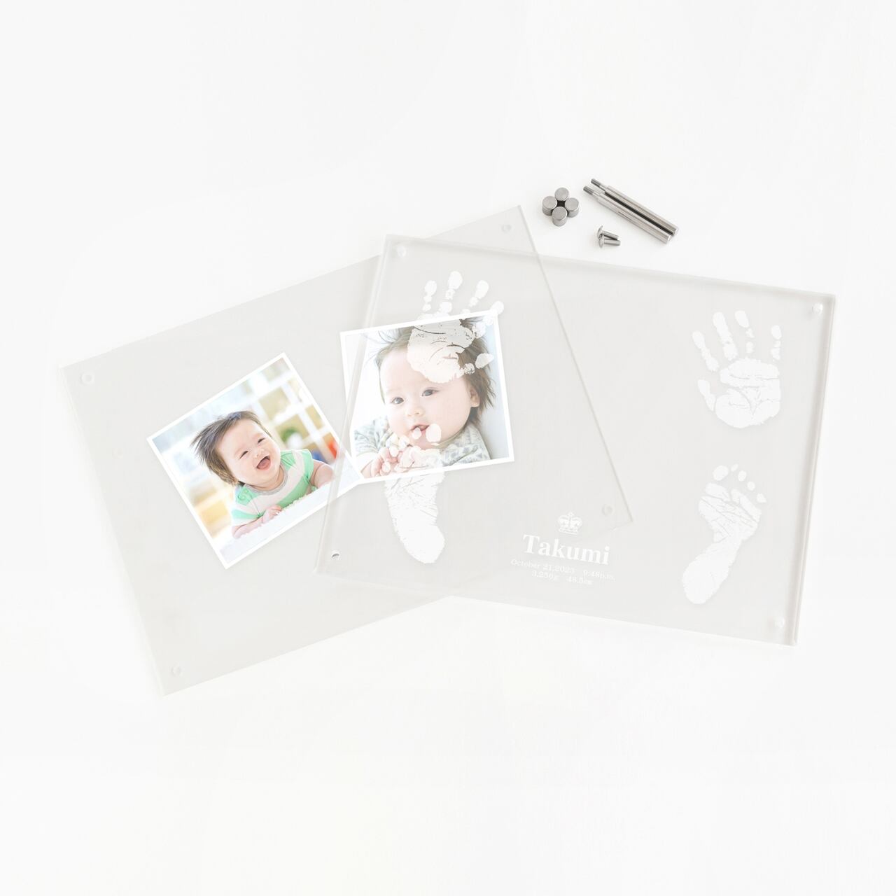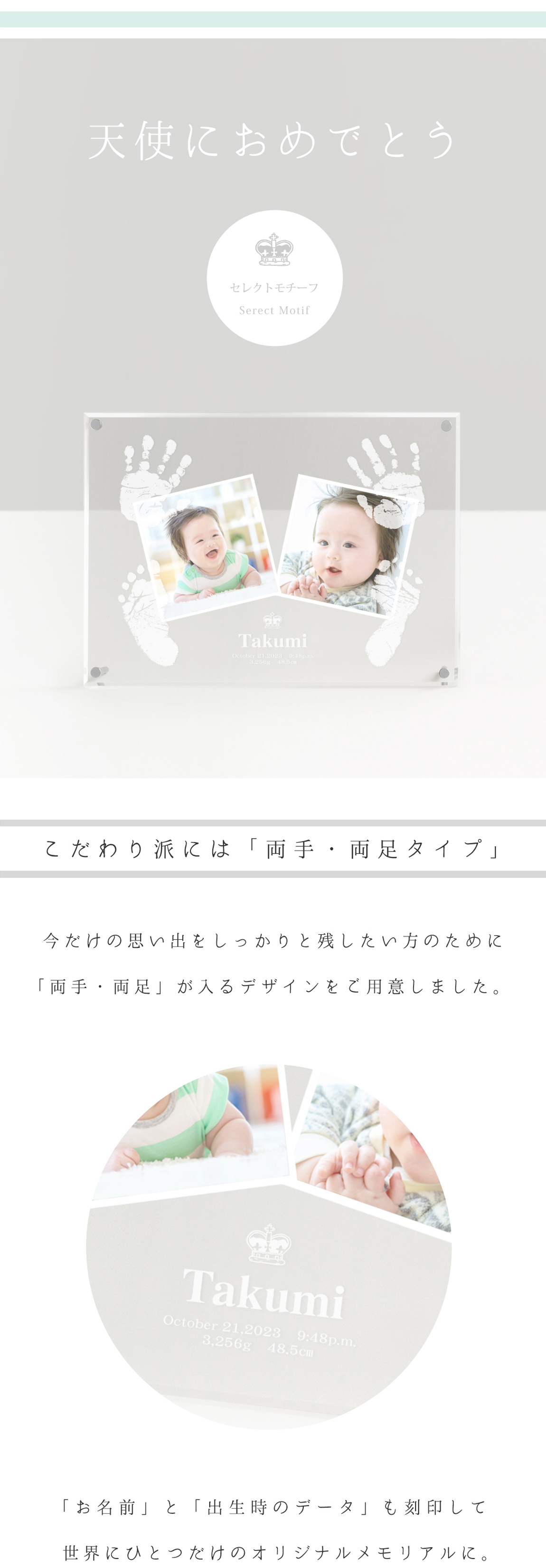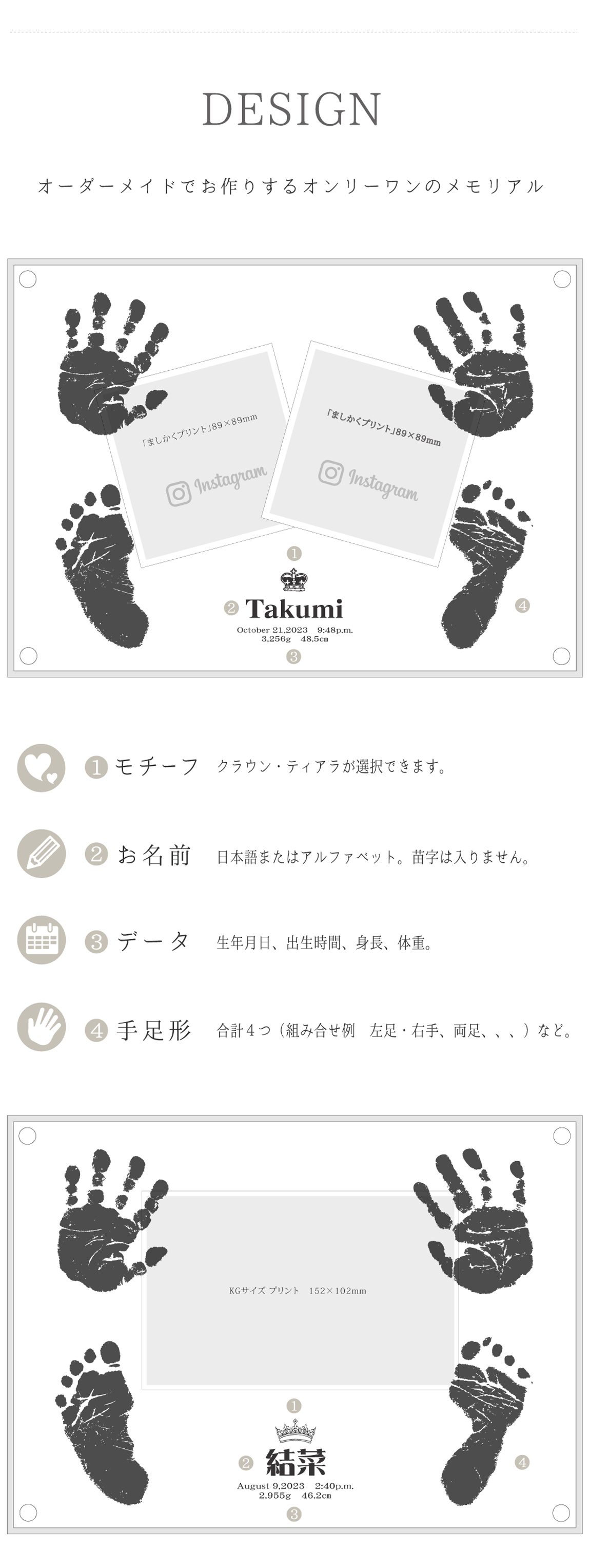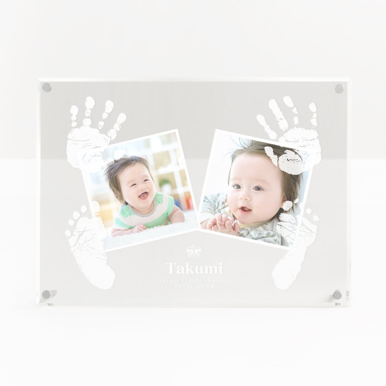 「両手足のカタチ」をしっかり残したい方におすすめ。ちいさな手足のかわいい表情をそのままに、すっきりとシンプルに仕上げました。大きめサイズなのでお写真のアレンジも自由に楽しめます。