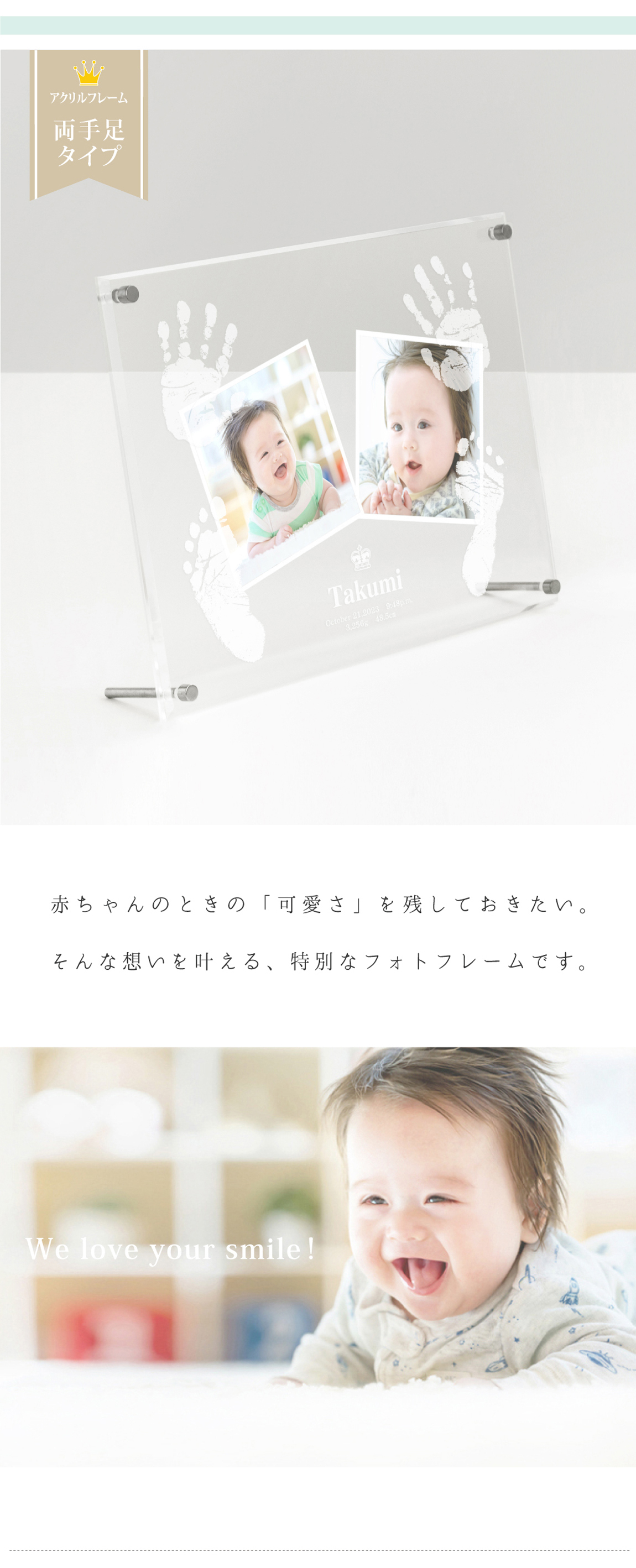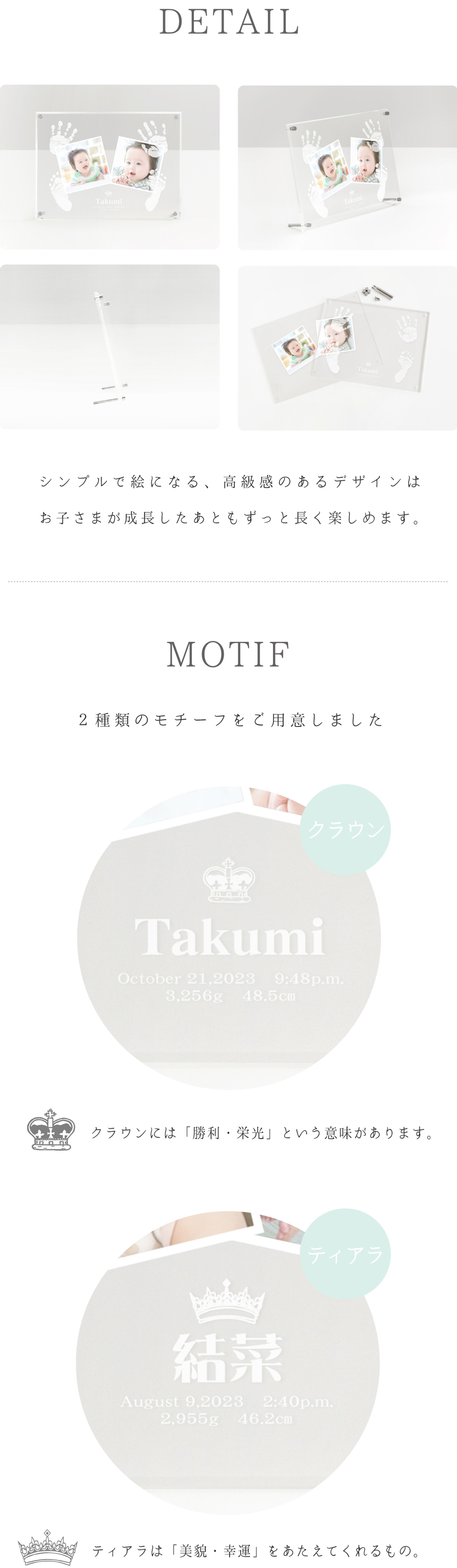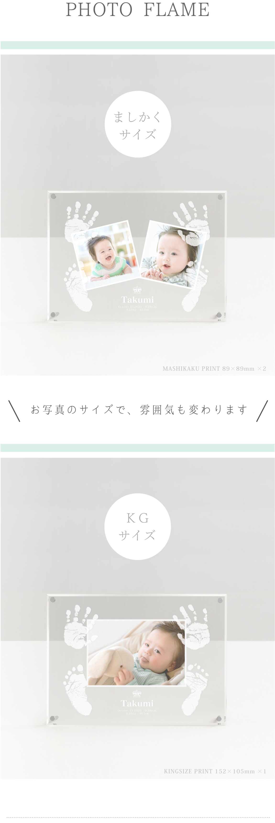 「両手足のカタチ」をしっかり残したい方におすすめ。ちいさな手足のかわいい表情をそのままに、すっきりとシンプルに仕上げました。大きめサイズなのでお写真のアレンジも自由に楽しめます。