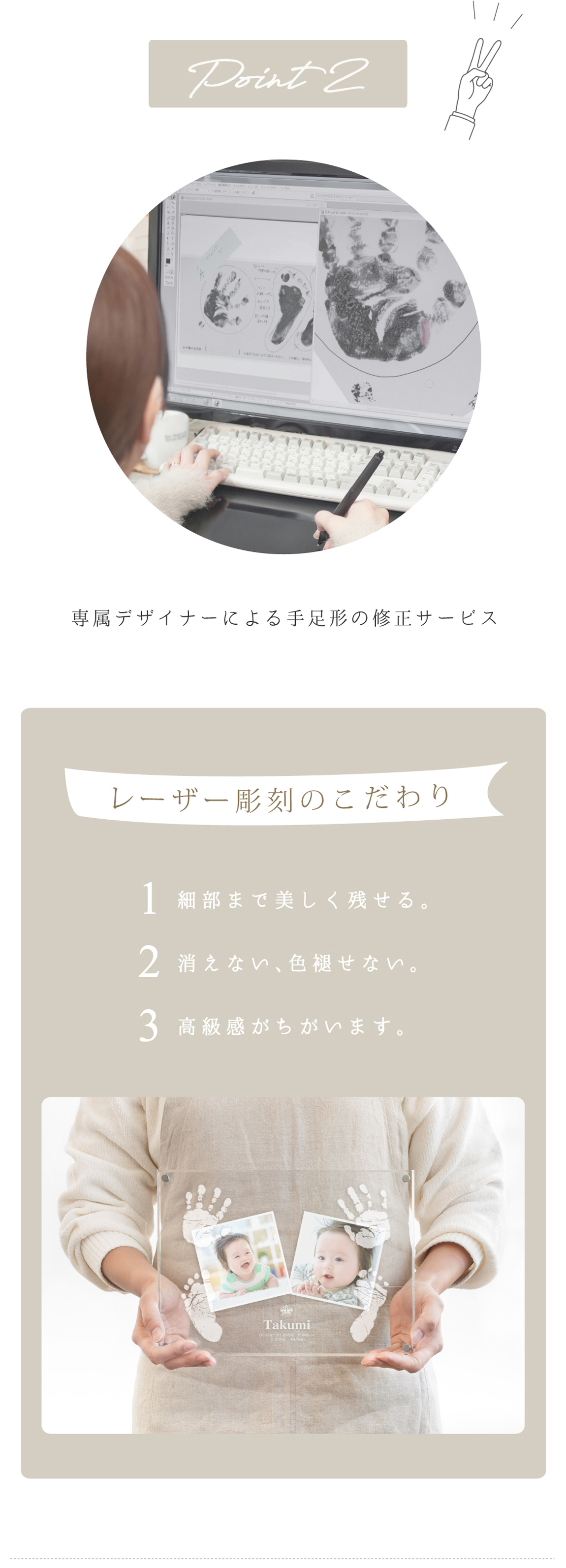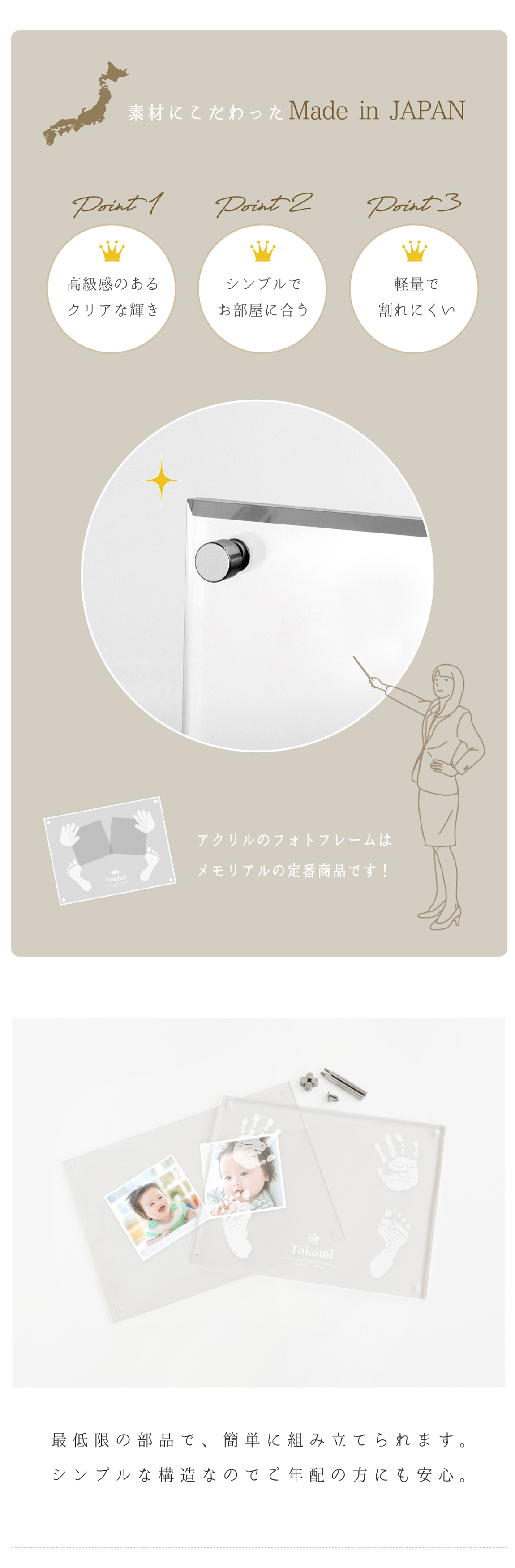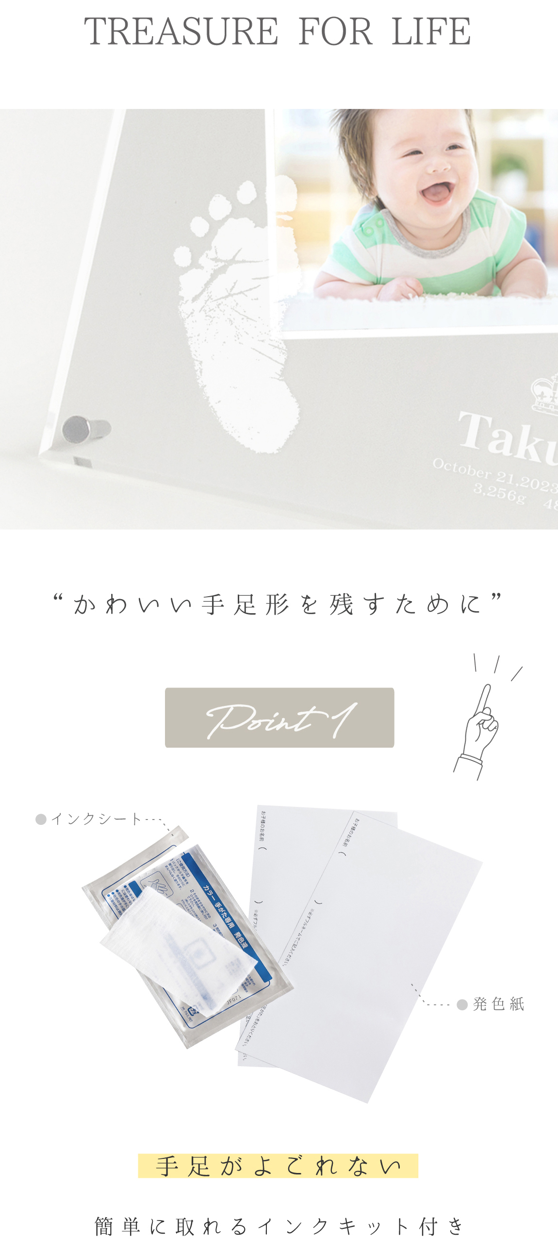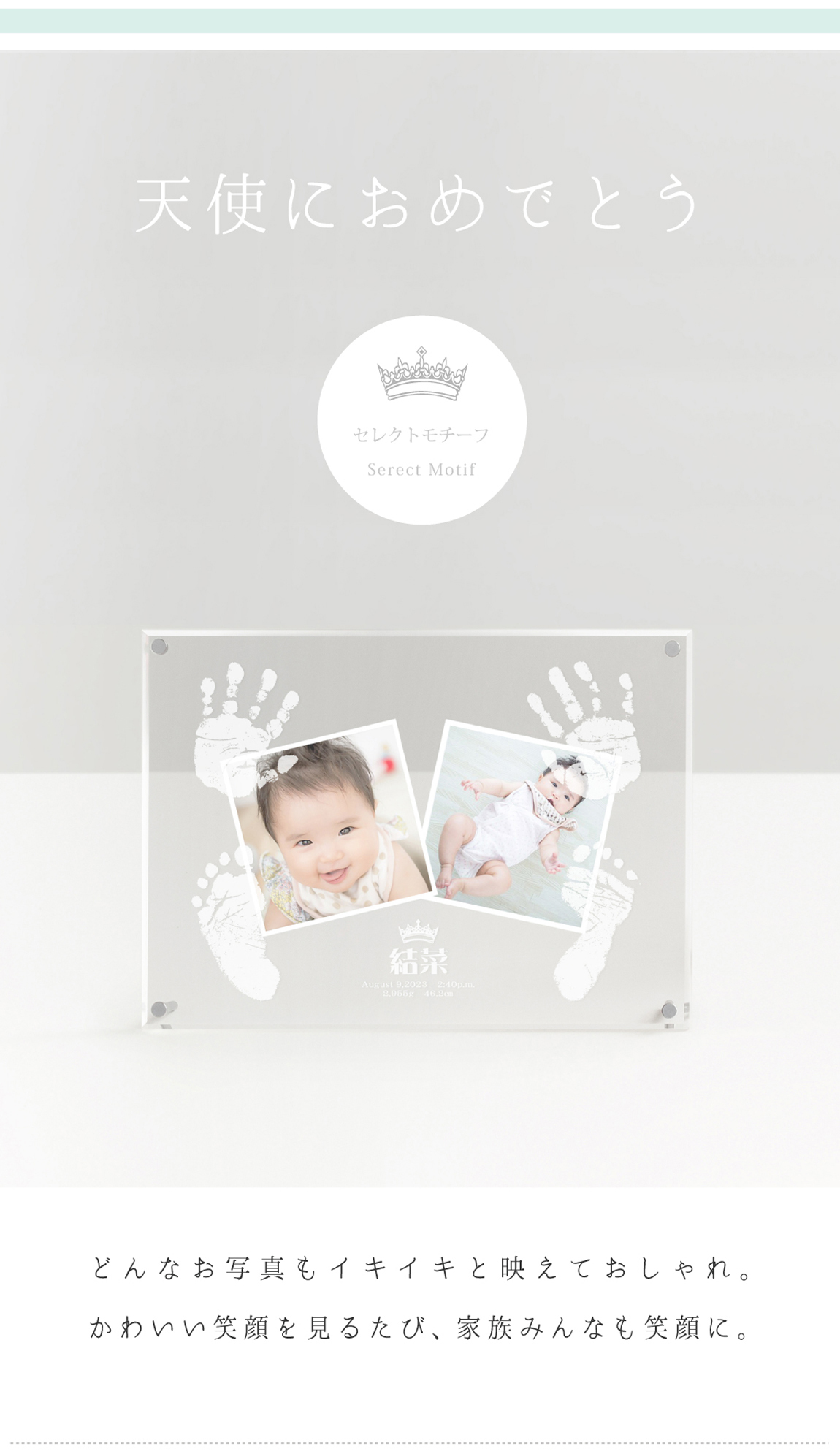 「両手足のカタチ」をしっかり残したい方におすすめ。ちいさな手足のかわいい表情をそのままに、すっきりとシンプルに仕上げました。大きめサイズなのでお写真のアレンジも自由に楽しめます。
