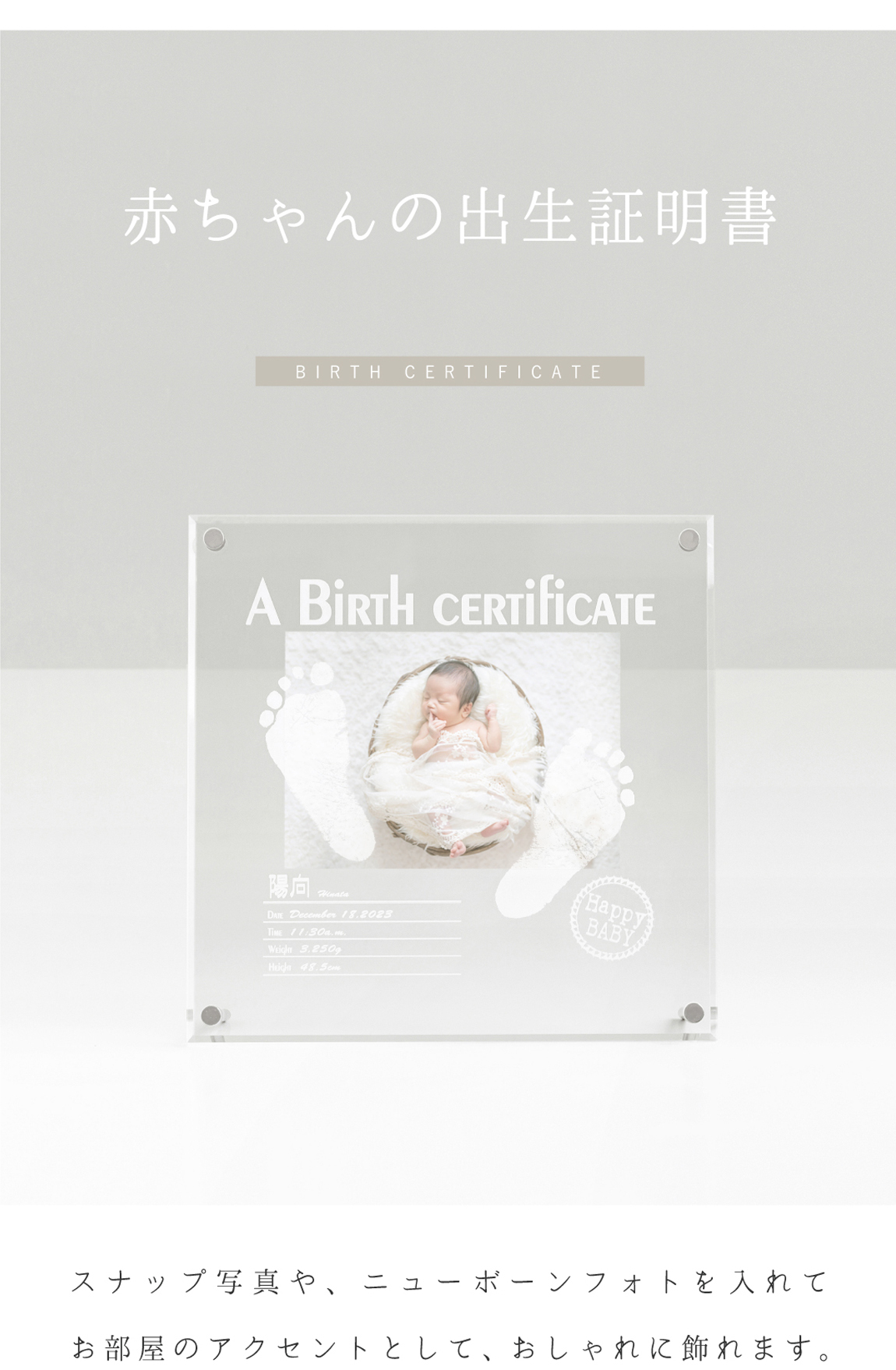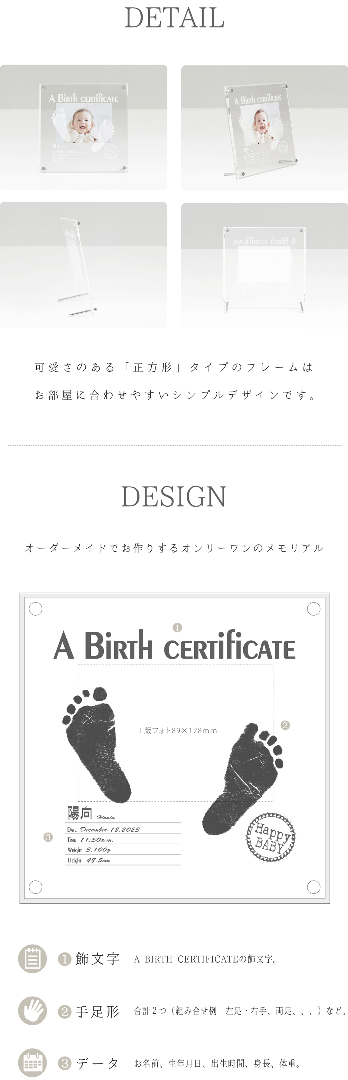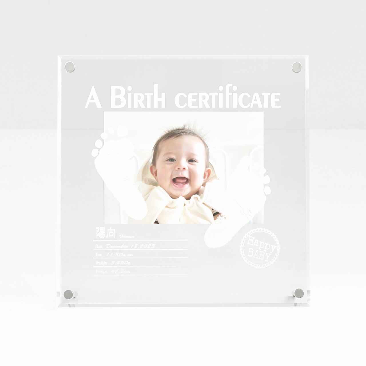 正方形(スクエア)タイプのおしゃれなアクリルスタンド。出生証明書をアレンジしたデザインです。お誕生記念のアートオブジェとして、お部屋にセンスよく飾っていただけます。
