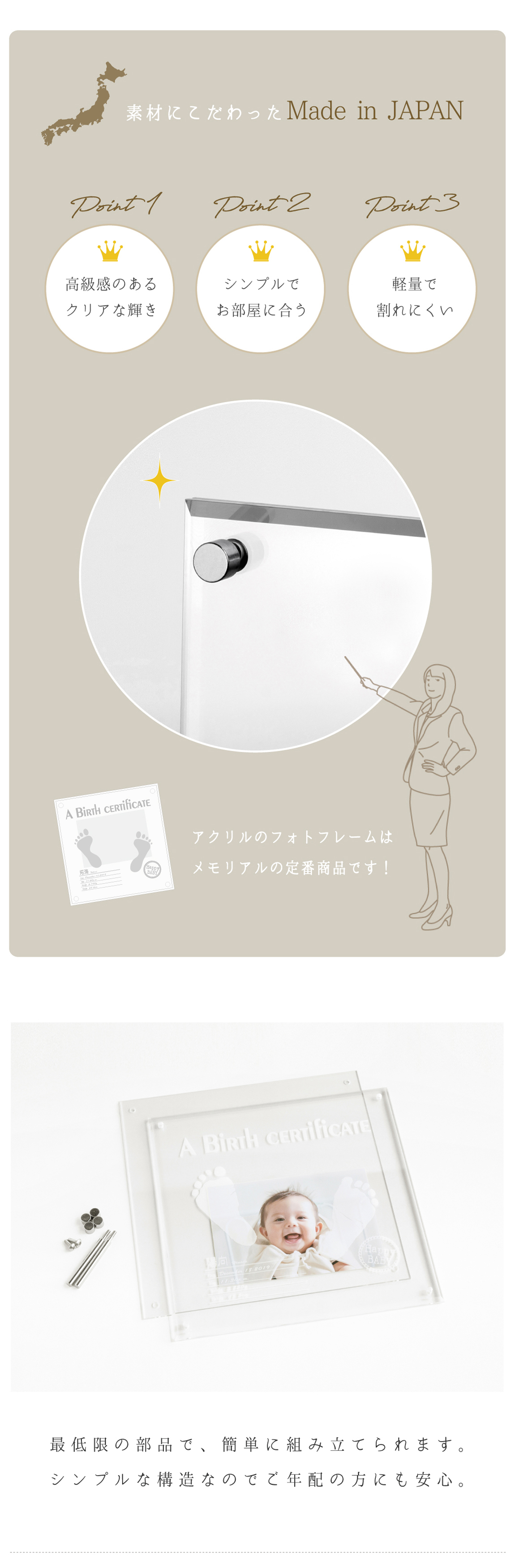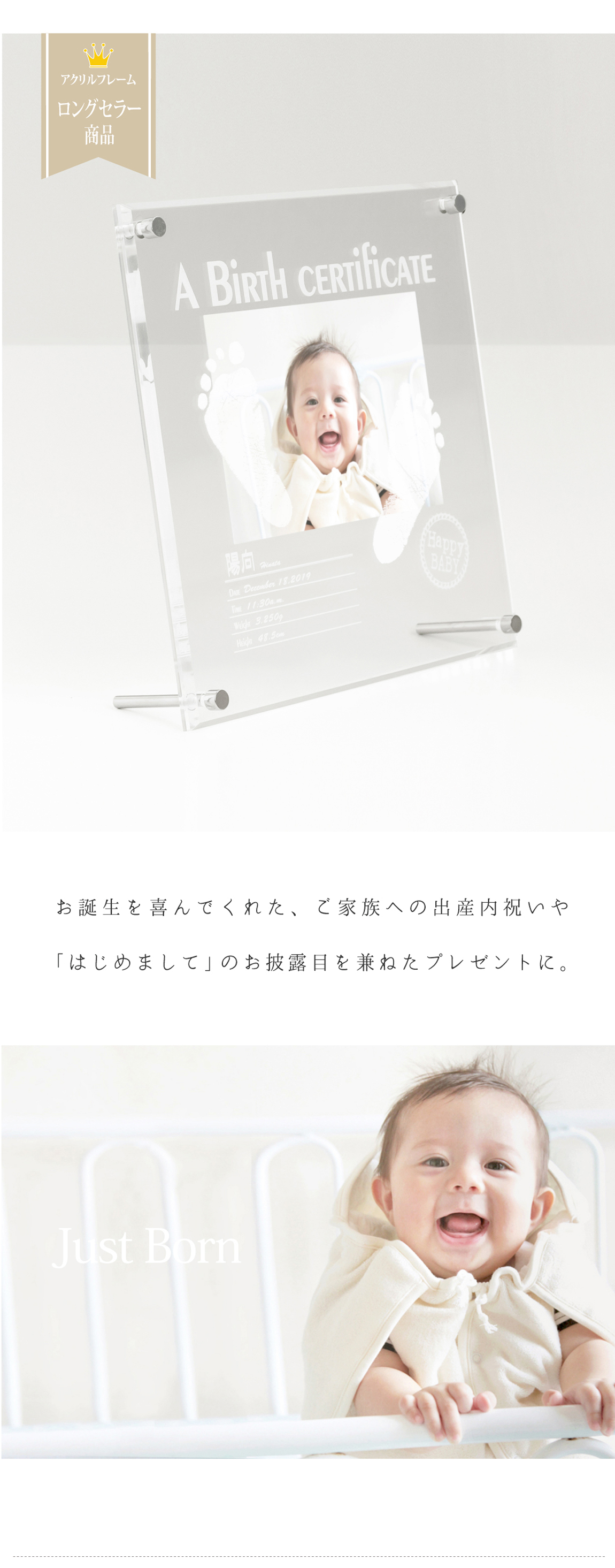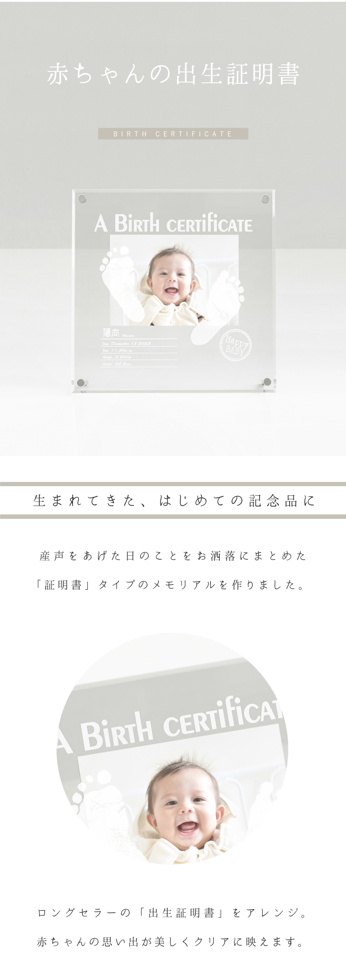 正方形(スクエア)タイプのおしゃれなアクリルスタンド。出生証明書をアレンジしたデザインです。お誕生記念のアートオブジェとして、お部屋にセンスよく飾っていただけます。