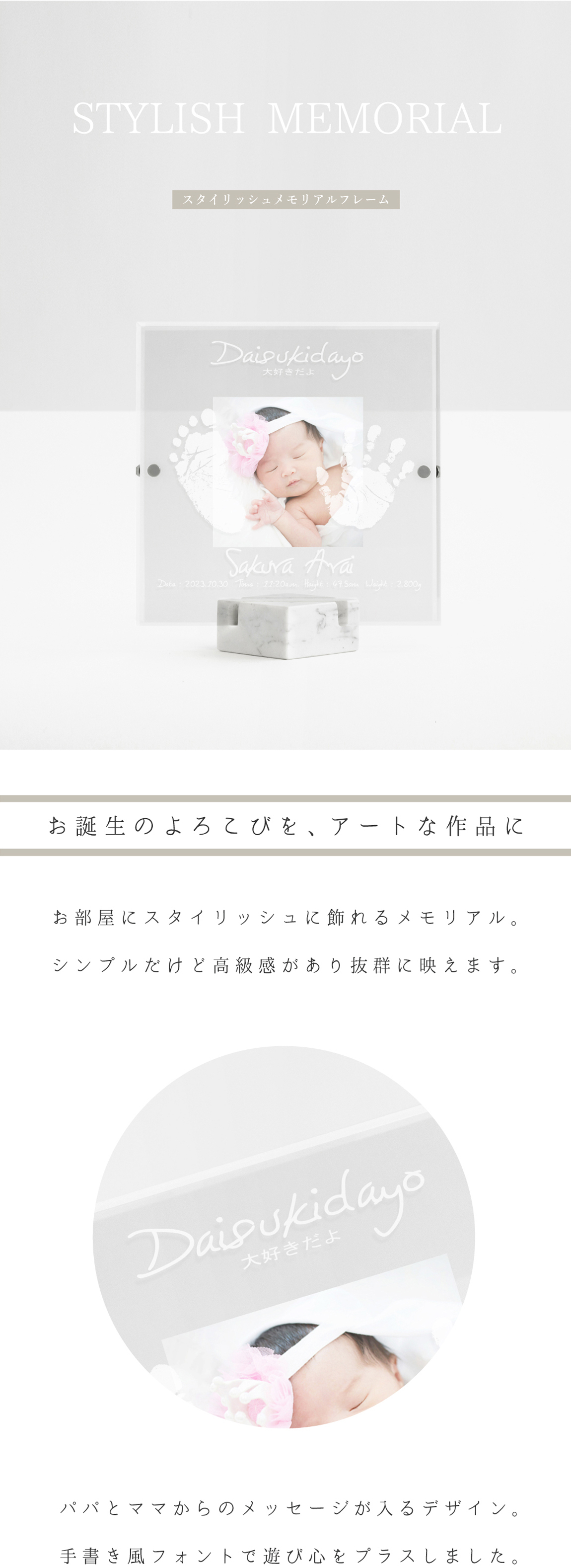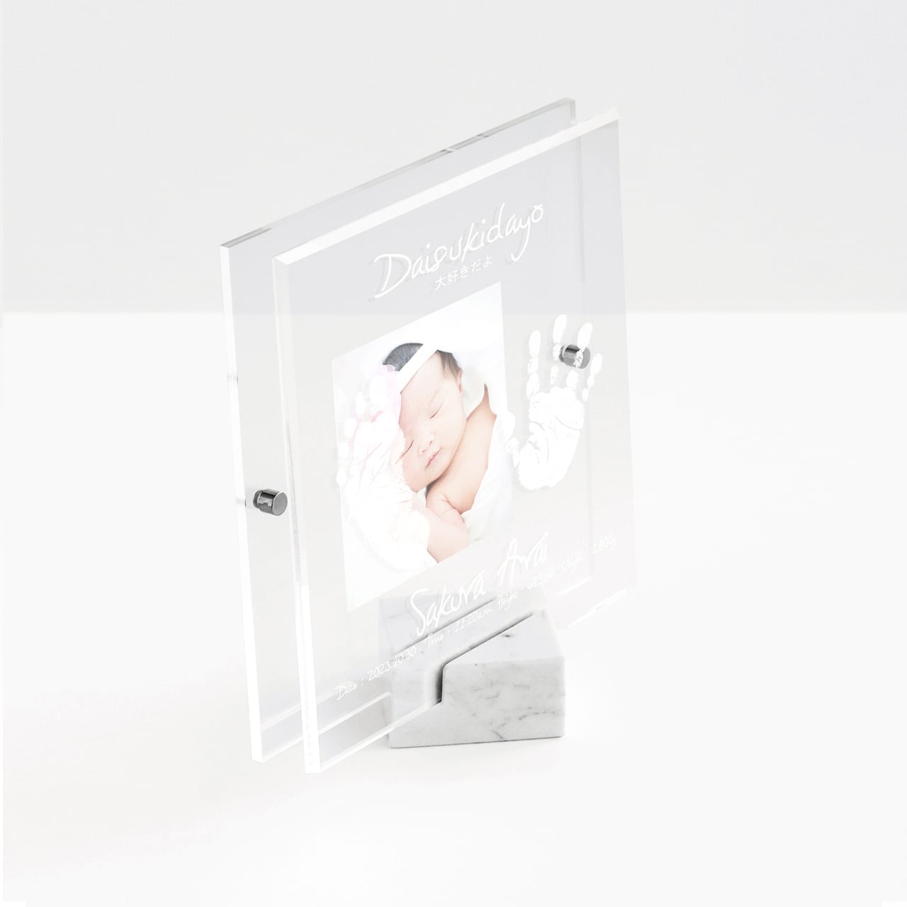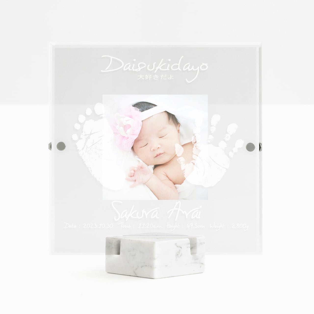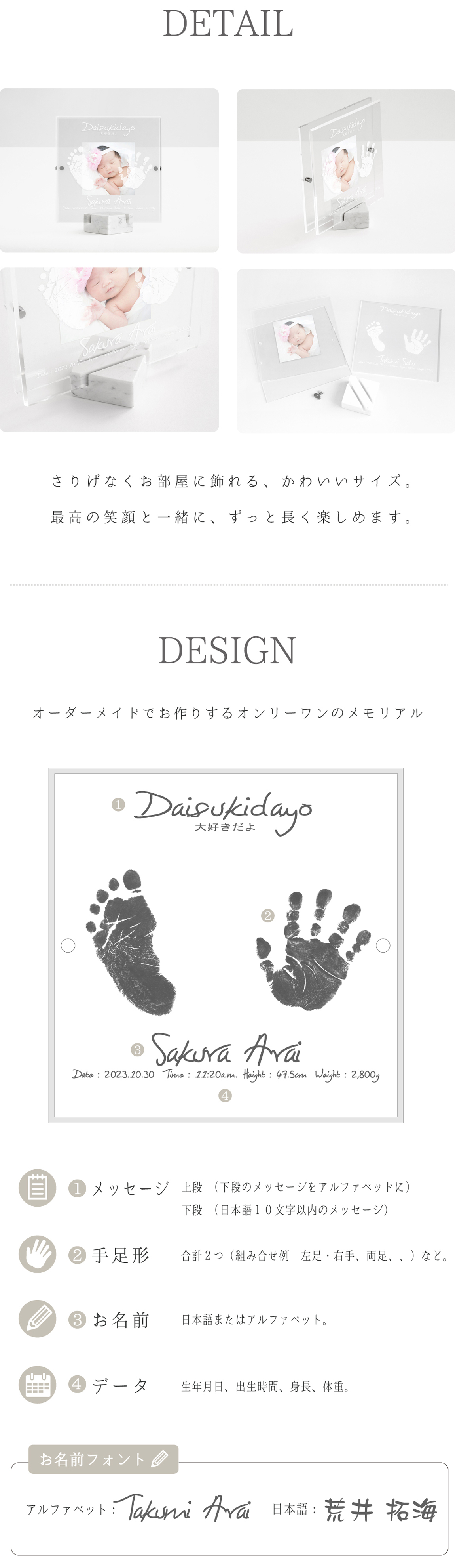 両手足形のうちいずれか2つ/お名前/お誕生日/出生時刻/身長/体重/メッセージ