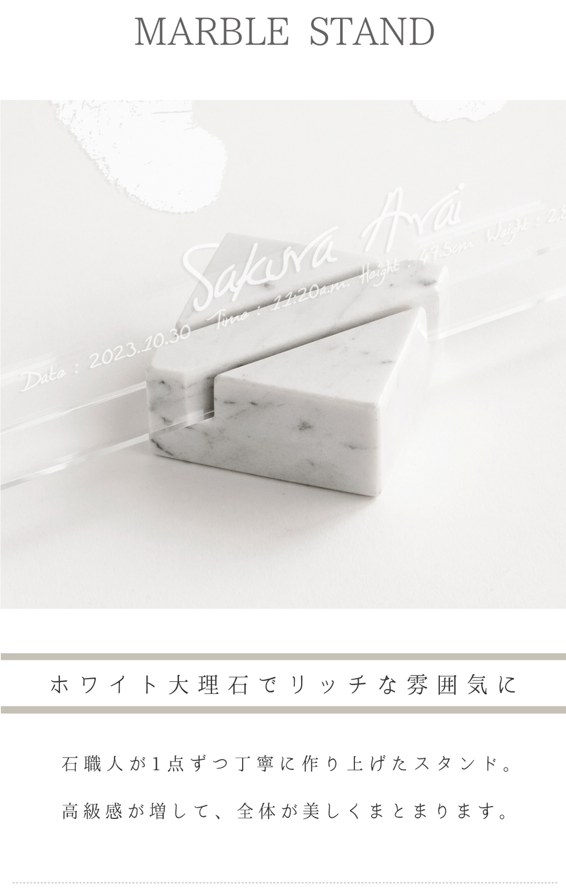「ホワイト大理石」と「アクリル」を組み合わせた洗練されたデザイン。シンプルながらも立体的で奥行きのある構造が美しく、おしゃれなオブジェのような存在感を放ってくれます。