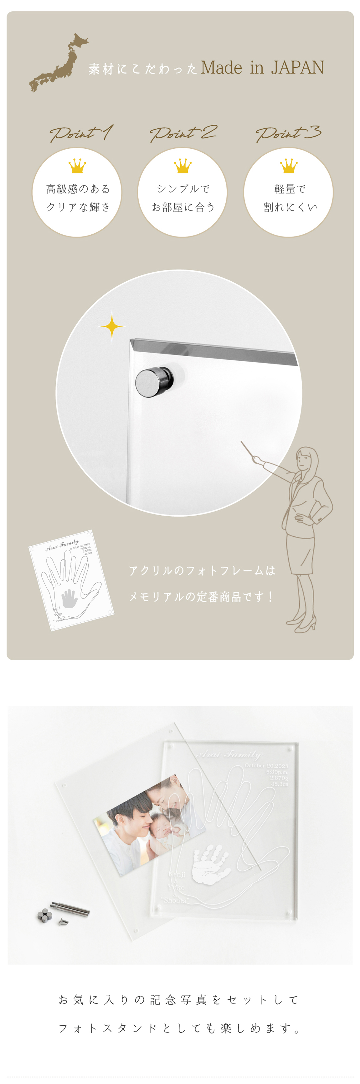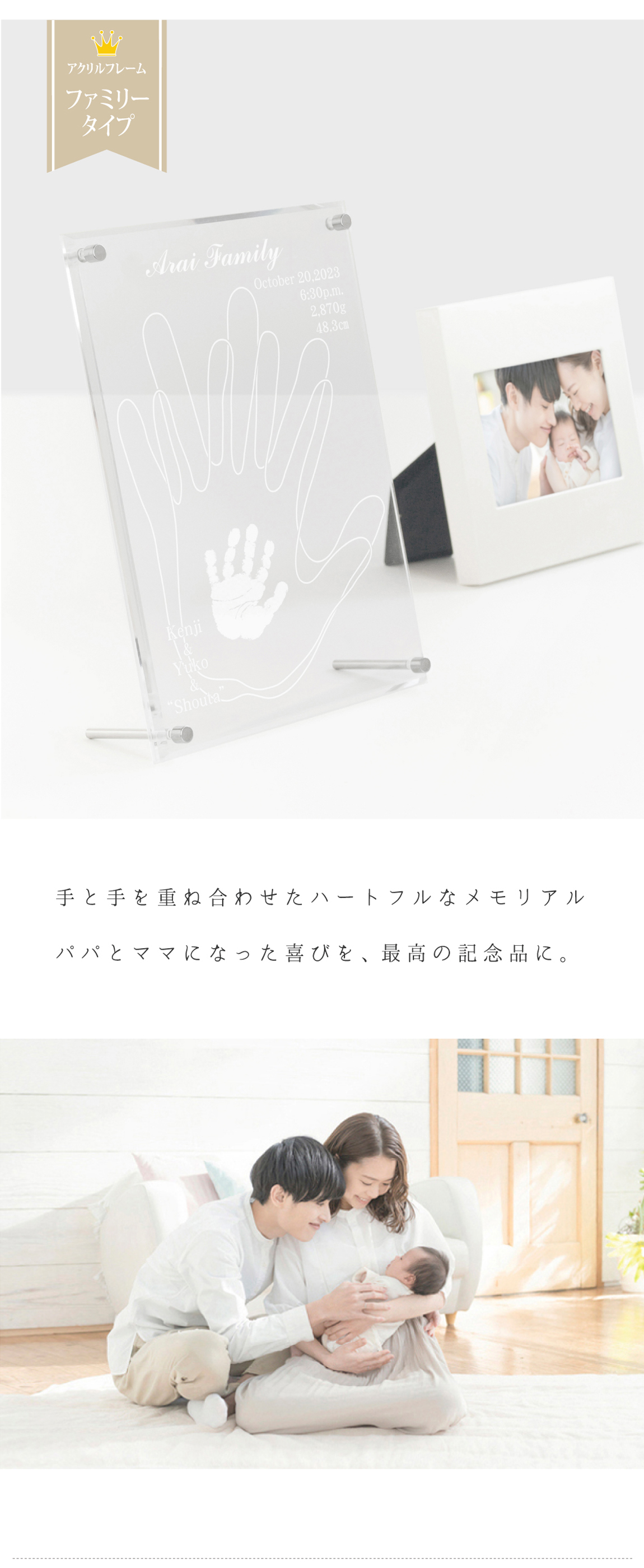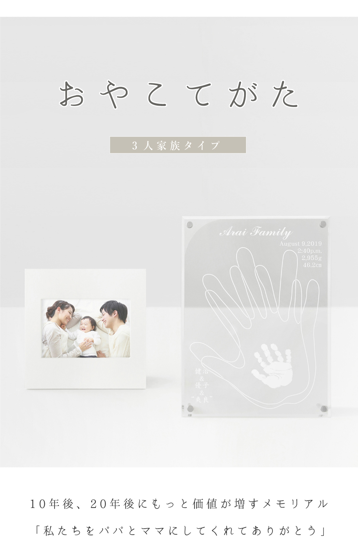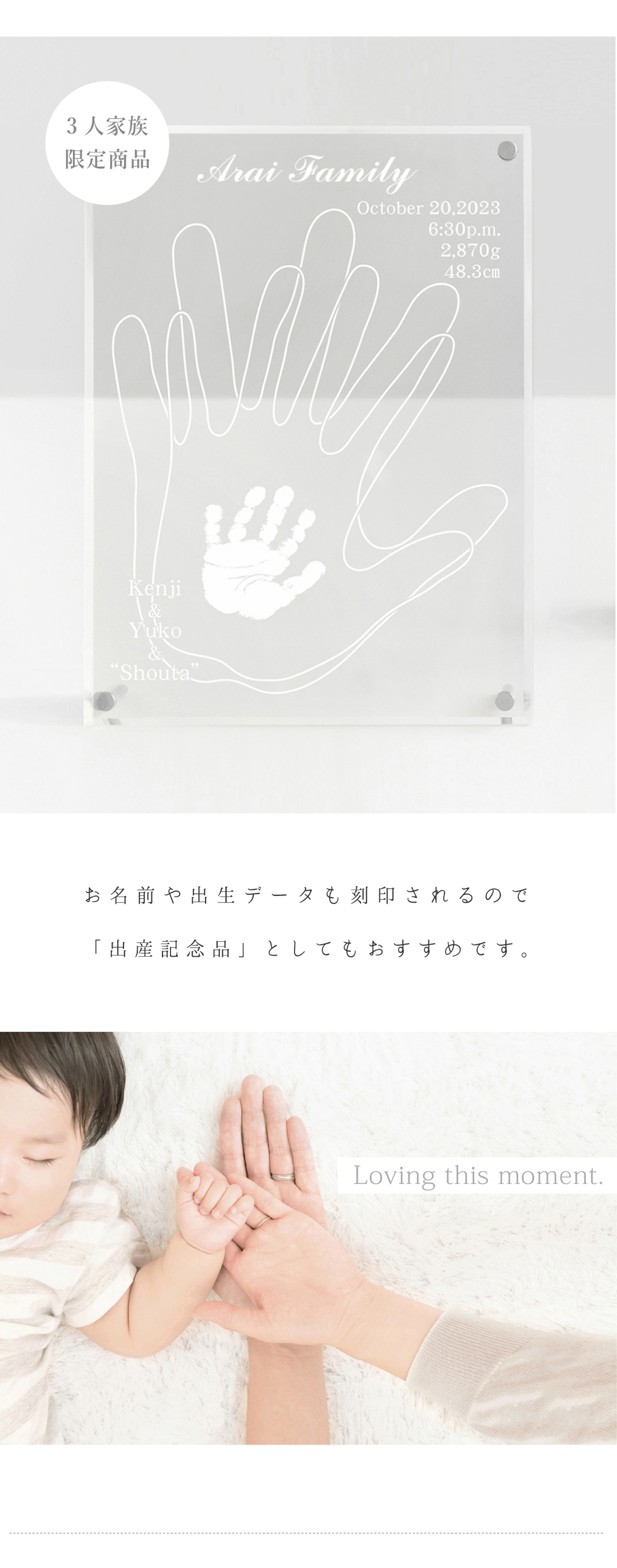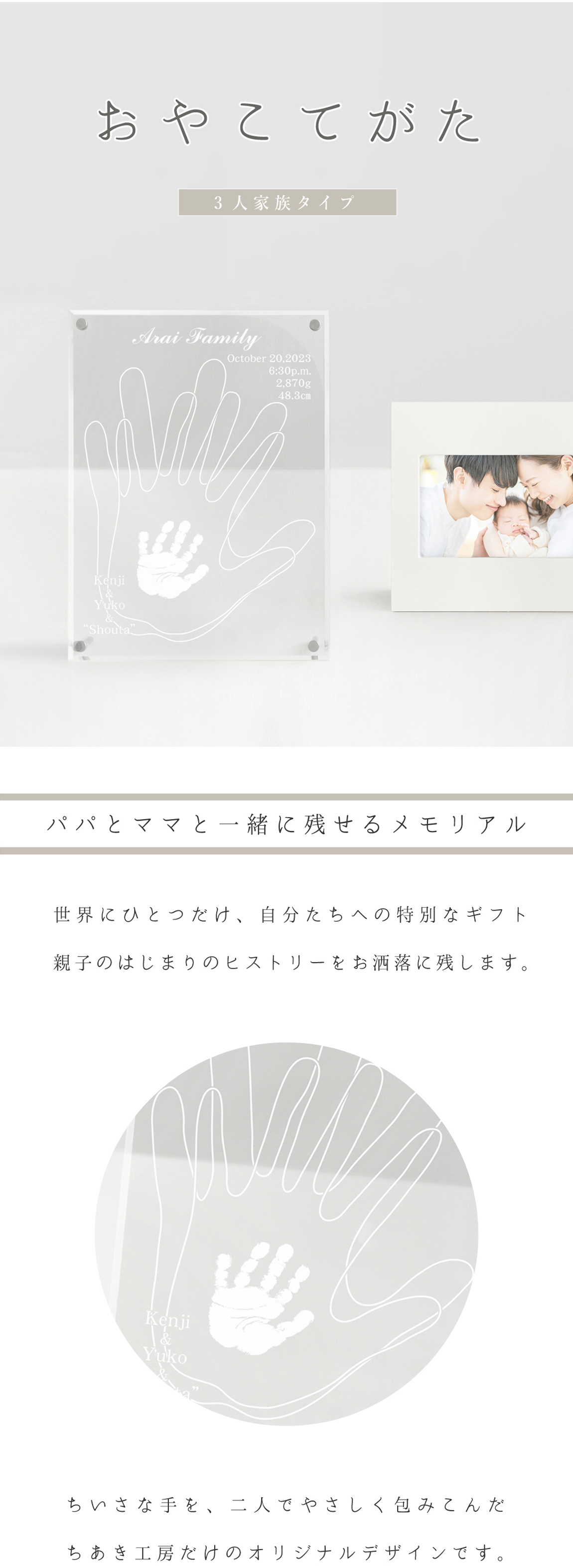赤ちゃんの誕生を祝う「はじめての親子記念」におすすめ。パパとママの大きな愛情のなかで、小さな命がすくすく元気に育つよう願いをこめて作りました。ご家族の「絆」をやさしく伝えてくれる、特別な記念品です。<3人家族限定>