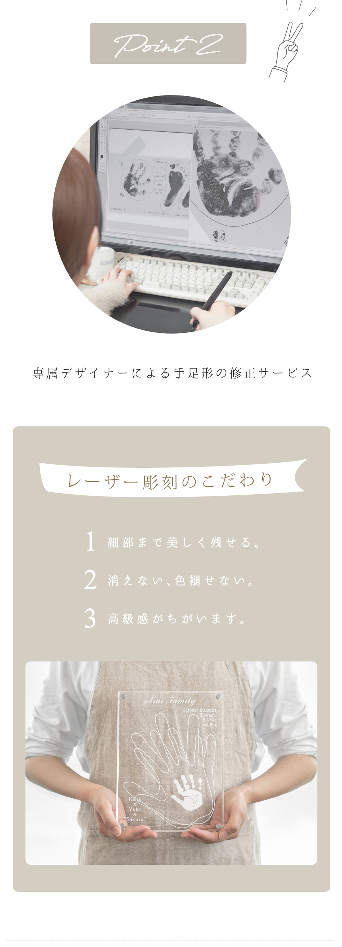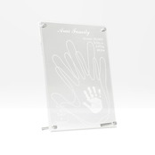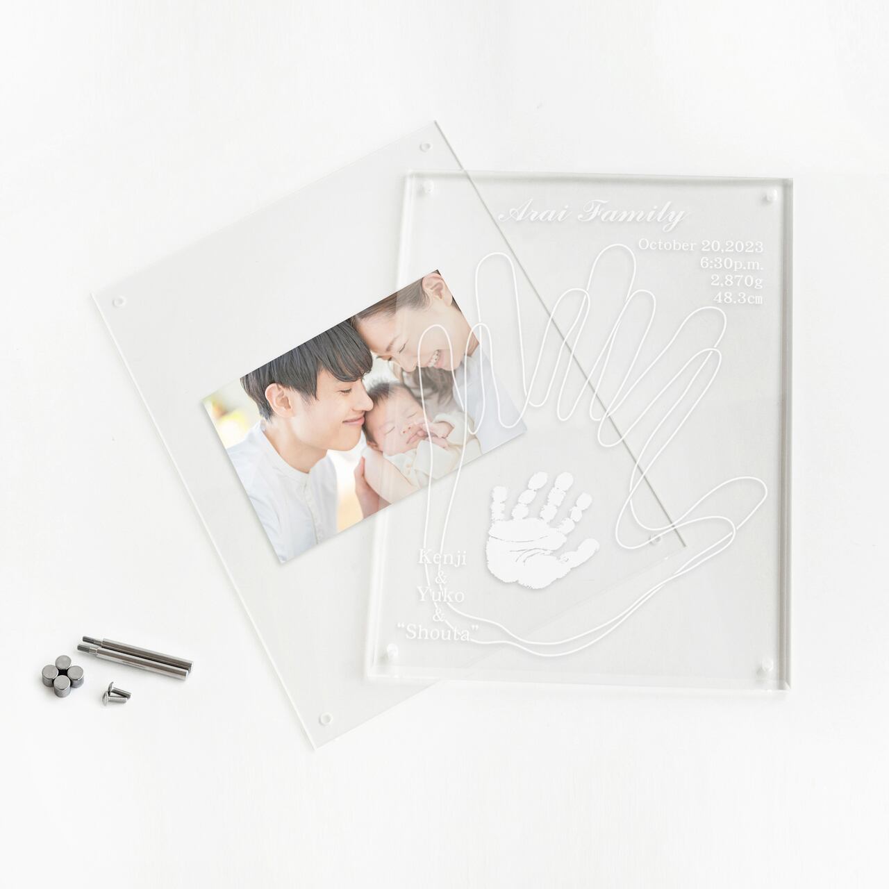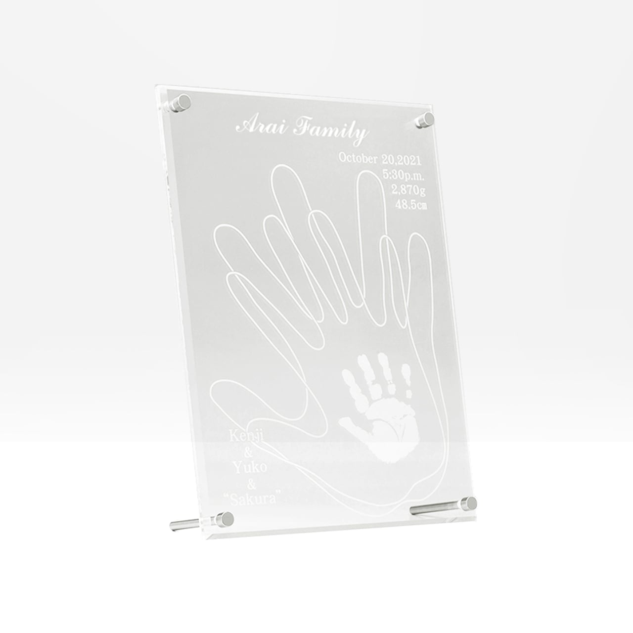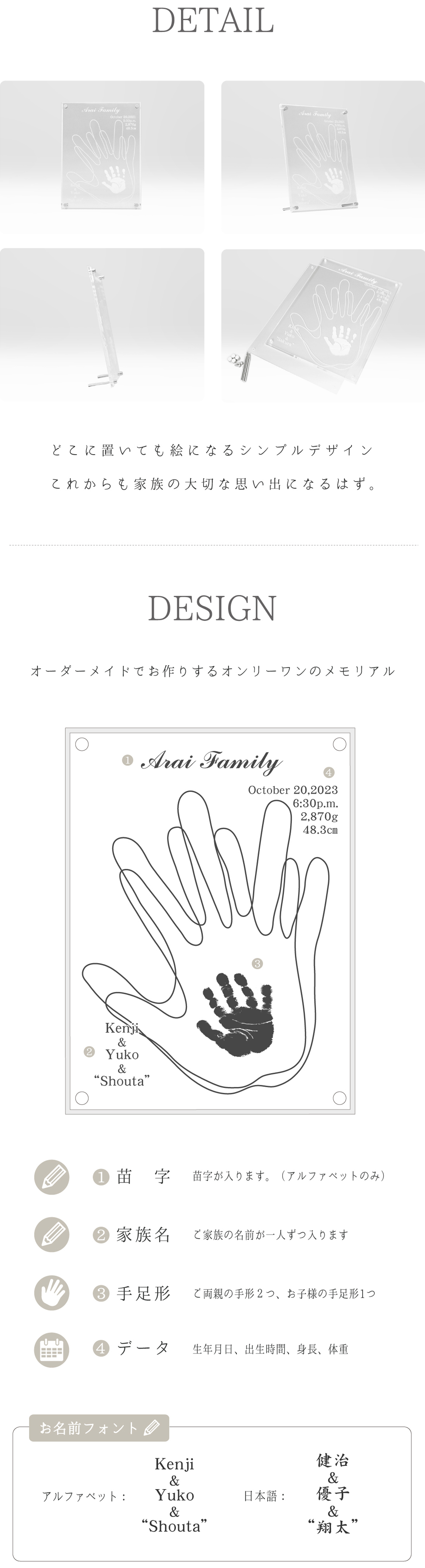 ご両親の手形(線画)1つずつ/手形1つ/ご家族のお名前/苗字/生年月日/出生時間/身長/体重 ※制作に関するご希望は、ご注文後にお送りする「お申込用紙」にご記入ください。