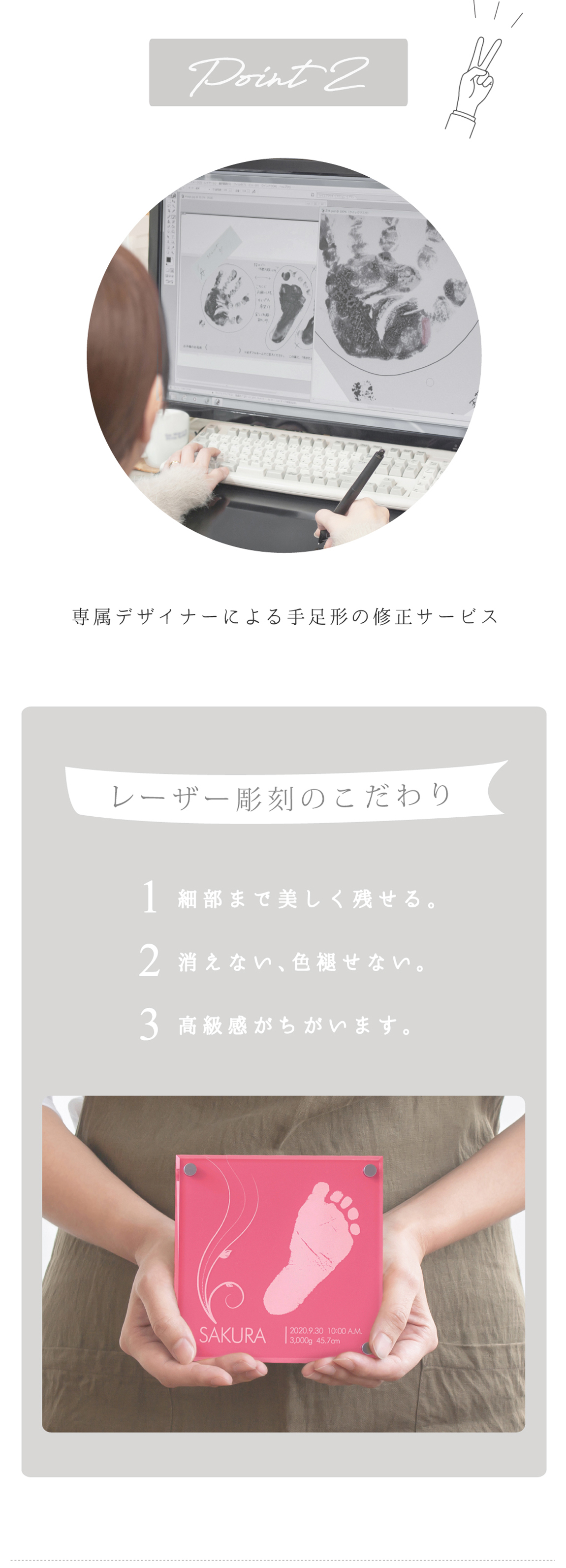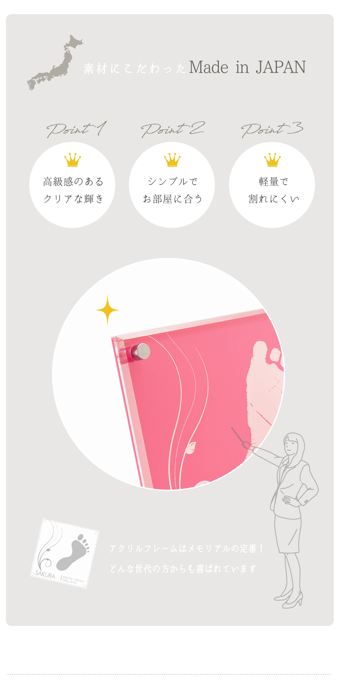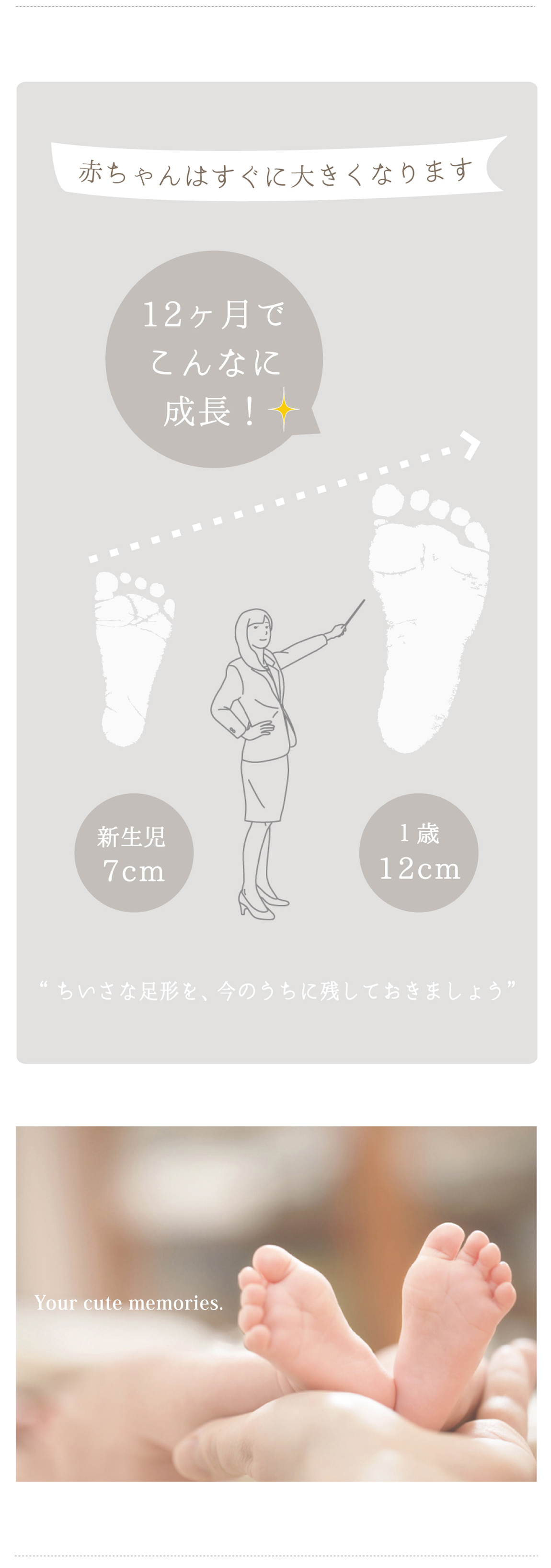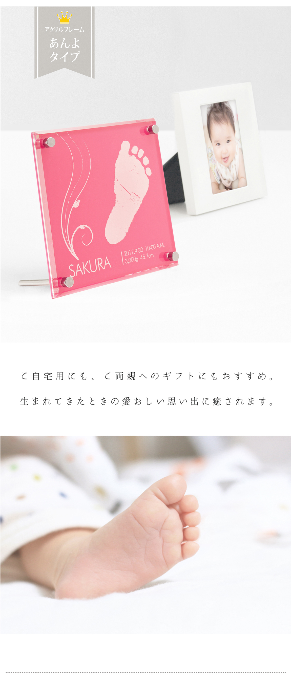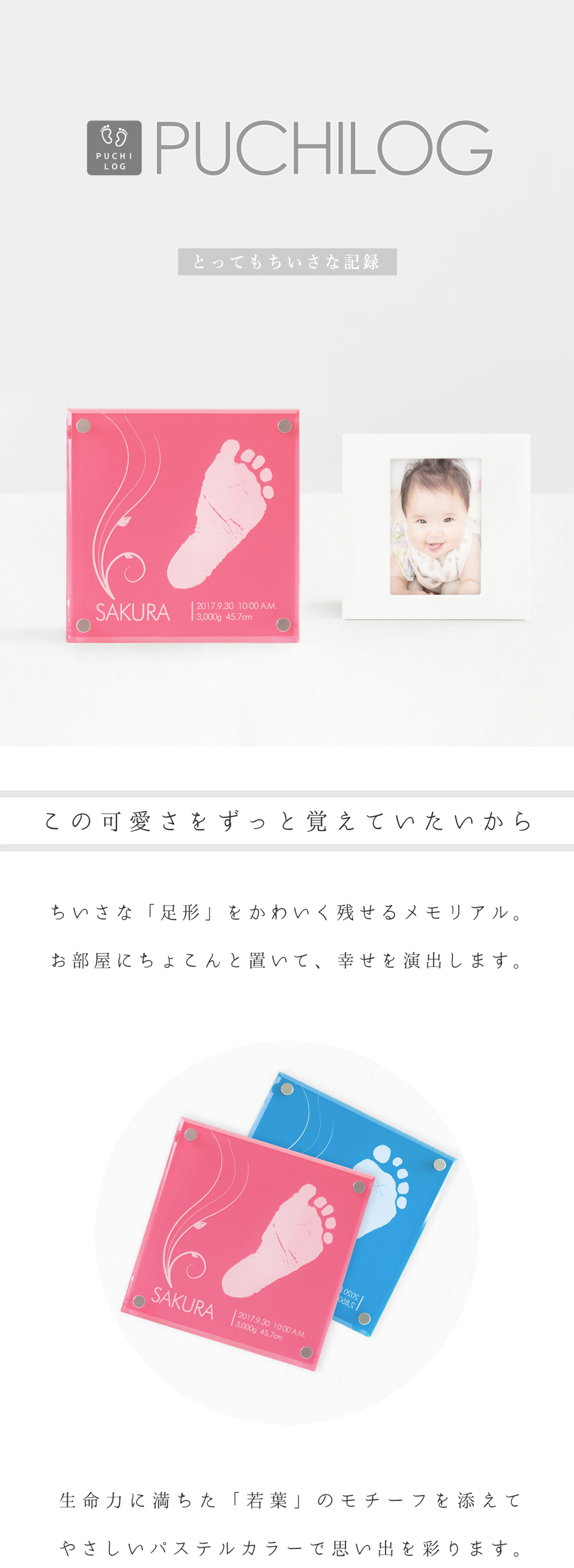 ちいさな足形のかわいさをそのまま残せる、プチサイズのメモリアルです。お手頃価格でギフトにもおすすめ。やさしい色合いがお部屋を明るく彩り、さりげないアクセントとしてお楽しみいただけます。