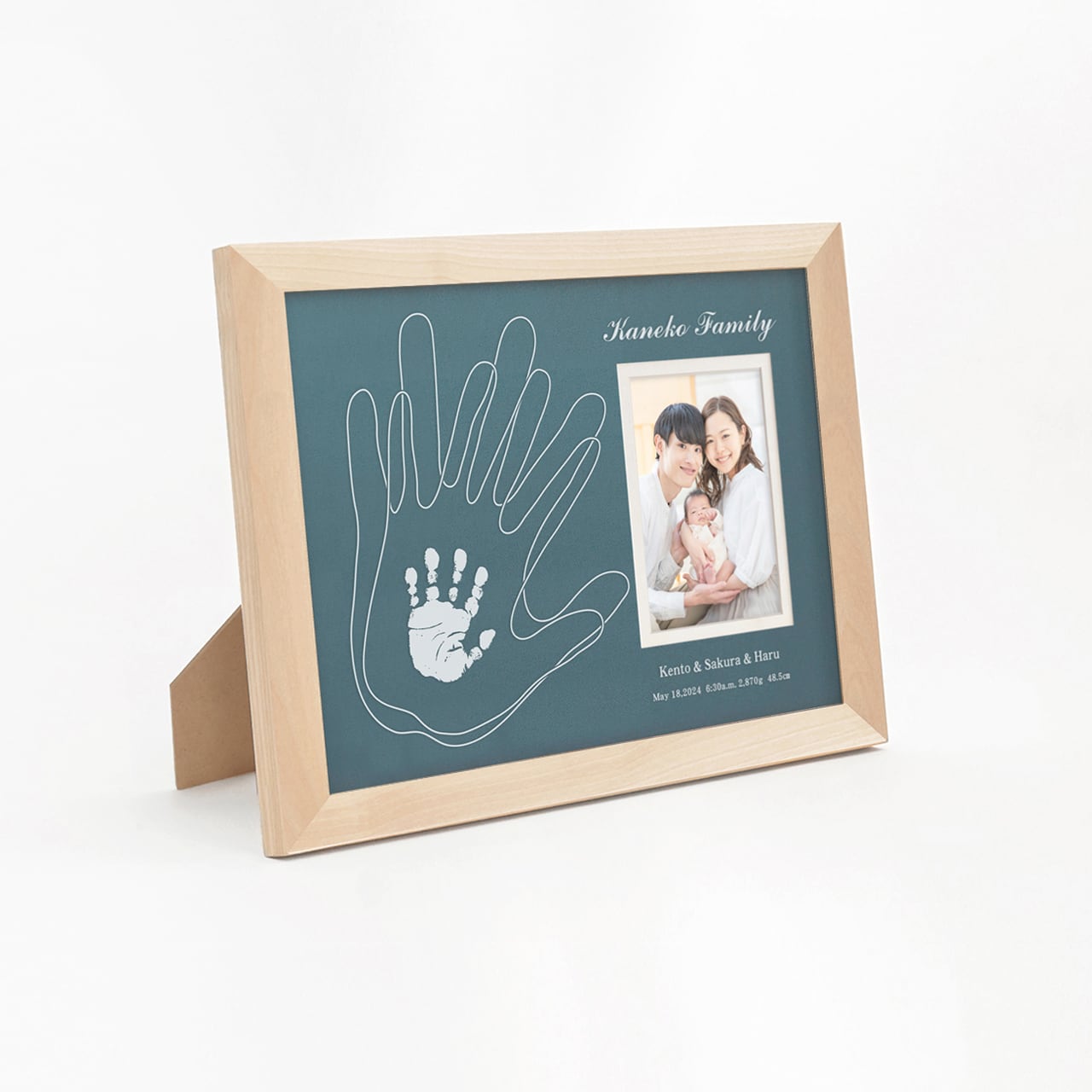 「はじめての親子記念」に小さな手と、大きな手を重ねたハートフルなデザイン。天然木のぬくもりで親子の「絆」を包みこみます。こだわりの日本製フレームは当店だけのオリジナル。親子のお写真が美しく収まり、上品に飾っていただける記念品です。<3人家族限定>