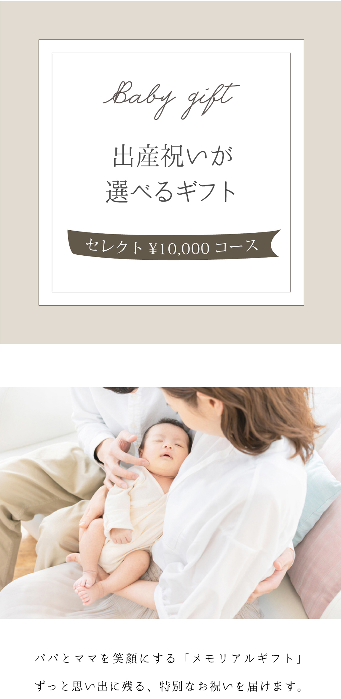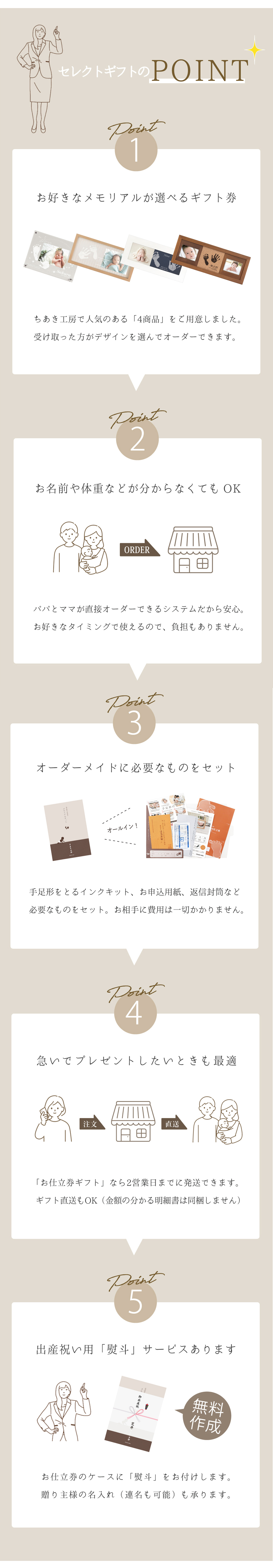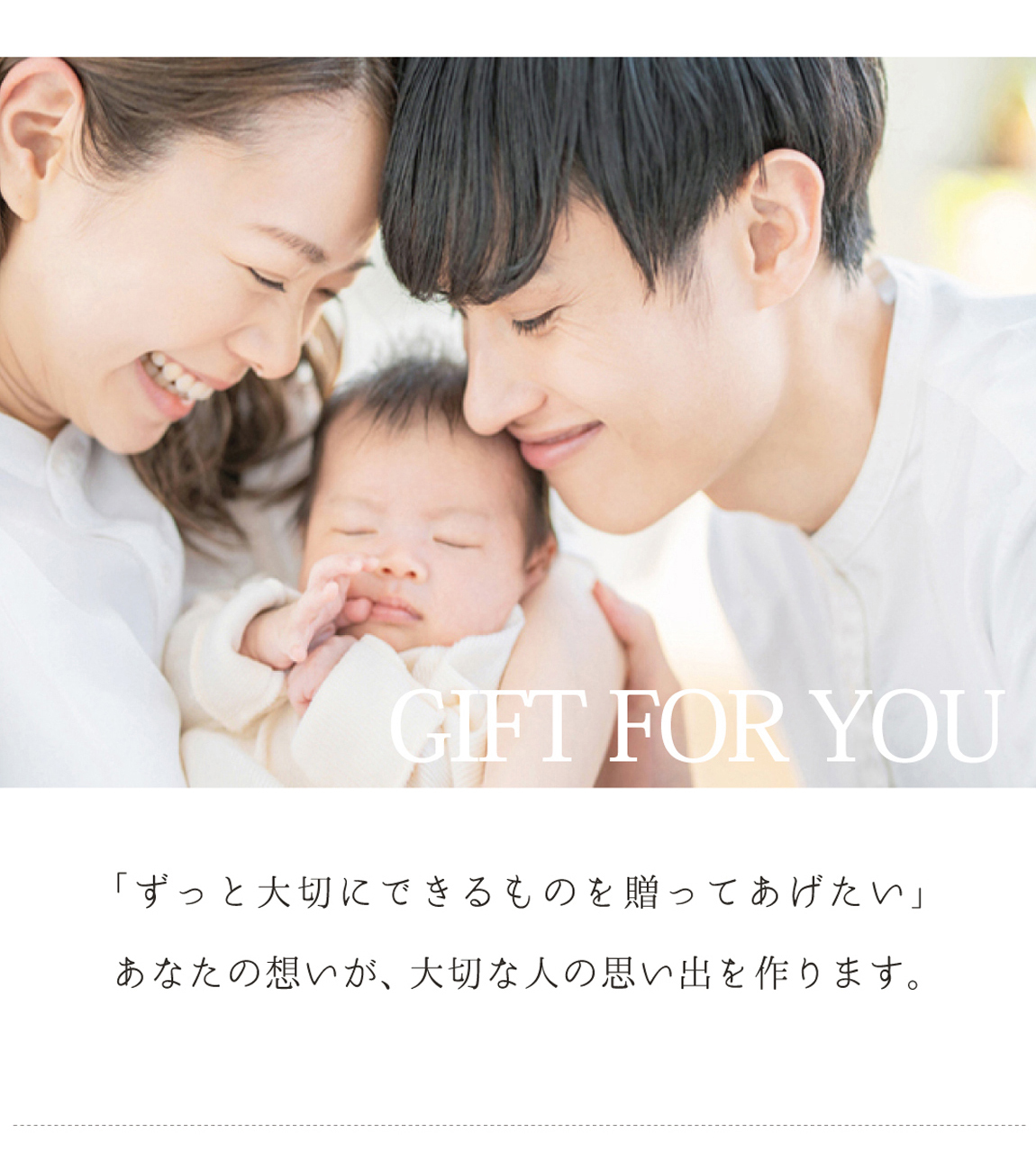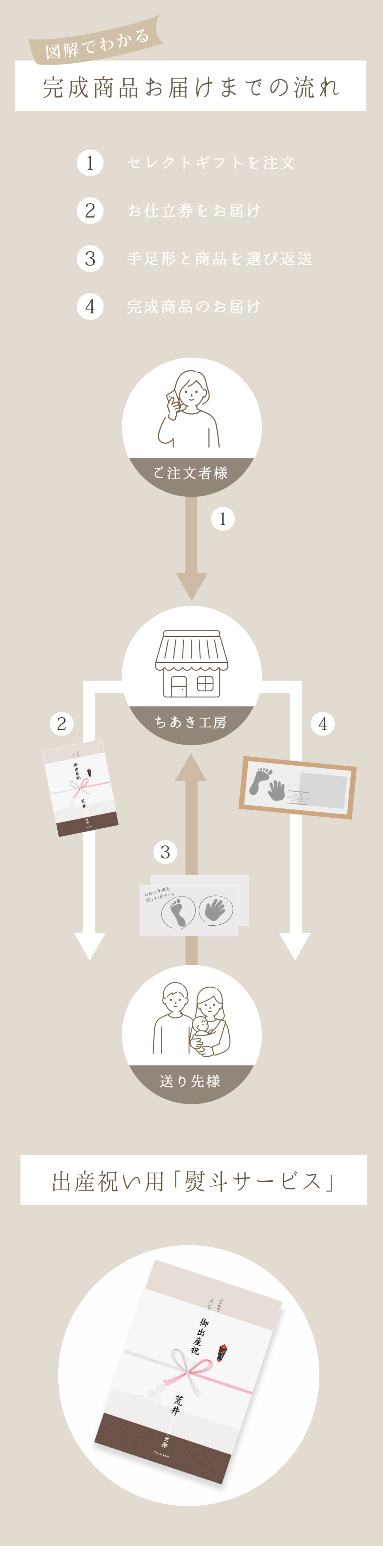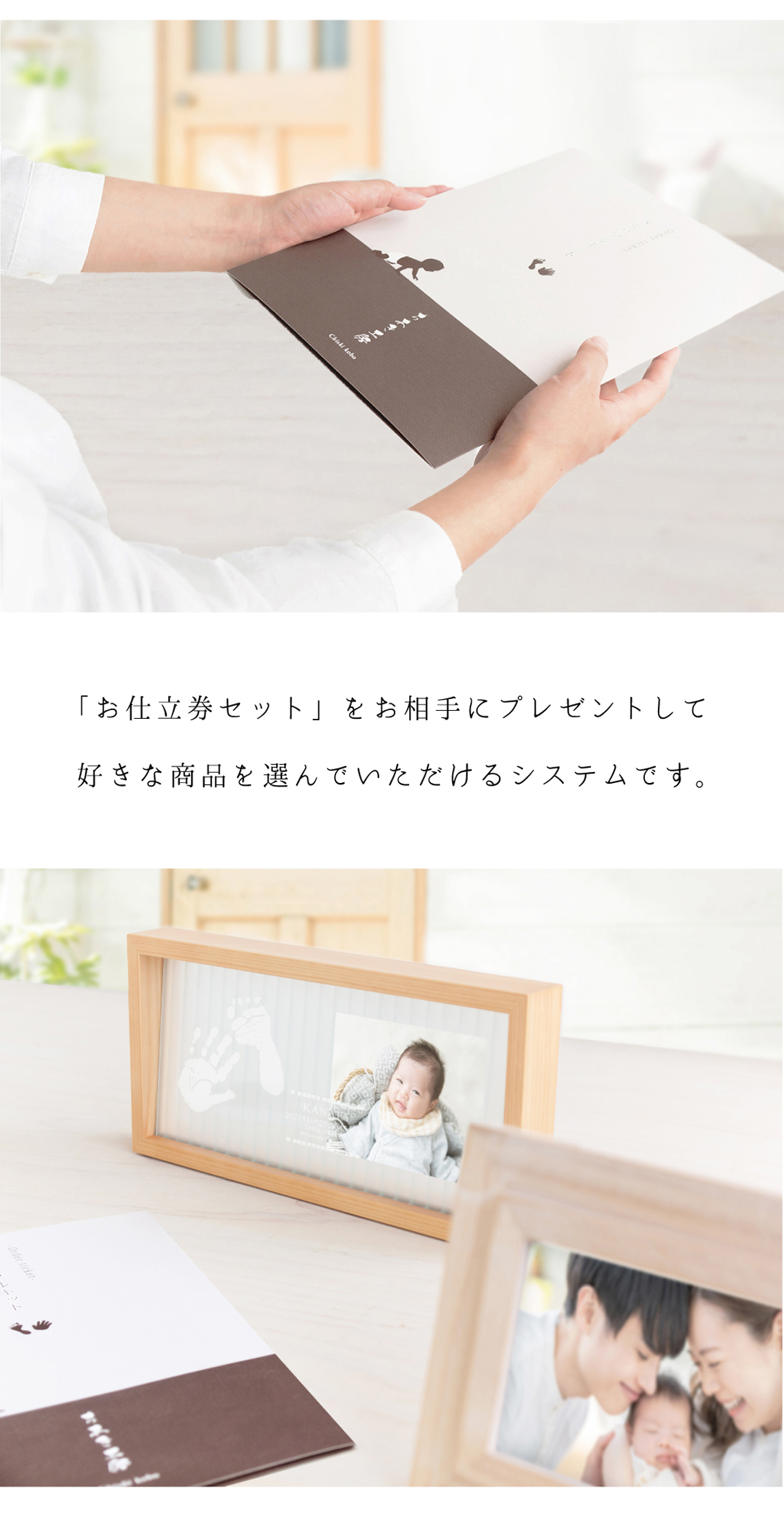 出産祝い用の「選べるメモリアルギフト券」です。ちあき工房の人気4商品からお好きなデザインを選べます。オーダーメイドが簡単に楽しめる便利なキットで、このままスマートに贈っていただけます。