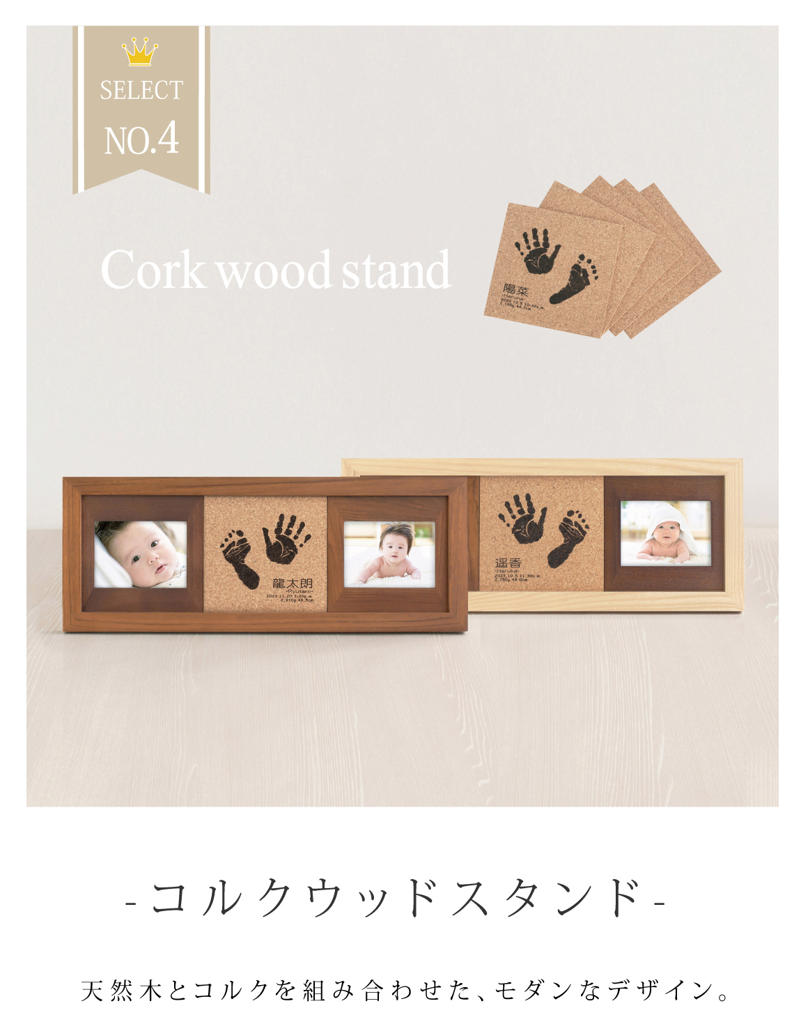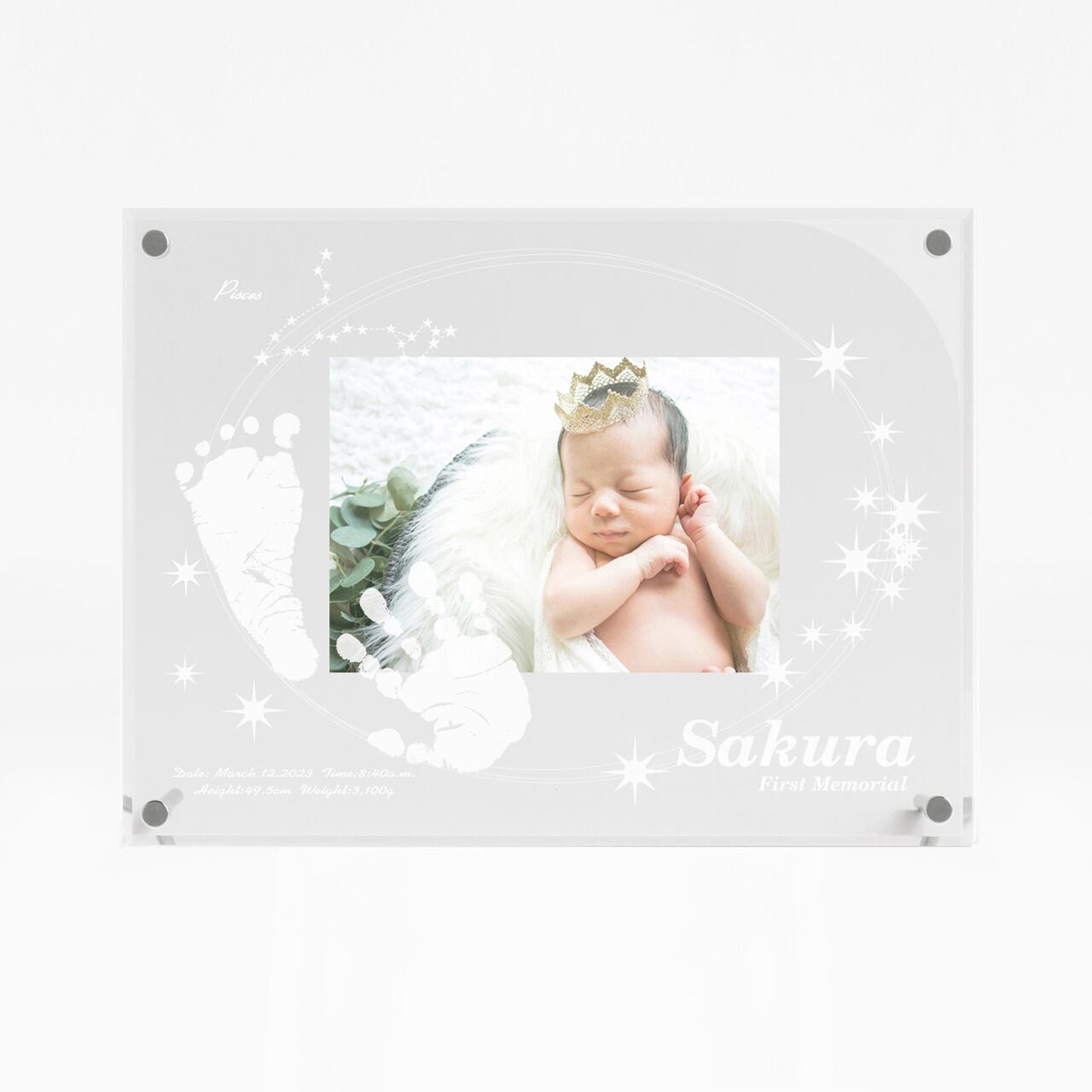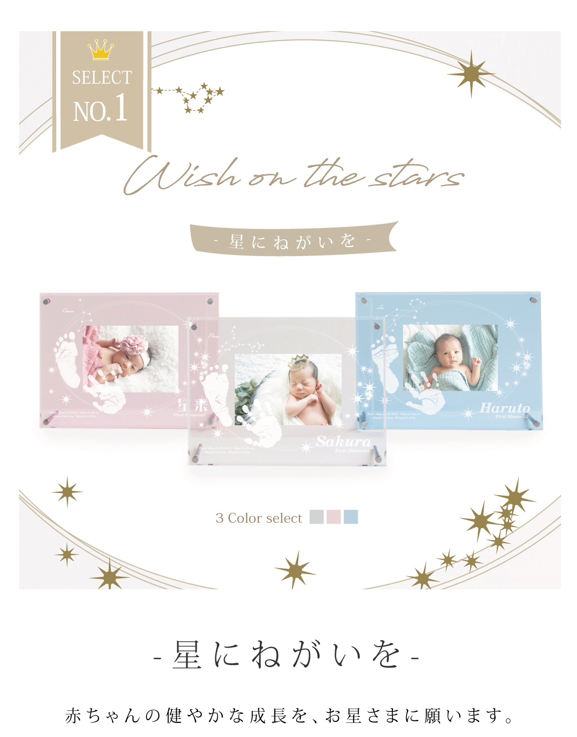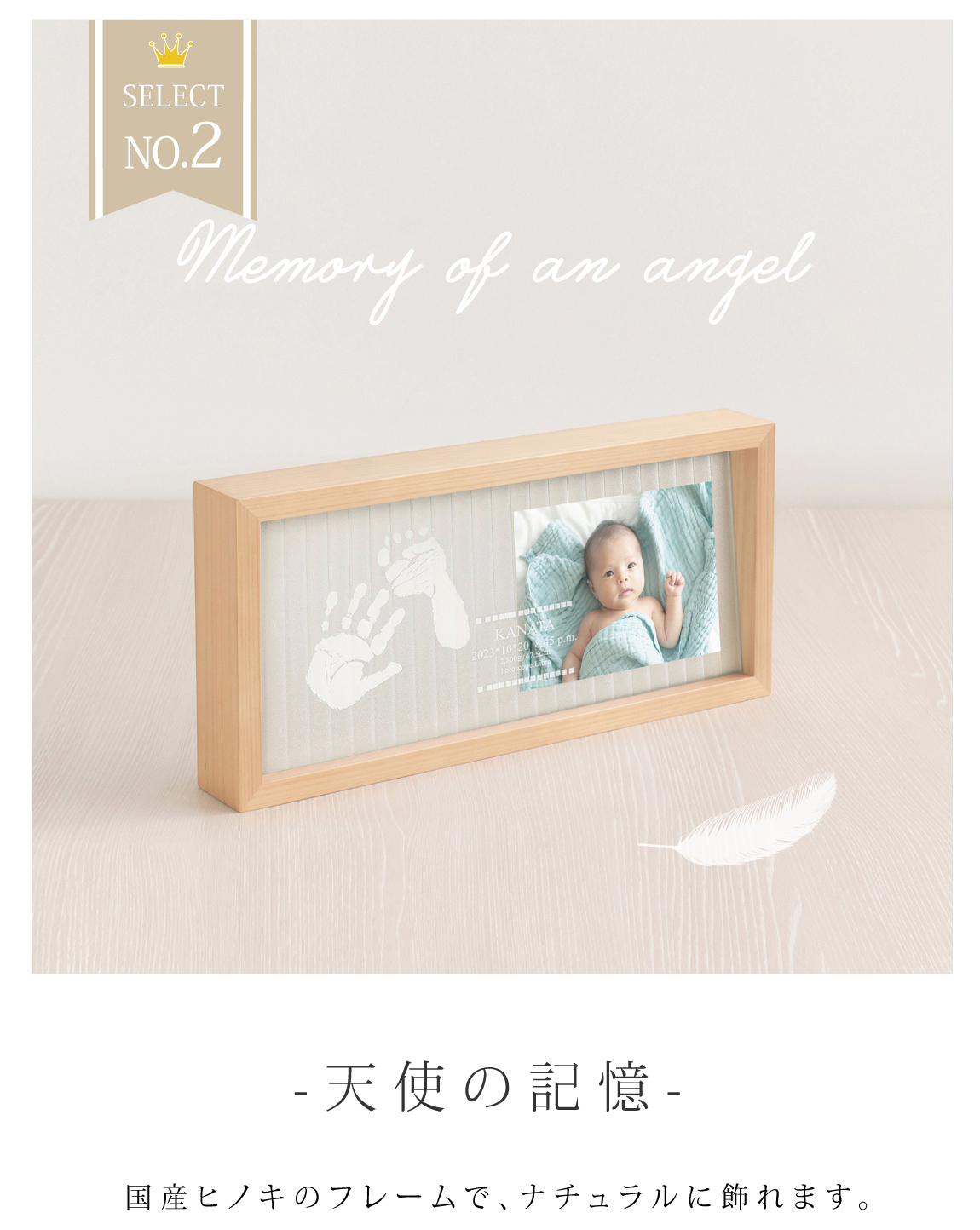 星にねがいをカラー:アクリル、天使の記憶:アクリル・ガラス・天然木(ヒノキ)、はじめましてメモリアルフレーム:アクリル・スチール(シルバーメッキ加工)、コルクウッドスタンド:天然木・コルク・ガラス