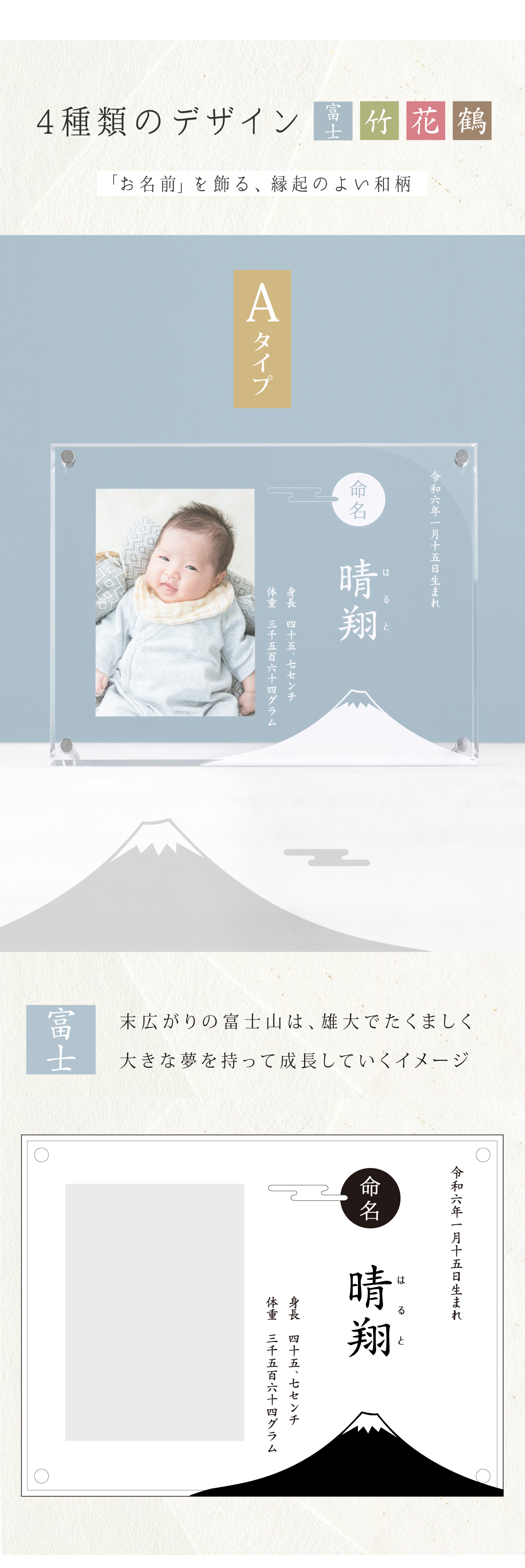 Aタイプ(富士山)・Bタイプ(竹)・Cタイプ(花)・Dタイプ(折り鶴)