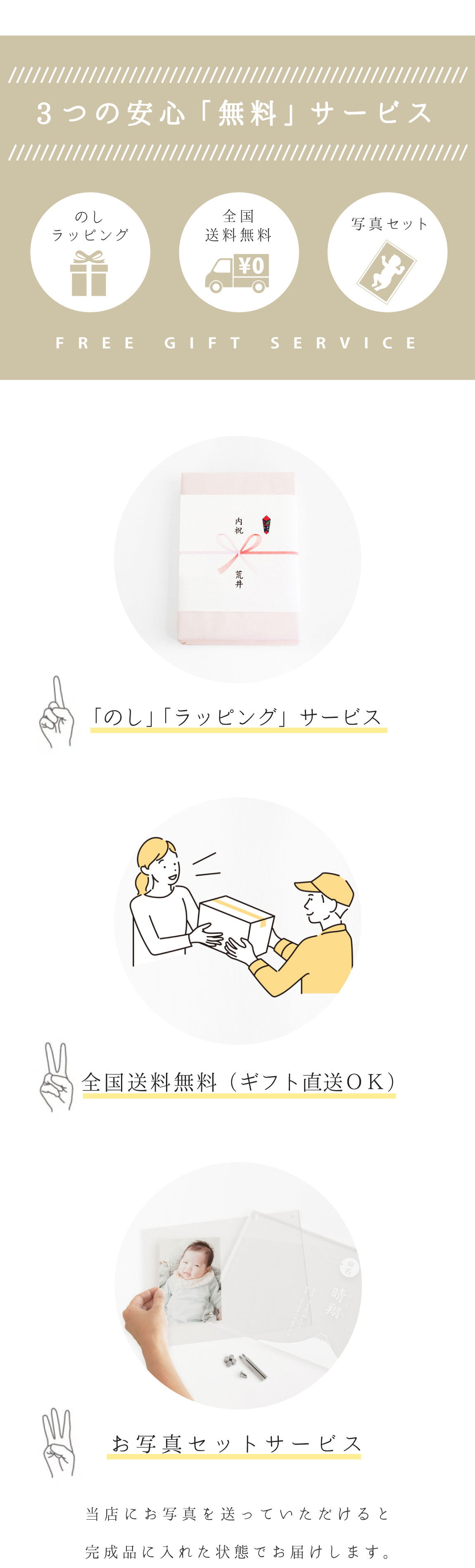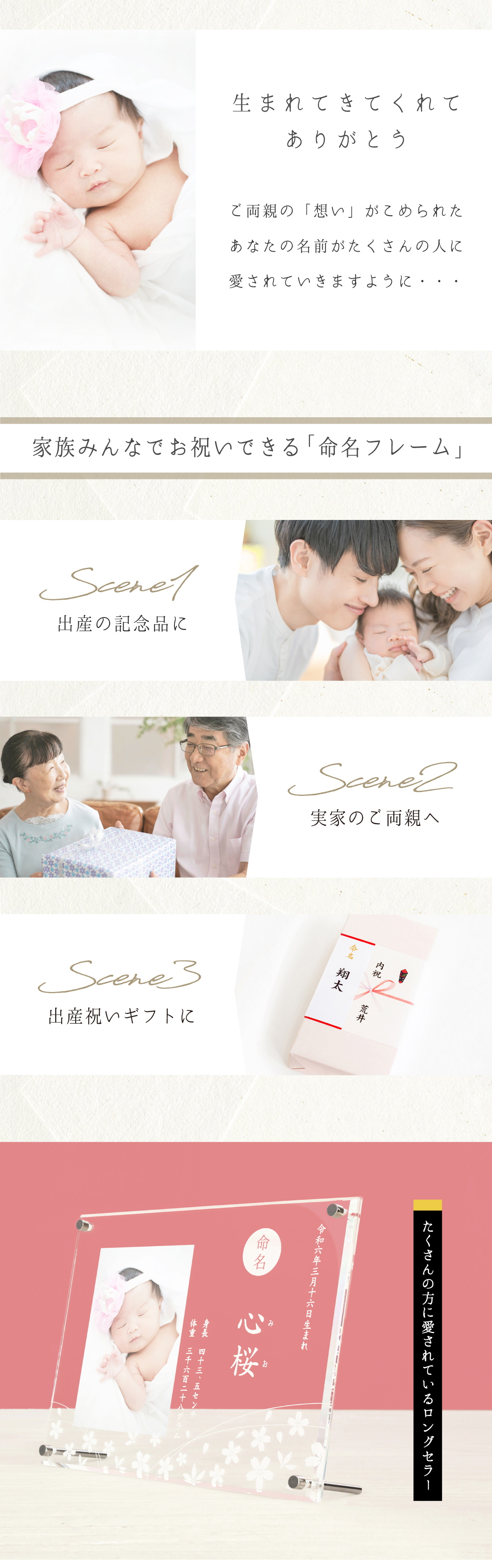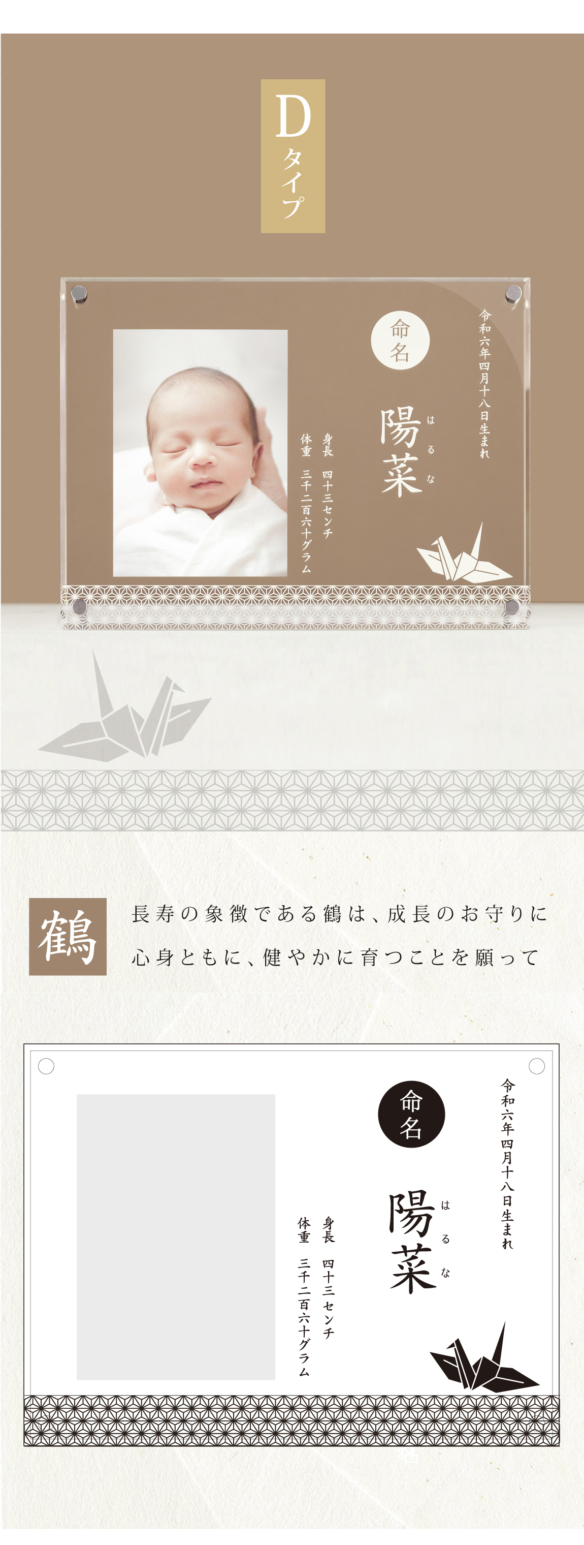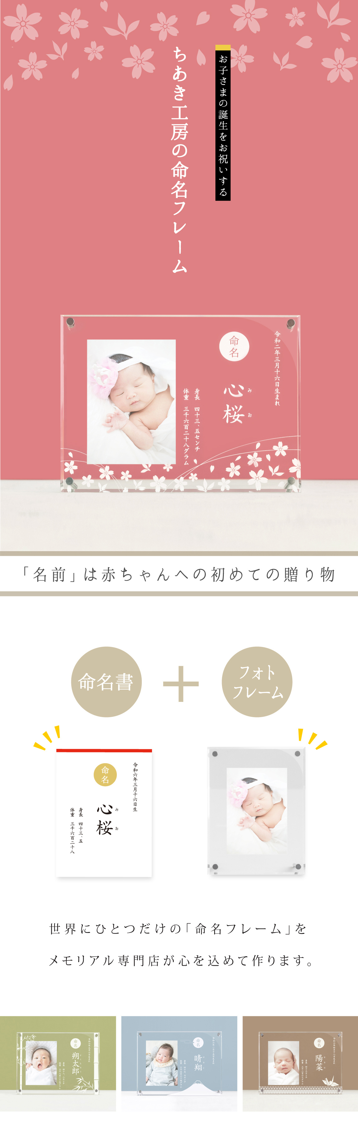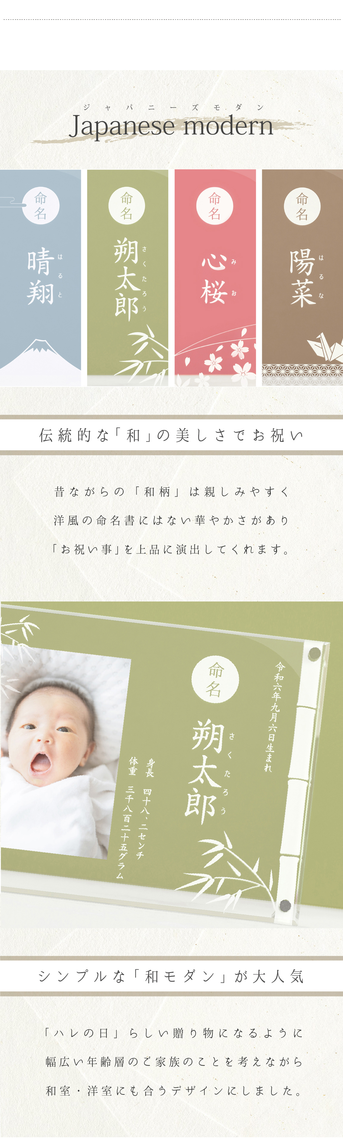 大切につけられた「お名前」がたくさんの人に愛されていきますように。そんな想いをこめてつくりました。ハレの日のふさわしい和風モダンなデザインで、年齢や性別を問わず、幅広く喜ばれています。