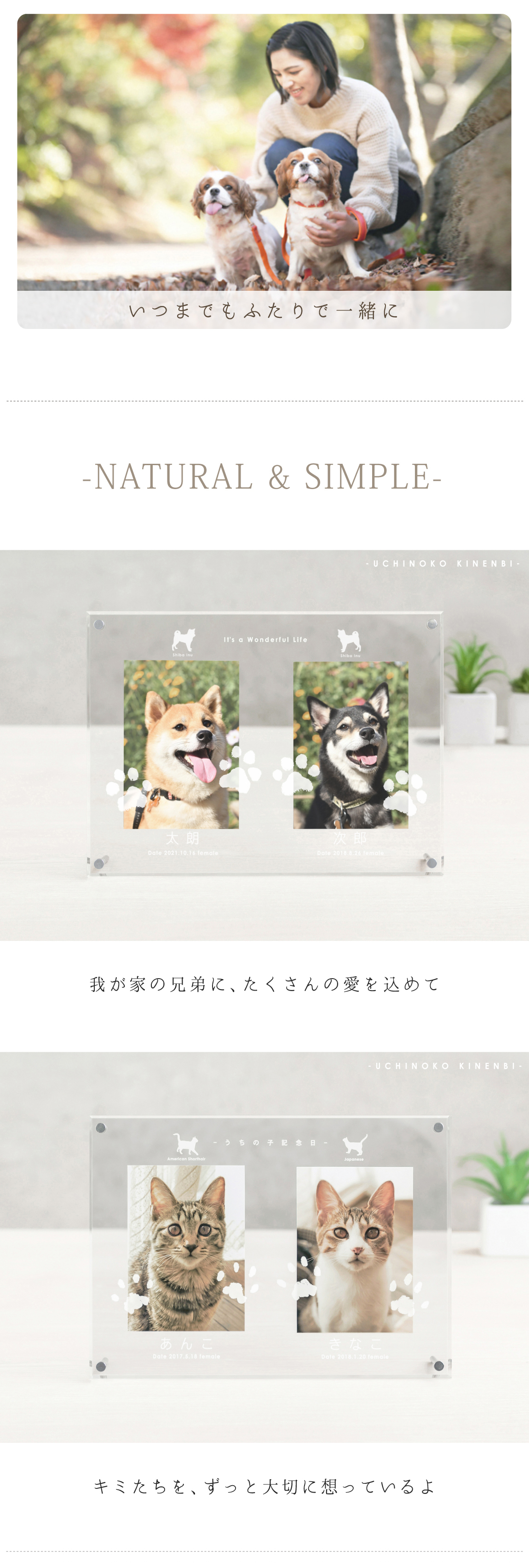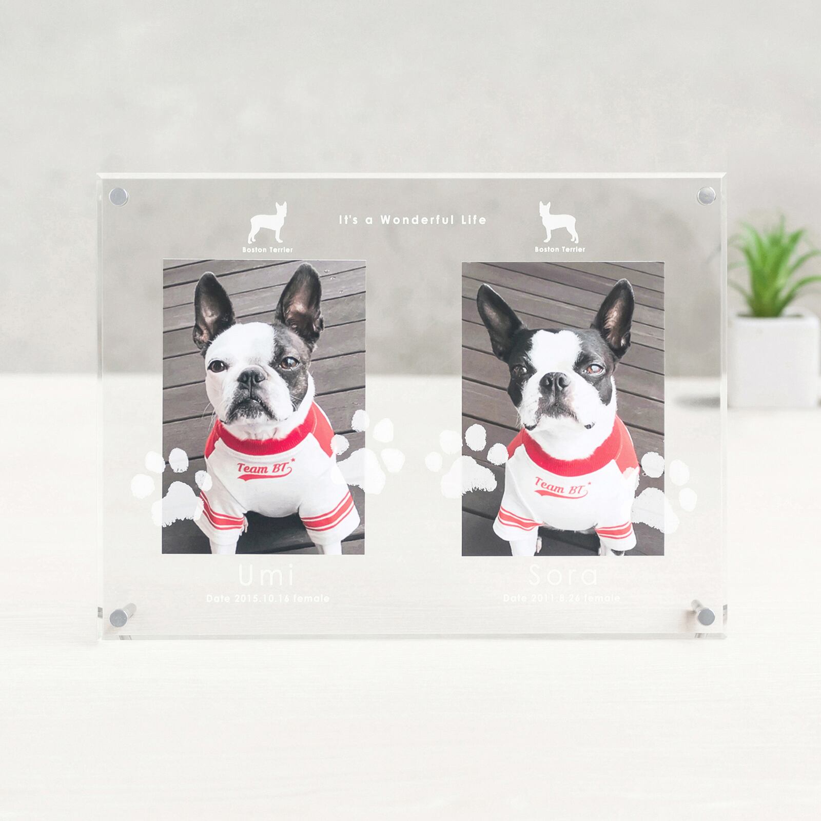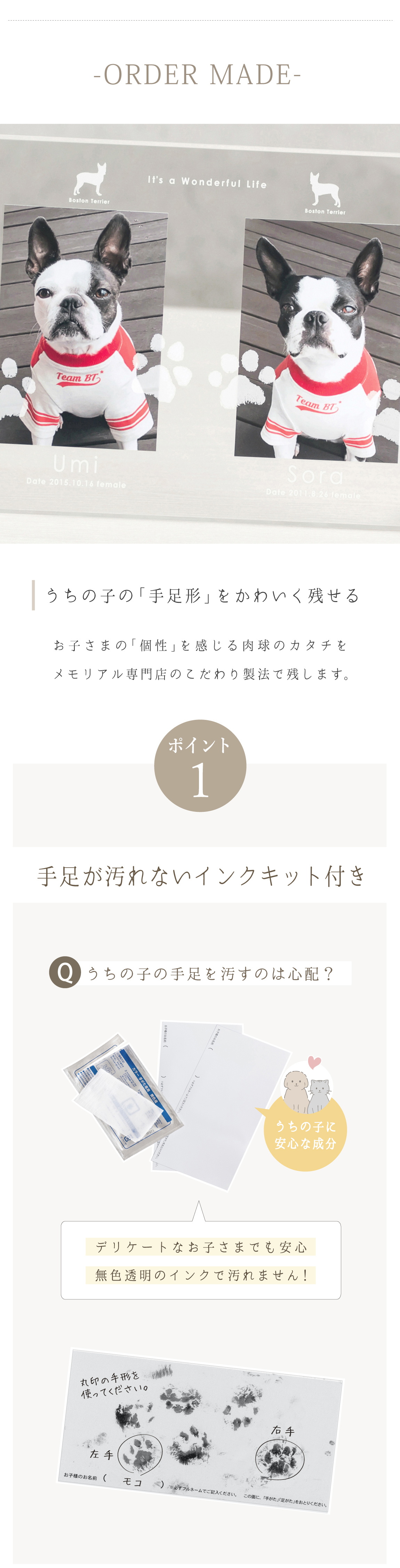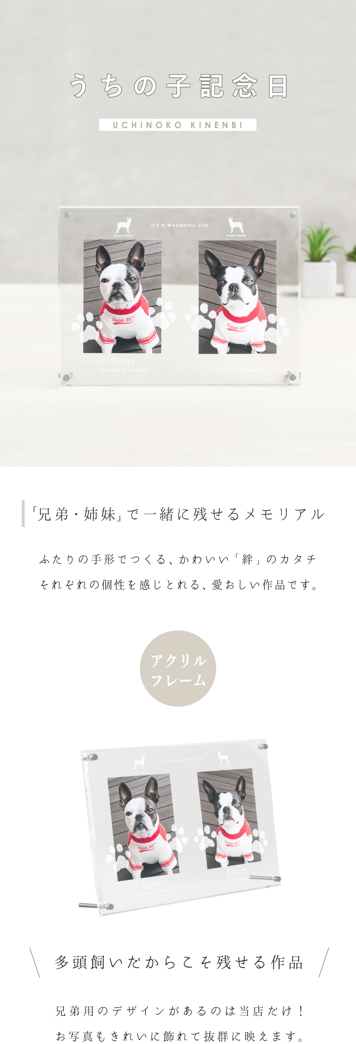 「多頭飼い用」のメモリアルです。兄弟・姉妹の手形を並べることで、それぞれの個性を感じる愛おしい作品になります。ふたりだけの「絆」のカタチを見つめるたび、ご家族の心が癒されますように。