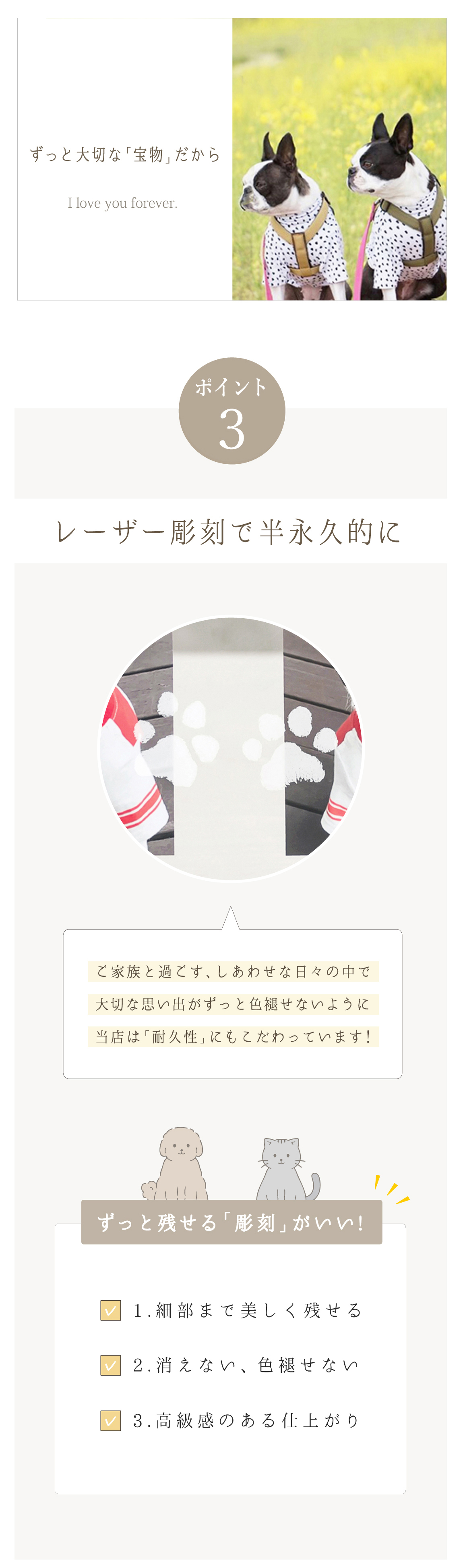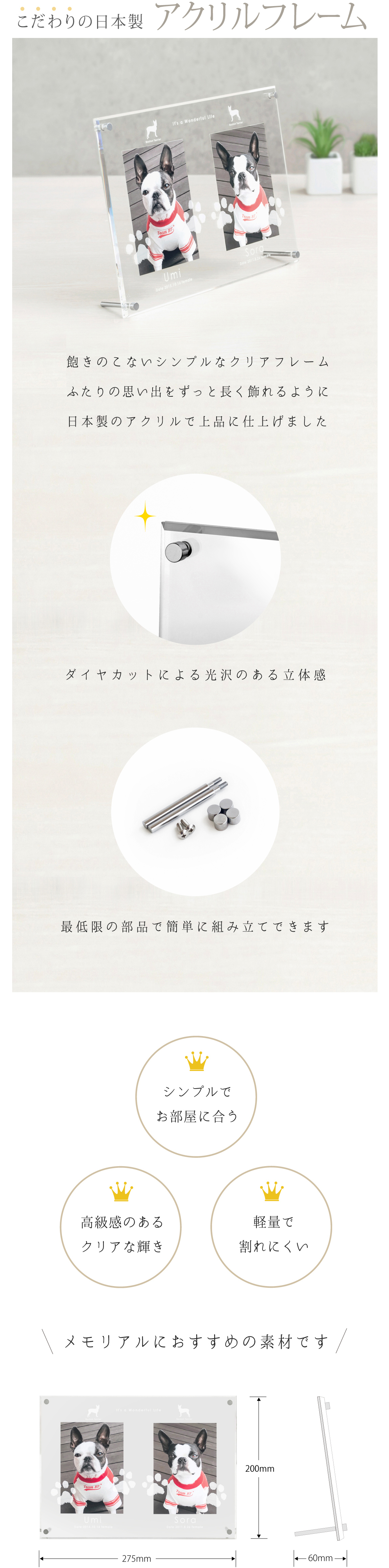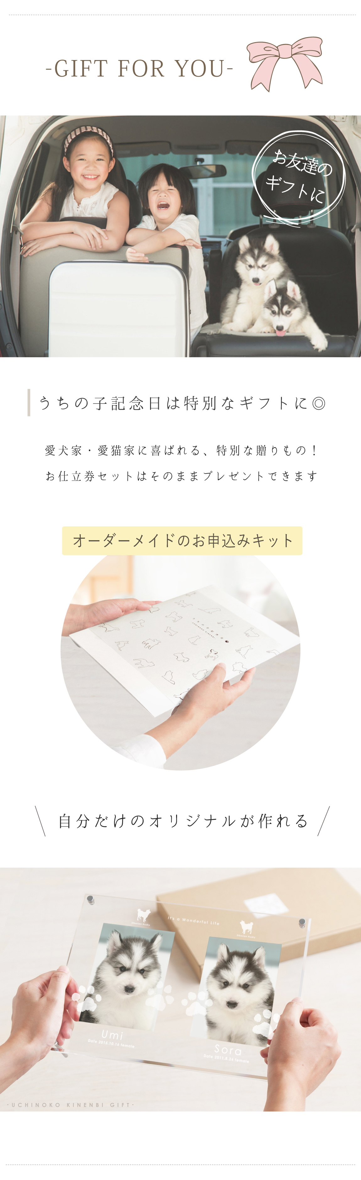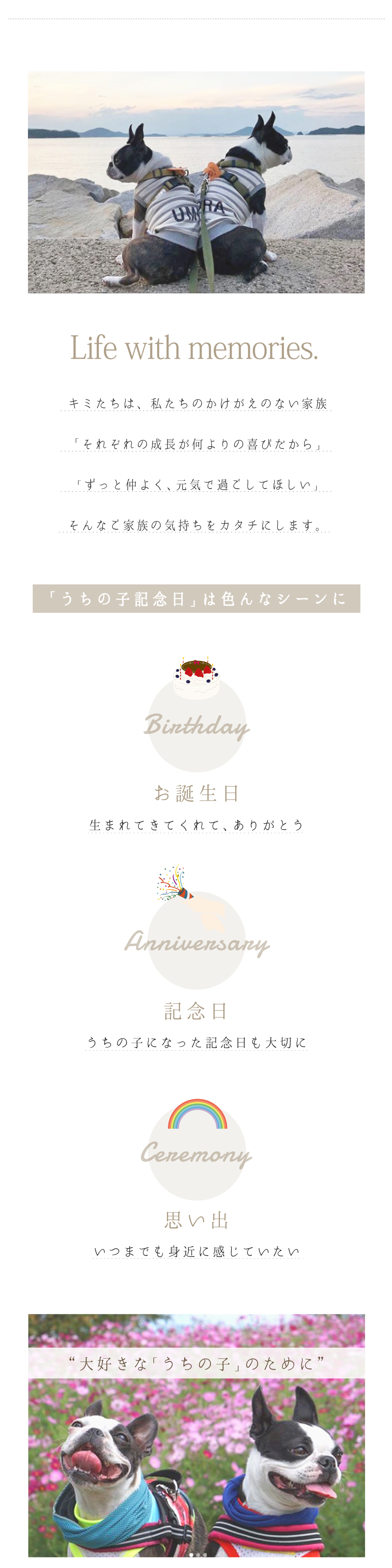「多頭飼い用」のメモリアルです。兄弟・姉妹の手形を並べることで、それぞれの個性を感じる愛おしい作品になります。ふたりだけの「絆」のカタチを見つめるたび、ご家族の心が癒されますように。