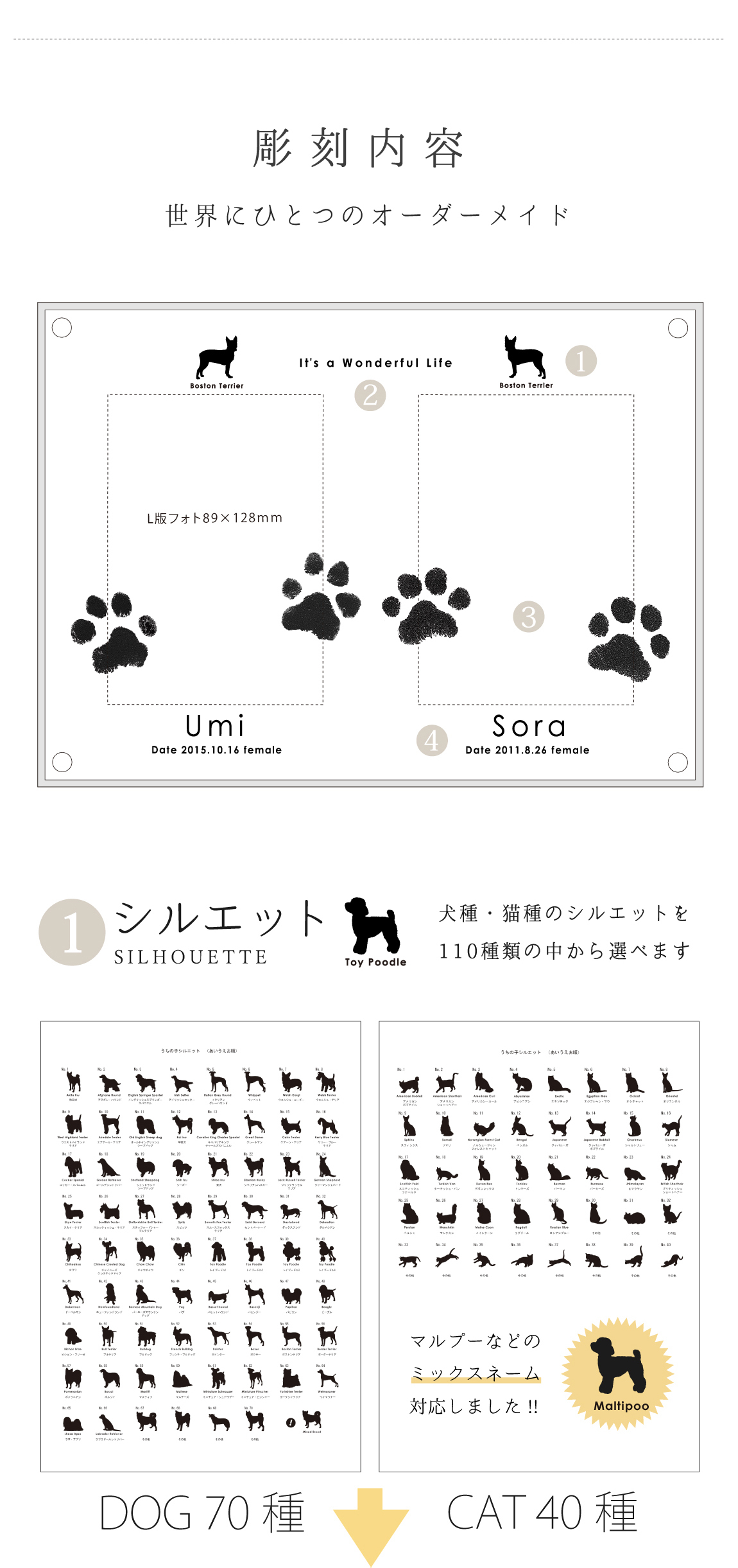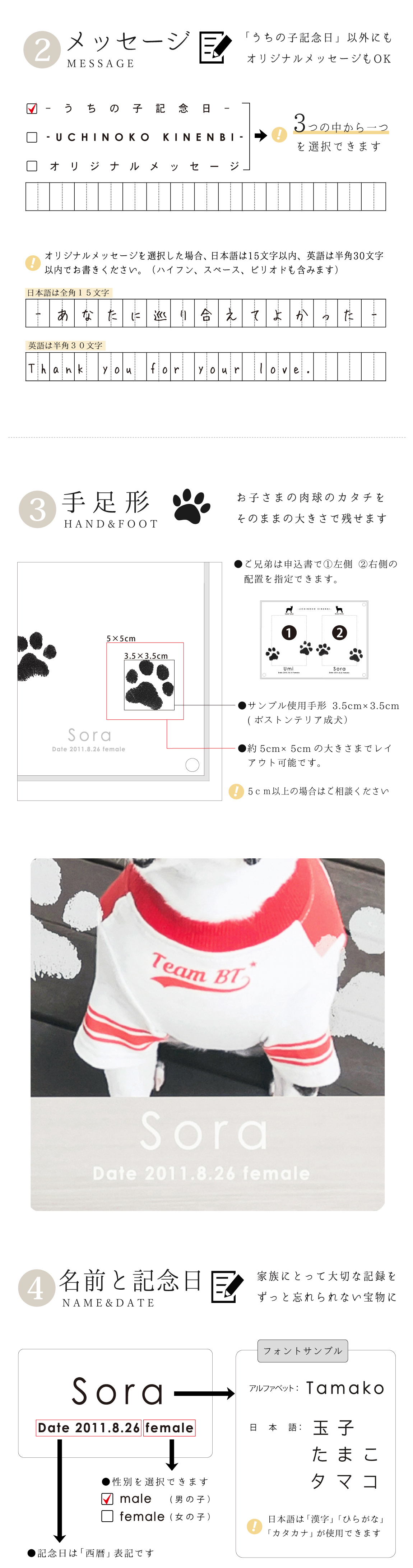 両手足形のうちいずれか2つ/お名前/記念日/性別/シルエット/メッセージ ※制作に関するご希望は、ご注文後にお送りする「お申込用紙」にご記入ください。
