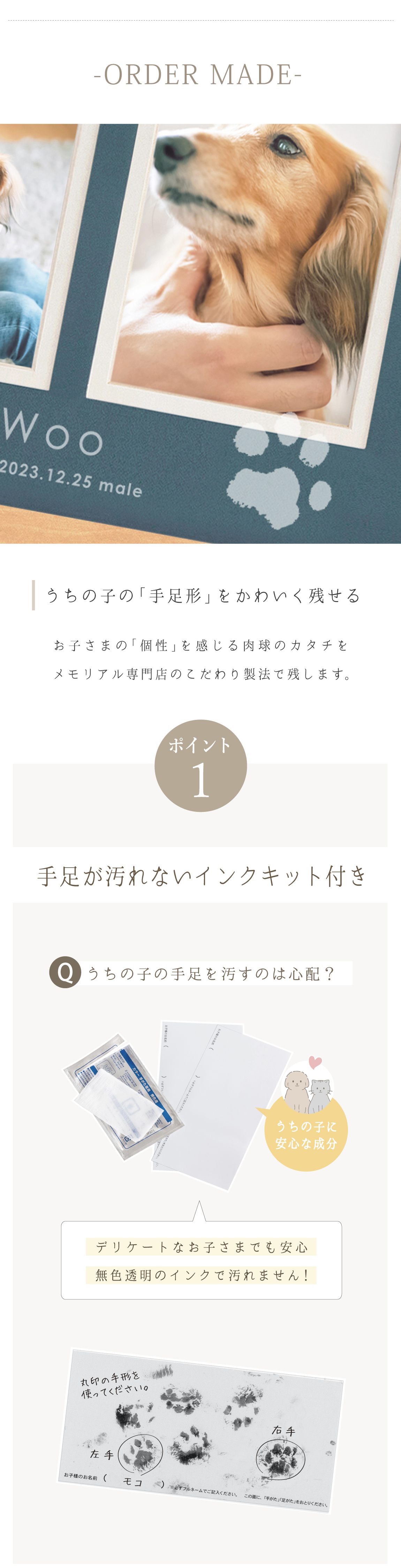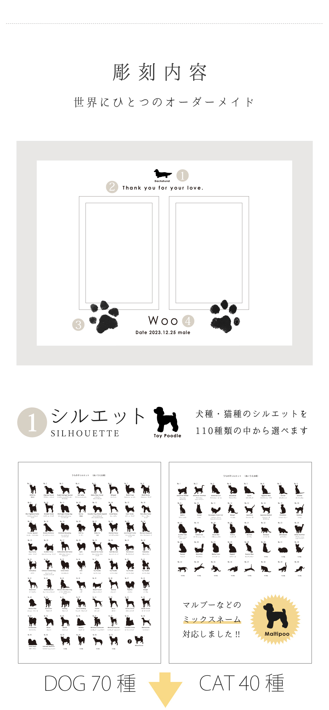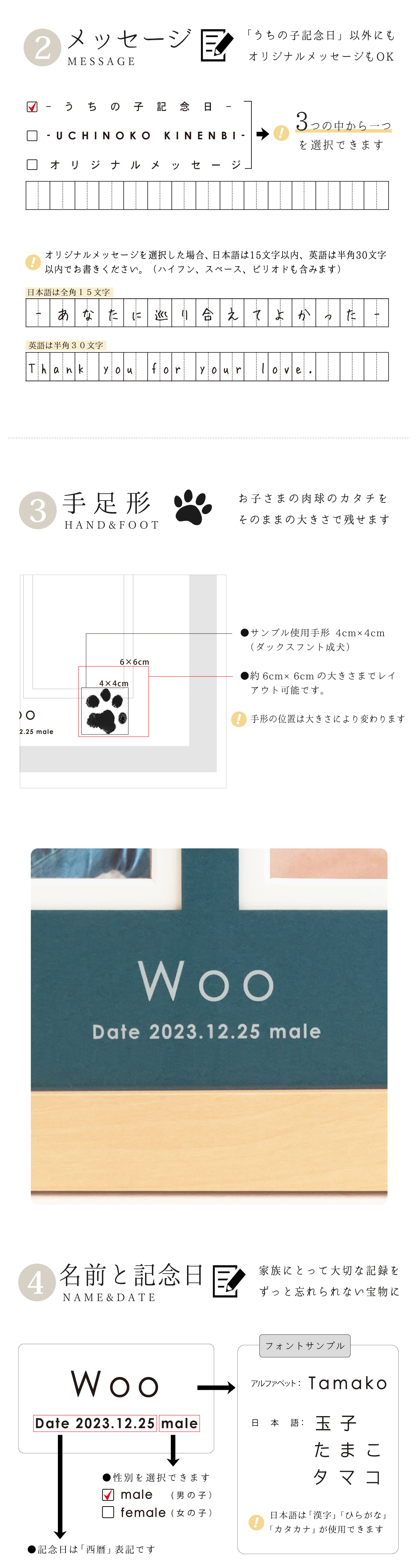 両手足形のうちいずれか2つ/お名前/記念日/性別/シルエット/メッセージ ※制作に関するご希望は、ご注文後にお送りする「お申込用紙」にご記入ください。