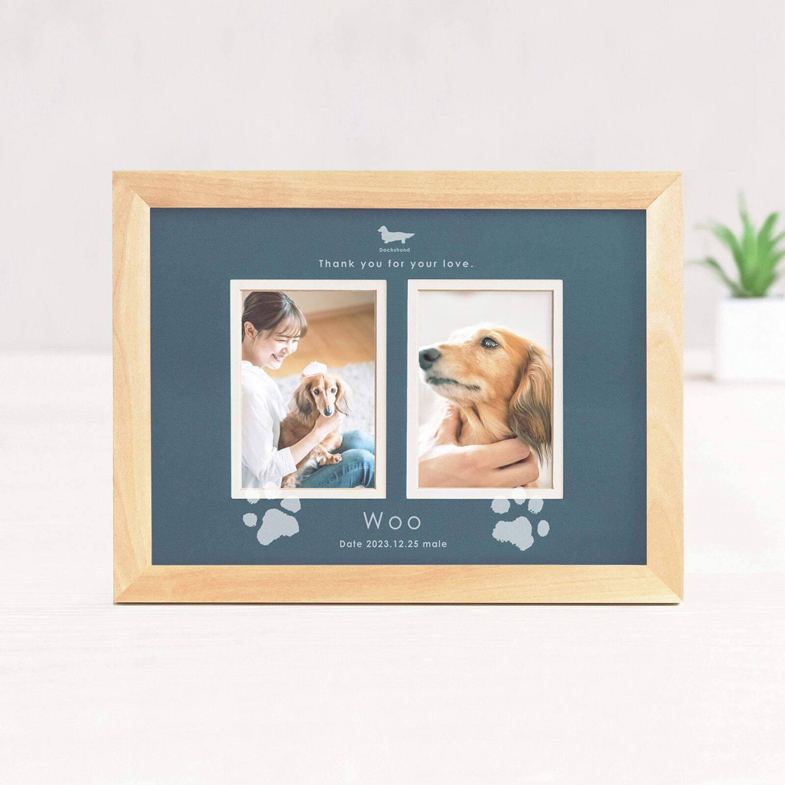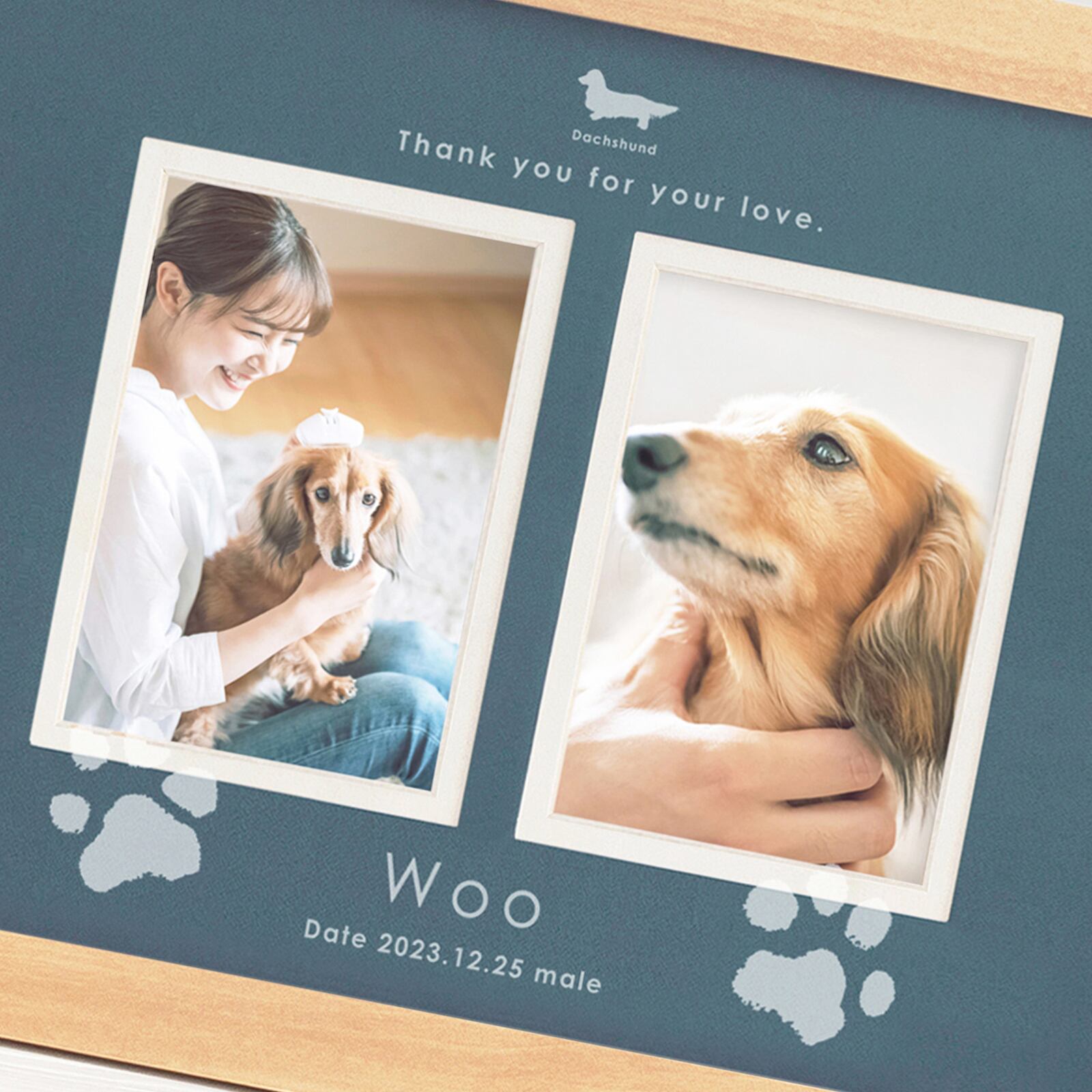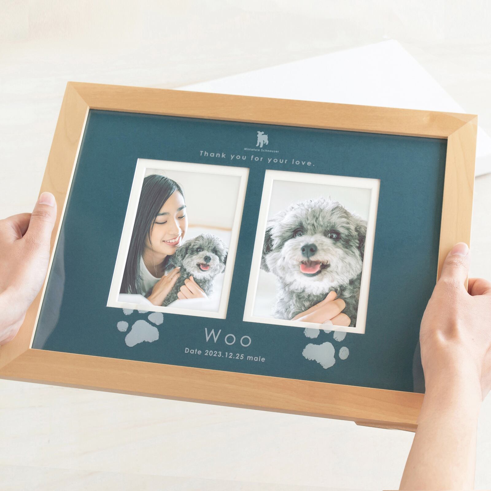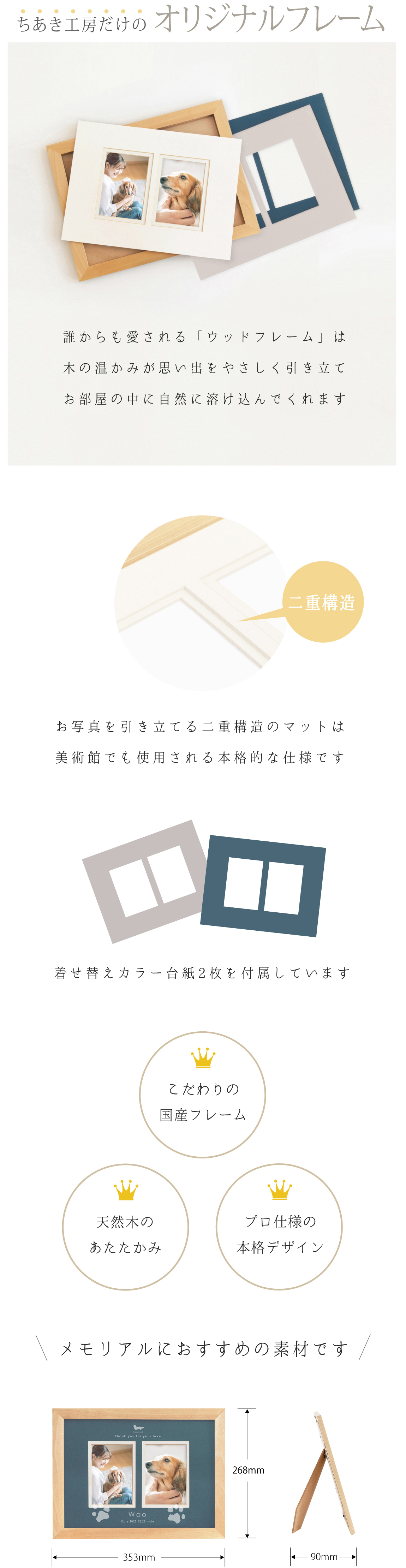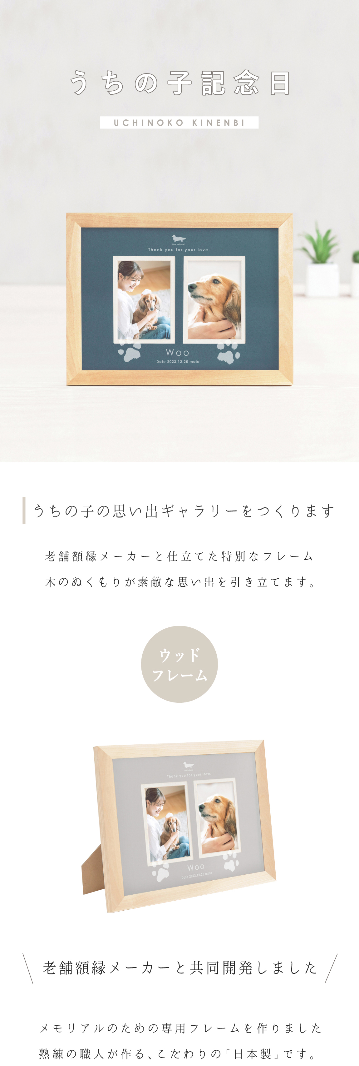 愛犬・愛猫のメモリアル。うちの子の愛おしい思い出を美しく飾れるウッドフォトフレームです。素材選びからすべて自社で監修し、ギャラリー展示用の額縁を手がけている老舗メーカーに特注した自信作です。