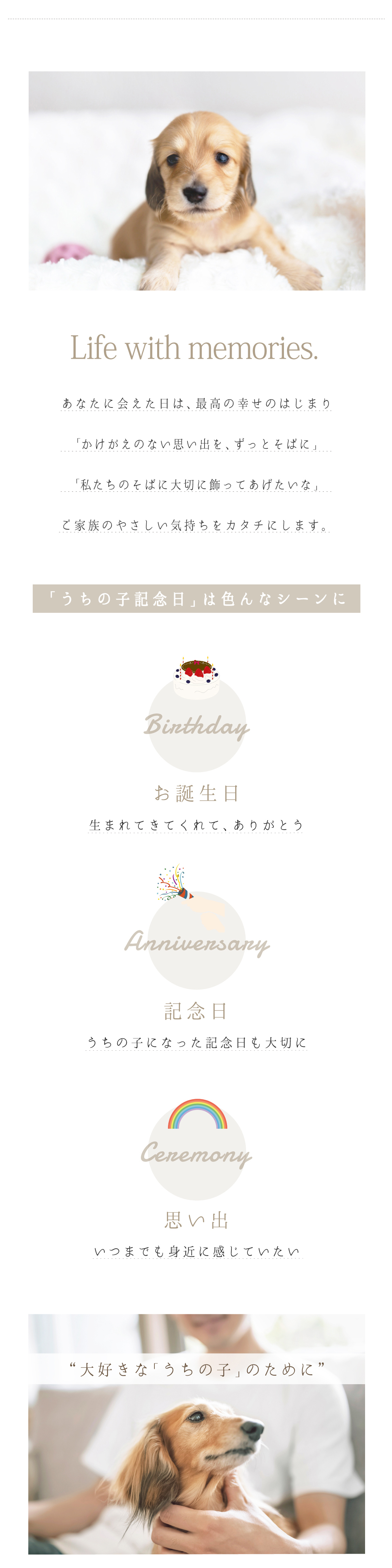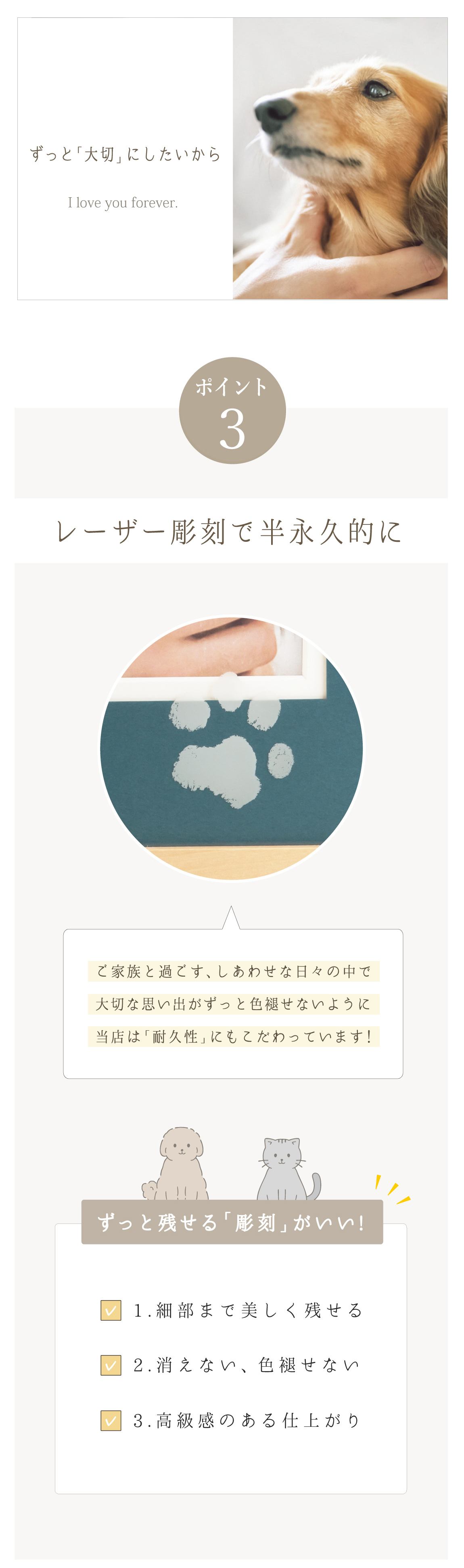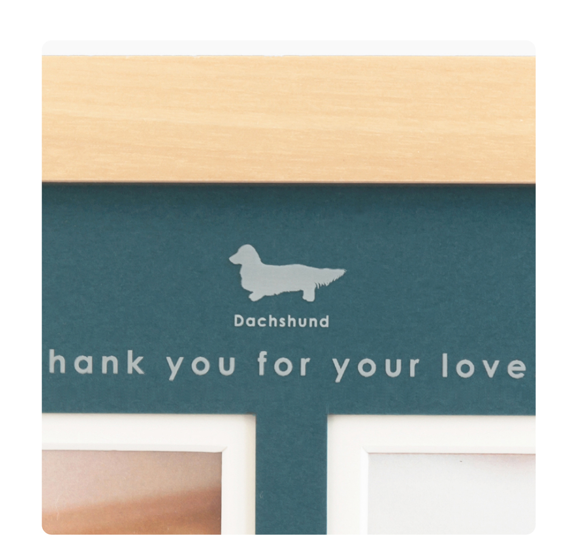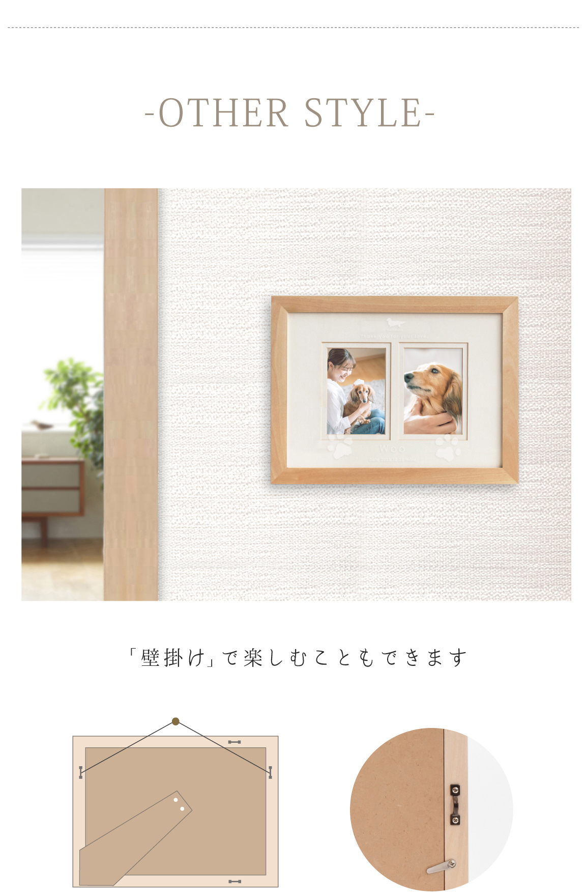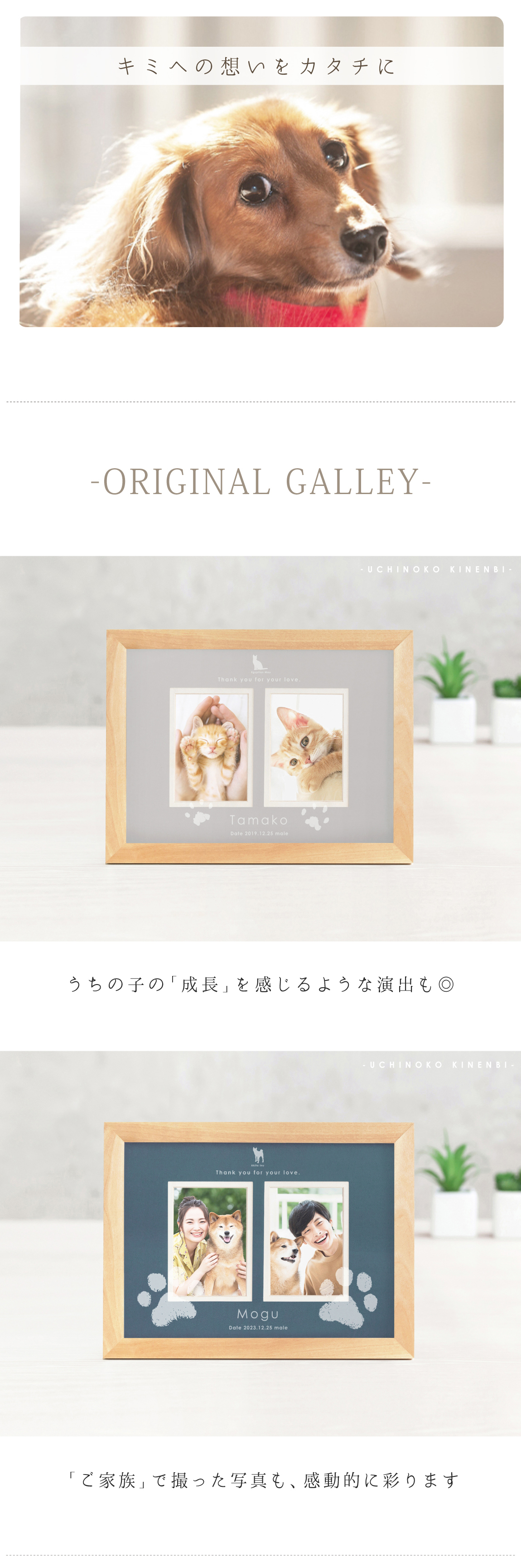 愛犬・愛猫のメモリアル。うちの子の愛おしい思い出を美しく飾れるウッドフォトフレームです。素材選びからすべて自社で監修し、ギャラリー展示用の額縁を手がけている老舗メーカーに特注した自信作です。