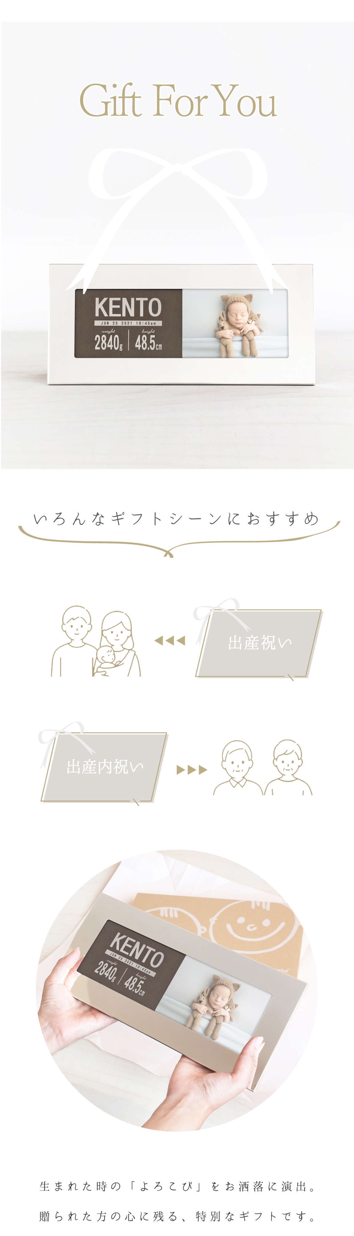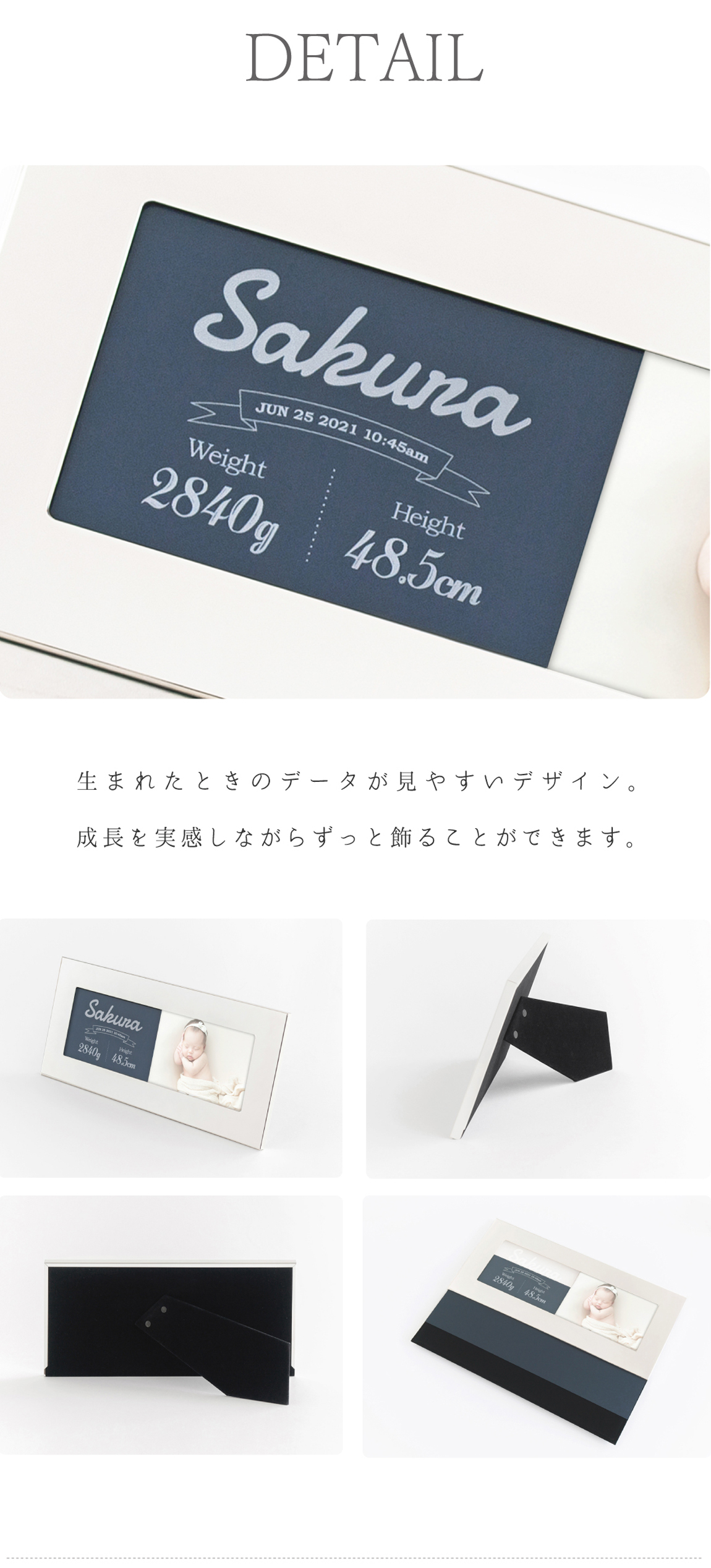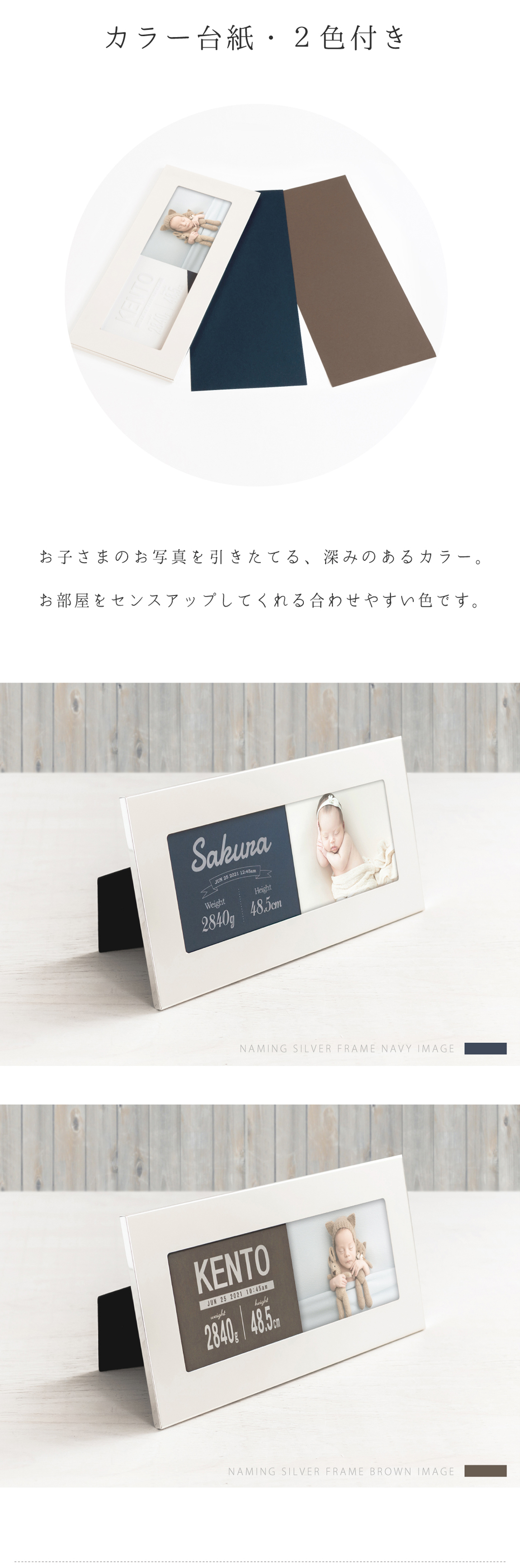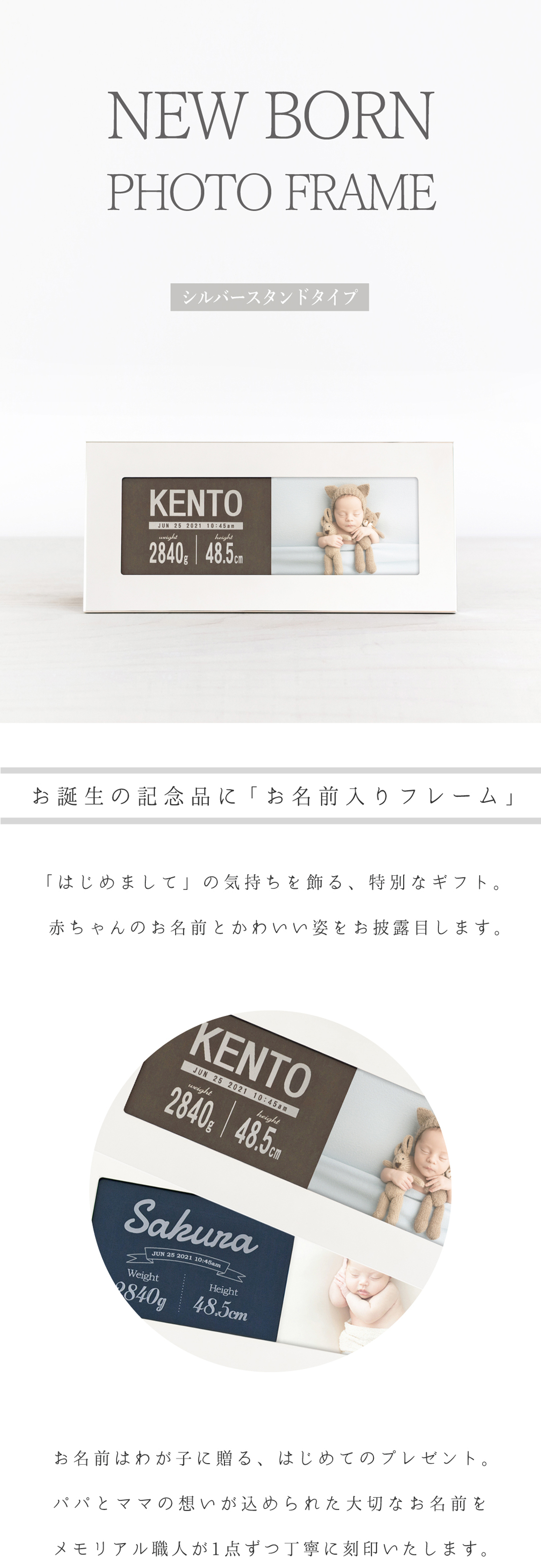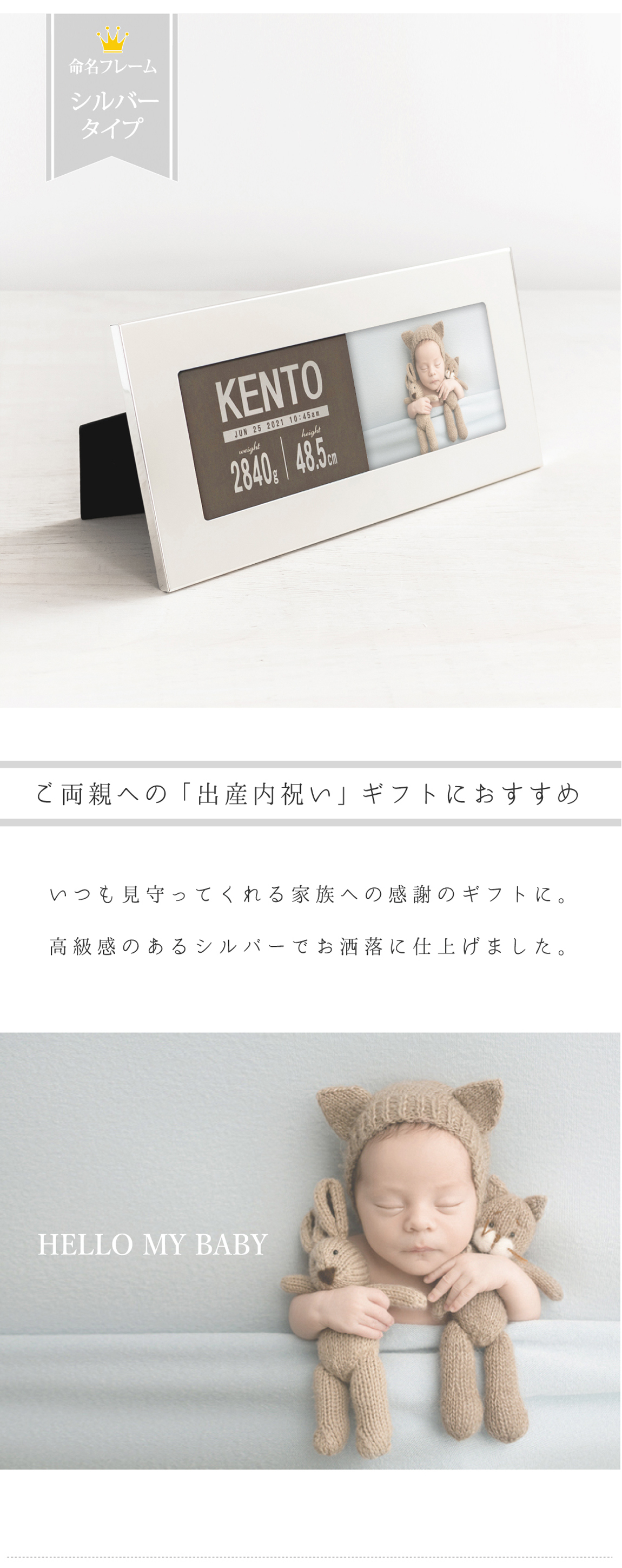 赤ちゃんの思い出を上品に飾れるシルバーフレーム。お子さまの名前を入れることで、より特別感が増すギフトに。シンプルでありながらスタイリッシュなデザインは、華やか過ぎずインテリアにもお洒落にマッチします。