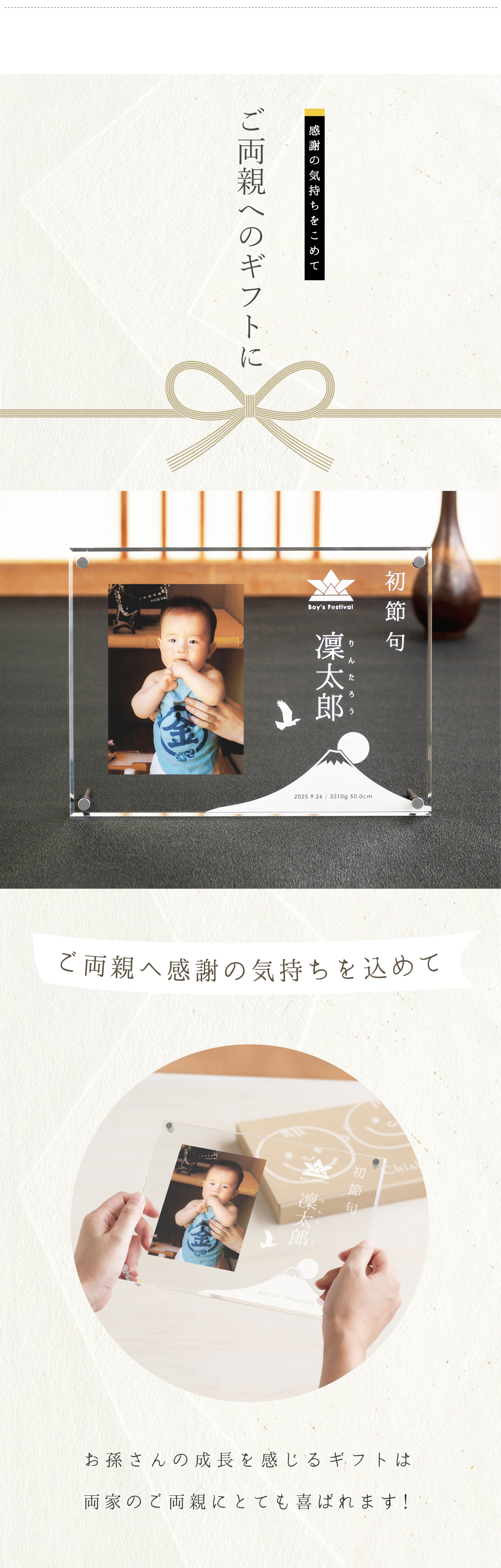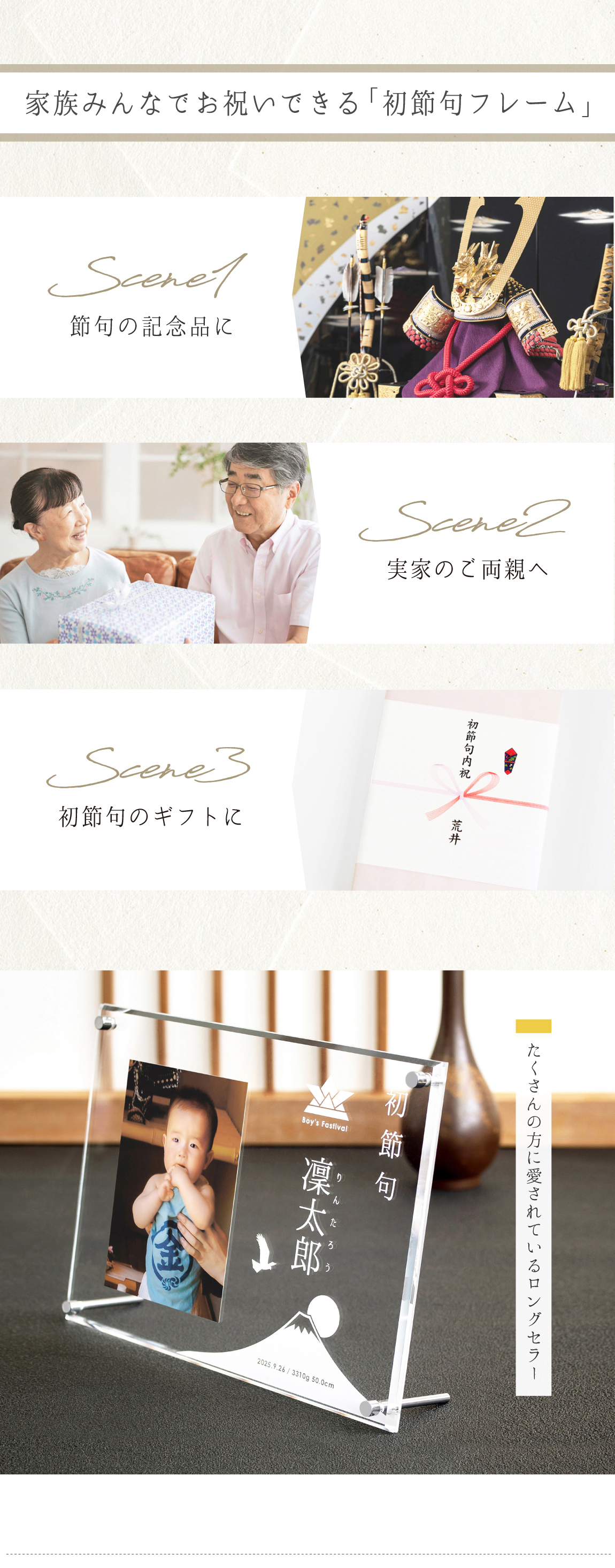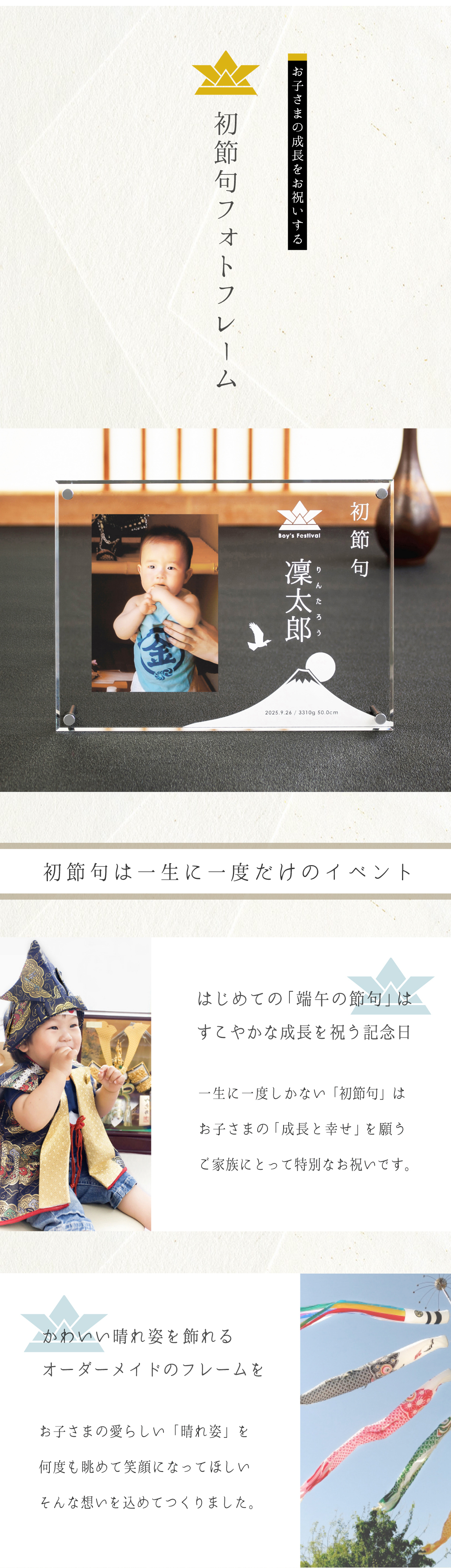 初節句は「一生に一度だけでのイベント」です。お子さまの成長と幸せを願って、かわいい晴れ姿を飾れるフォトフレームをつくりました。祝福してくれたご家族へのギフトとして大変喜ばれています。
